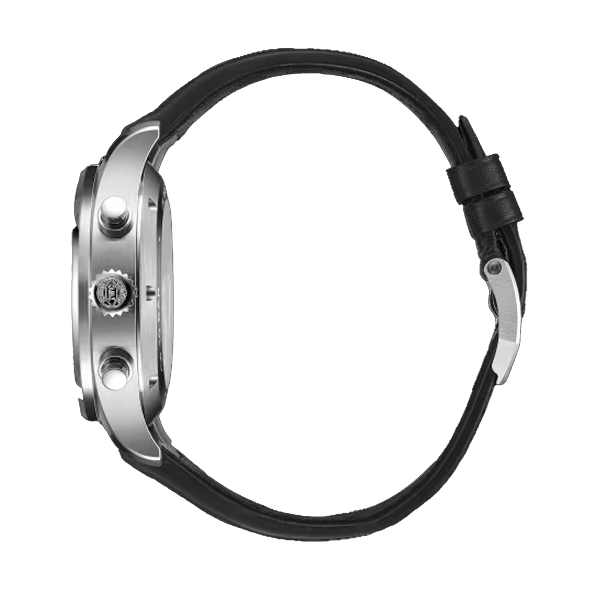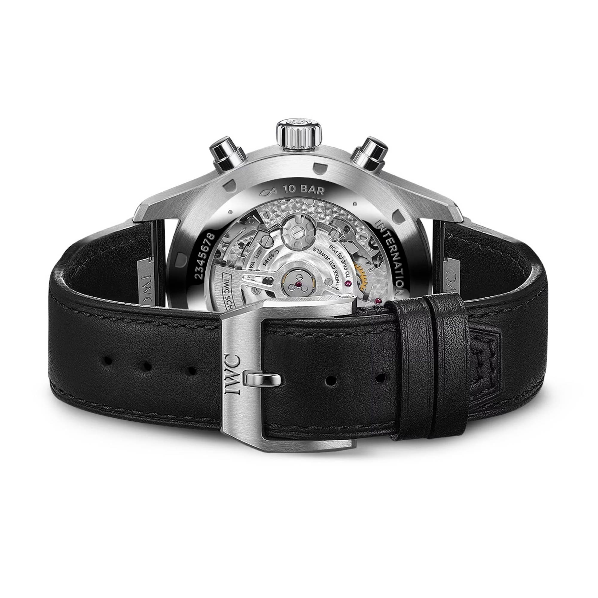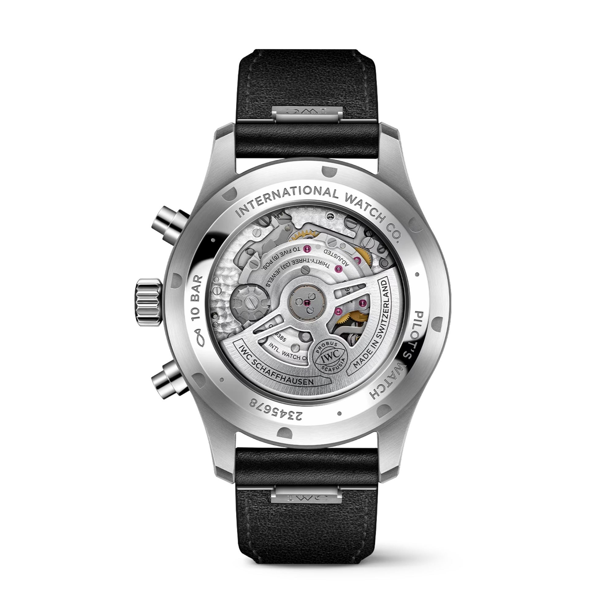 The Pilot's Watch Chronograph is the epitome of a versatile sports watch and a distinguished companion in all walks of life. Chronographs have formed an integral part of IWC Schaffhausen’s Pilot’s Watches collection since 1994. This Pilot’s Watch Chronograph features a stainless steel case with a diameter of 43 millimetres, a black dial, and rhodium-plated hands. The high-contrast dial with large Arabic numerals and the triangle index marker at 12 o’clock has been designed in the style of an easy-to-read cockpit instrument. Thanks to luminescent elements, the time can be read at a glance, even at night, or in difficult visibility conditions. The IWC-manufactured 69385 caliber, a precise and robust chronograph movement in classic column-wheel design, enables measurement of stop or aggregate times of up to 12 hours. The hours are displayed on a counter at 9 o’clock, the minutes at 12 o’clock. The small second features a red hand and is located at 6 o’clock. The self-winding movement with a power reserve of 46 hours is visible through the sapphire glass back. Water-resistant to 10 bar, the chronograph is fitted on a black calfskin strap with a pin buckle. Thanks to the integrated EasX-CHANGE® system, the strap can be easily changed without needing any additional tools.