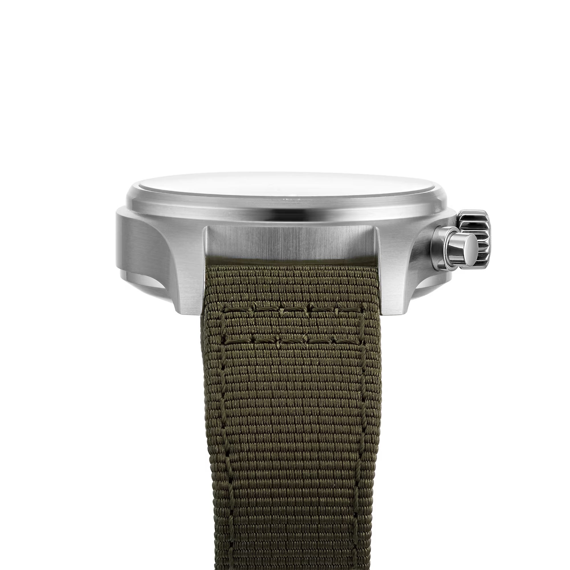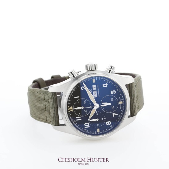 For the first time ever, IWC presents a Pilot's Chronograph with a movement from 69000-calibre family; the IWC manufactured 69380 is a rugged chronograph movement with a classic colum wheel design. This IWC Pilot's Mens Watch IW387901 features a reduced case size of 41mm. A black dial displays stopped hours and minutes in two subdials at 9 and 12 o'clock. The bidirectional winding system builds up a power reserve of 46 hours. Presented on a green textile strap, this timepieces colours are inspired by the Spitfire's cockpit.