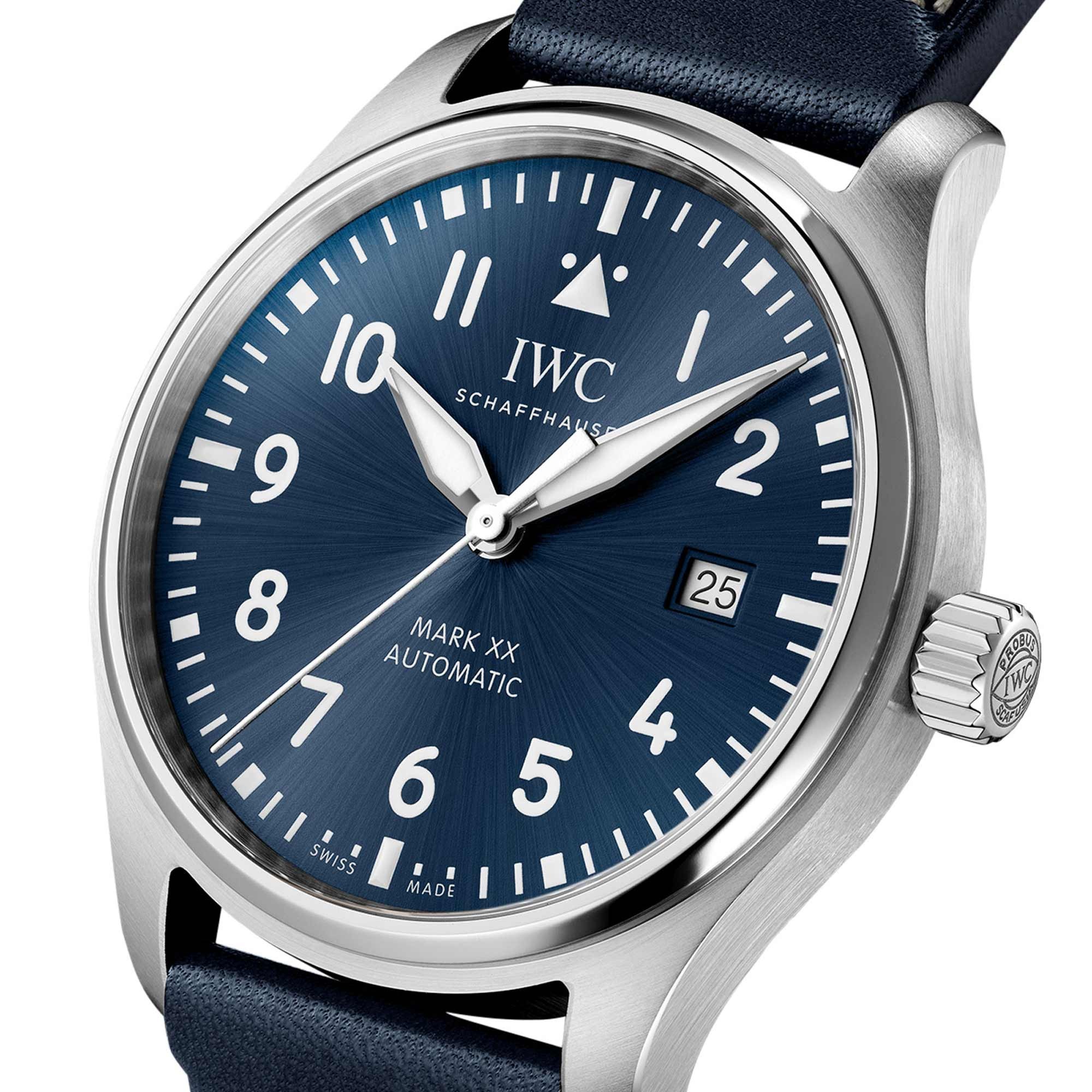 The Pilot’s Watch Mark XX captivates with its utilitarian tool watch design and the IWC-manufactured 32111 calibre. Less is more: the Mark XX reduces the design and technical functionality of a pilot's watch to its pure essence. It is the successor to the legendary Mark 11, a precise amagnetic instrument watch IWC developed in 1948 for the navigators and pilots of the British Royal Air Force. This version features a robust and corrosion-resistant stainless steel case with a diameter of 40 millimetres, a blue dial, and rhodium-plated hands. The high-contrast dial with white numerals and indices, the triangular index at 12 o'clock, and luminous elements ensure easy readability in all lighting conditions. Precision is ensured by the IWC-manufactured 32111 caliber with automatic winding and a power reserve of 120 hours. The front glass is specially secured so that it cannot detach from its place even in the event of a sudden pressure drop. The Pilot's Watch Mark XX is water-resistant to 10 bar and is fitted on a blue calfskin strap with a pin buckle. Thanks to the integrated EasX-CHANGE® system, the strap can be easily exchanged for another without additional tools.