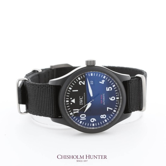 Launched in 2012, the TOP GUN collection with its black ceramic cases has confirmed itself as an independent line in the IWC Pilot's watch family. Twisting manoeuvres with supersonic jets like the F/A-18 Hornet, and missions lasting months on an aircraft carrier: the demands placed on personnel and materials by naval aviation are incredibly high. TOP GUN watches are manufactured using robust, corrosion-resistant materials, such as ceramic and titanium, specifically for the unusual needs of the US Navy's flying crews. This IWC Pilot's TOP GUN Mens Watch IW326901 features a 41mm case with with a dial that is reduced to the bare essentials, with striking luminescent white hand and numerals that stand out against the matte black background, applied Arabic numerals and a date window at 3 o'clock. Powered by an automatic movement, equipped with the IWC-manufactured 32110 calibre, this timepiece is also water resistant up to 60 metres.