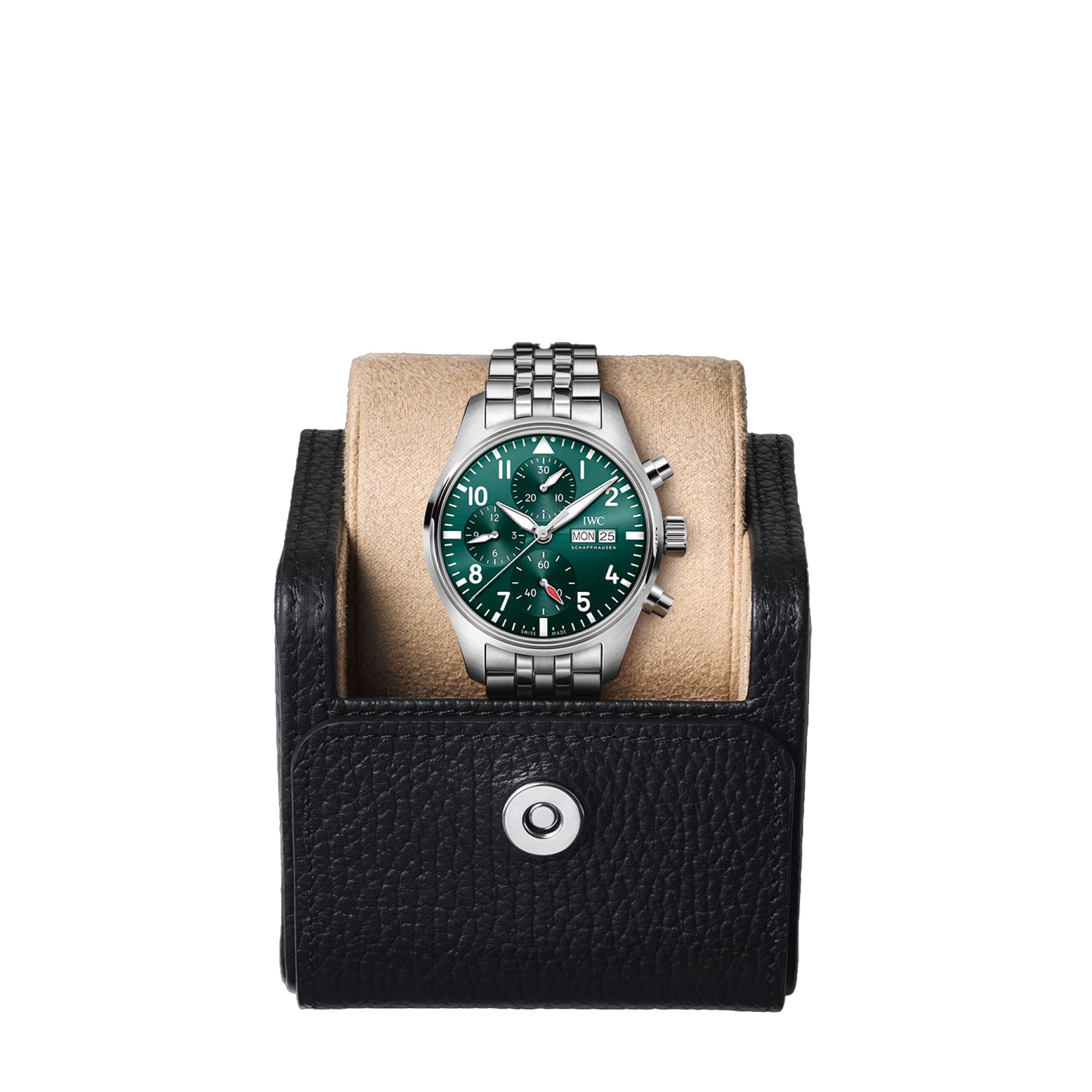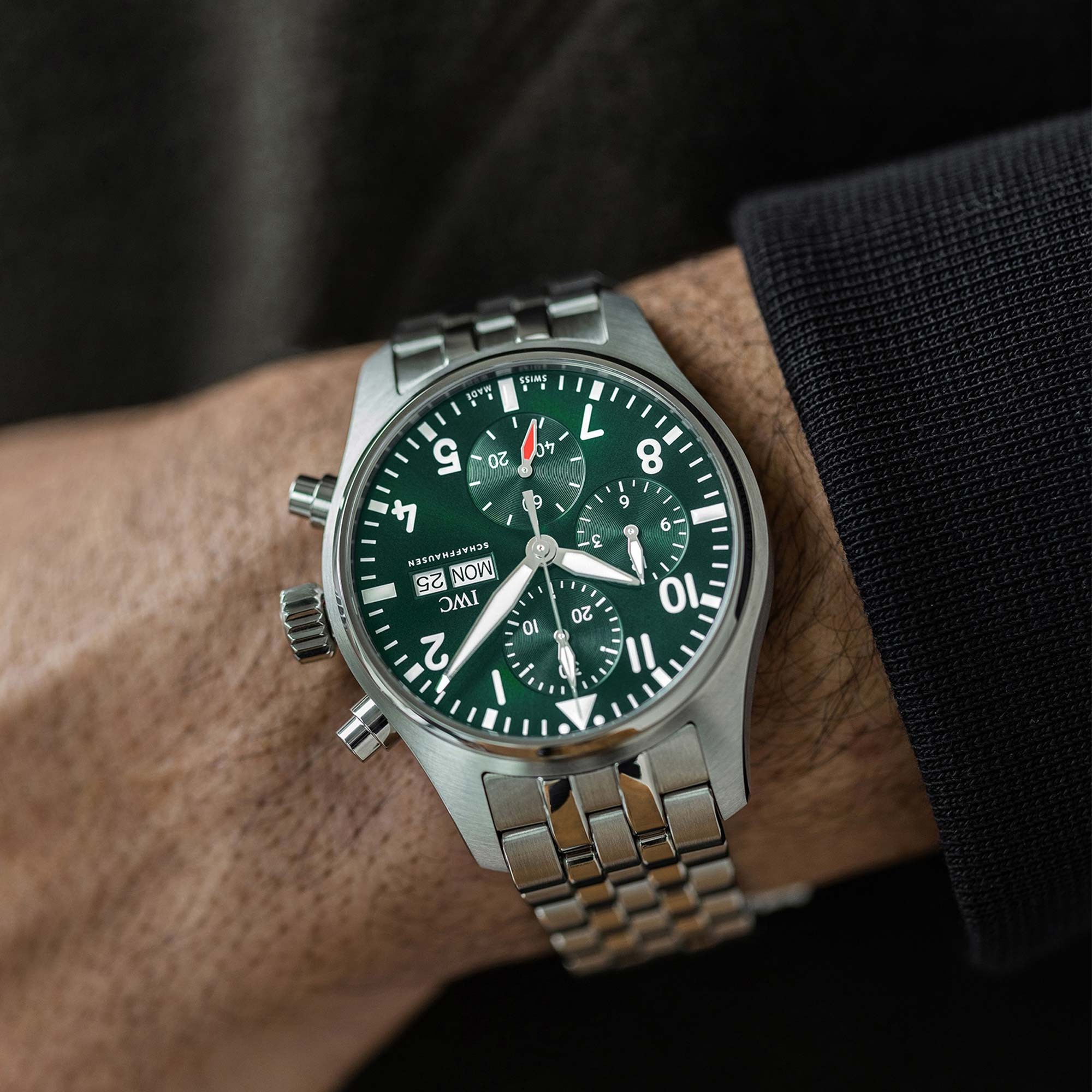 Explore IWC Schaffhausen’s latest collection with the brand new IWC Pilot's Chronograph 41 Mens Watch IW388104. Since 1994, chronographs are a key component of IWC’s collection. This impressive watch from the collection features a 41mm stainless steel case. The green dial is accented with rhodium-plated hands and hour markers. Powered by an automatic movement and water resistant up to 100 metres. This model is presented on a stainless steel bracelet strap with folding safety clasp which can be easily interchanged due to the integrated EasX-Change system.