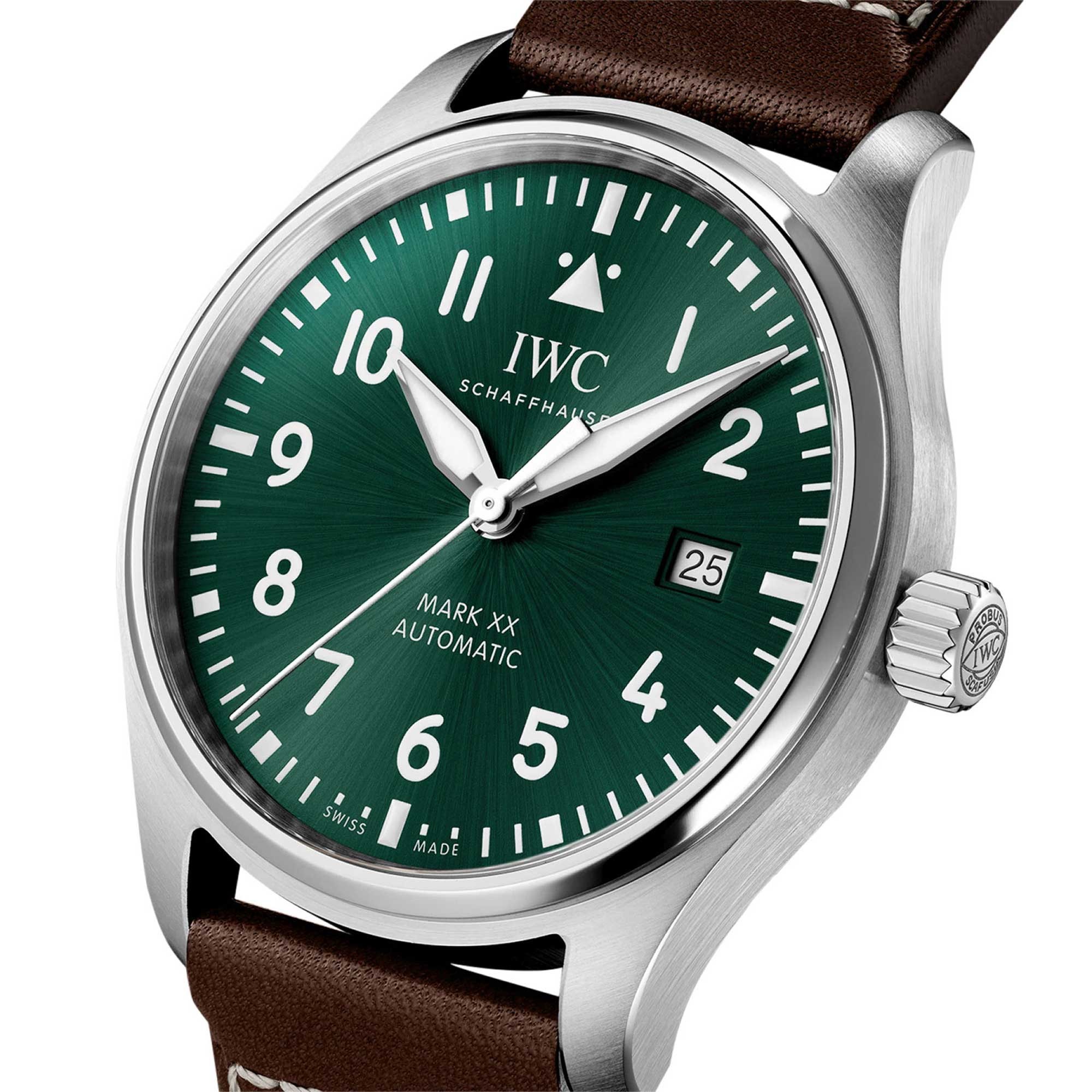 Introducing the IWC Pilots Mark XX IW328205, a distinguished timepiece that pays homage to the rich aviation heritage of IWC Schaffhausen. This exceptional men's watch combines classic design elements with modern functionality, resulting in a timepiece that is both timeless and reliable. The IWC Pilots Mark XX IW328205 features a robust 40mm stainless steel case, crafted with meticulous attention to detail. The sleek silver-tone finish exudes understated elegance, while the striking green dial adds a unique element to the watch. Powering the watch is the automatic IWC caliber 32111 movement, renowned for its precision and reliability. With a power reserve of 120 hours, this timepiece keeps ticking with unwavering accuracy, even during extended periods of wear or when not in use. Presented on a brown leather calf skin strap with EasX-CHANGE system to make the strap interchangeable. Shop IWC watches at Chisholm Hunter today.
