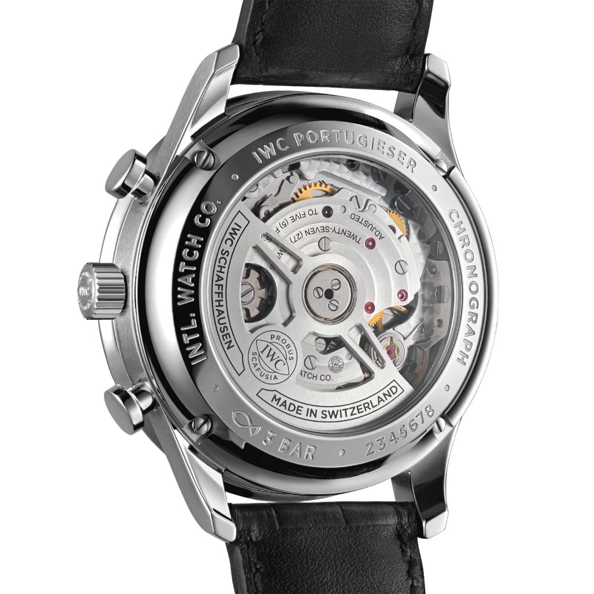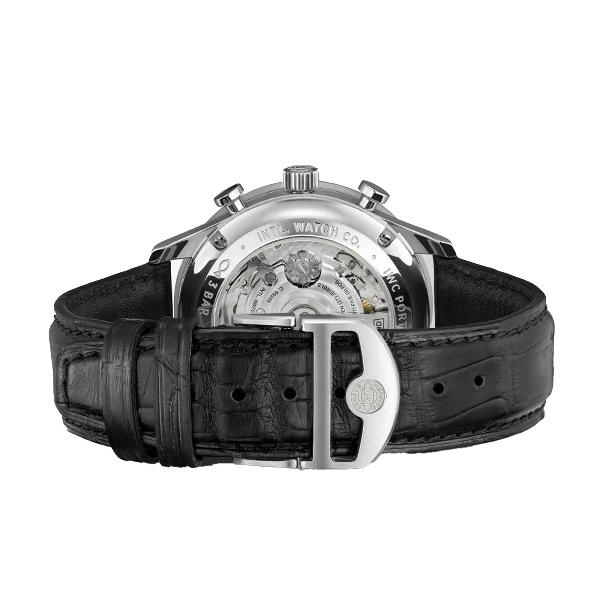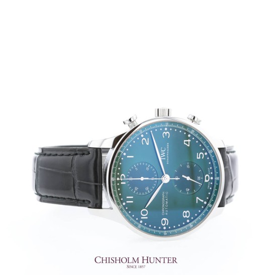 An iconic design, the IWC Portugieser watches originated in the 1930's, when IWC built at the request of two Portuguese merchants a large wrist watch with the precision of a pocket watch. The noticeably large and striking wristwatch was first launched in 1939 and features a railway-rack style chaper ring ("chemin-de-fer"), a popular feature on pocket watches in the 1930's, is reminiscent of railway tracks and is still on the simple dials of Portugieser timepieces to this day. This IWC Portugieser Mens Watch IW371615 features a 41mm stainless steel case, a striking green dial with rhodium-plated hands and appliques and is presented on a black alligator leather strap. Printed with a quarter-second scale, this timepiece not only allows precise reading of the stop time but also reminds us of the Portugieser’s origins as a nautical precision instrument for the wrist. Inside the sporty-elegant chronograph, the IWC-manufactured 69355 calibre is at work; the robust and precise chronograph movement in classic column-wheel design is visible through a sapphire-glass case back.