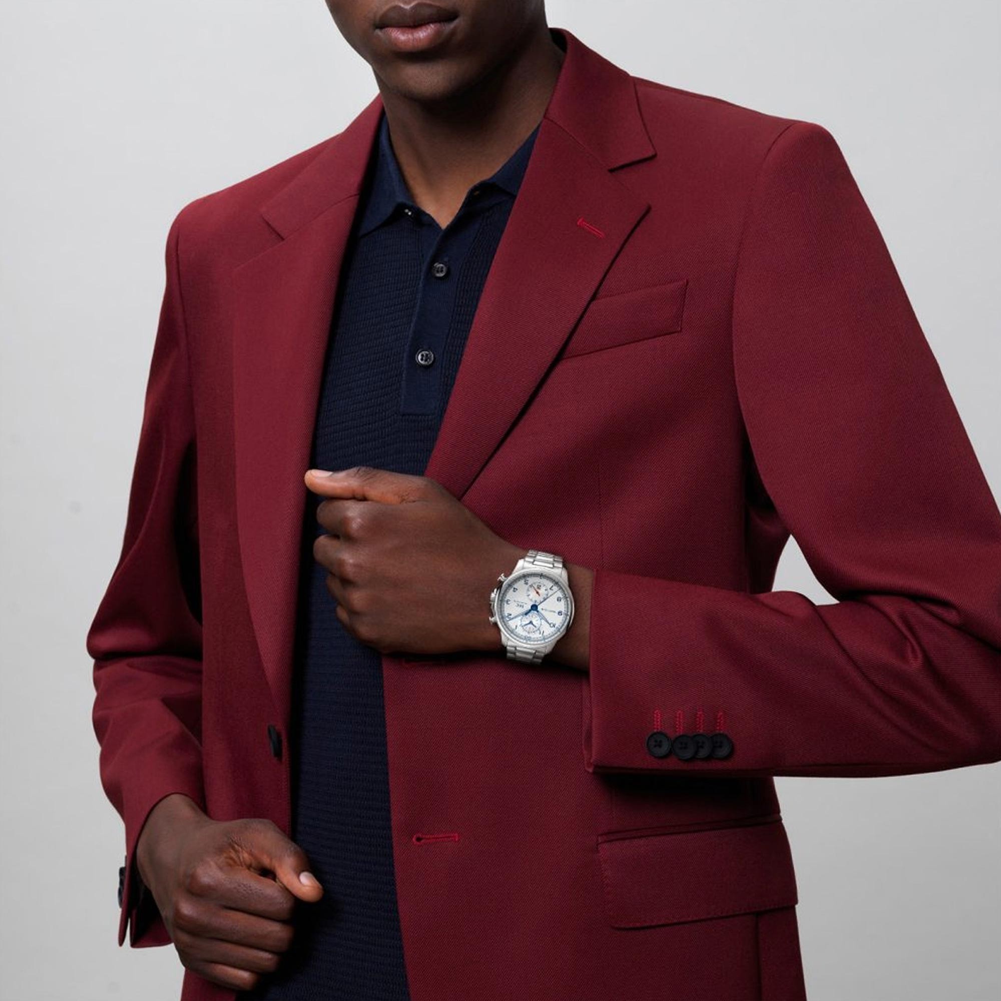 As a nautical sports watch, this IWC Portugieser Yacht Club Mens Watch IW390702 combines timeless elegance with ruggedness and a 60 metres water resistance. These particular characteristics make this a versatile timepiece for both on water and on land. A 44mm case hosts the dial of this sporty chronograph with a minute scale and applied Arabic numerals, all typical Portugieser design features. This particular model combines a silver plated dial with blue hands and appliques. An IWC-manufactured 89361 calibre with flyback function displays the stopped times combined in a single totalizer at 12 o’clock and features a power reserve of 68 hours. A high-quality stainless-steel bracelet with polished and satin-finished surfaces ensures a perfect fit on the wrist.