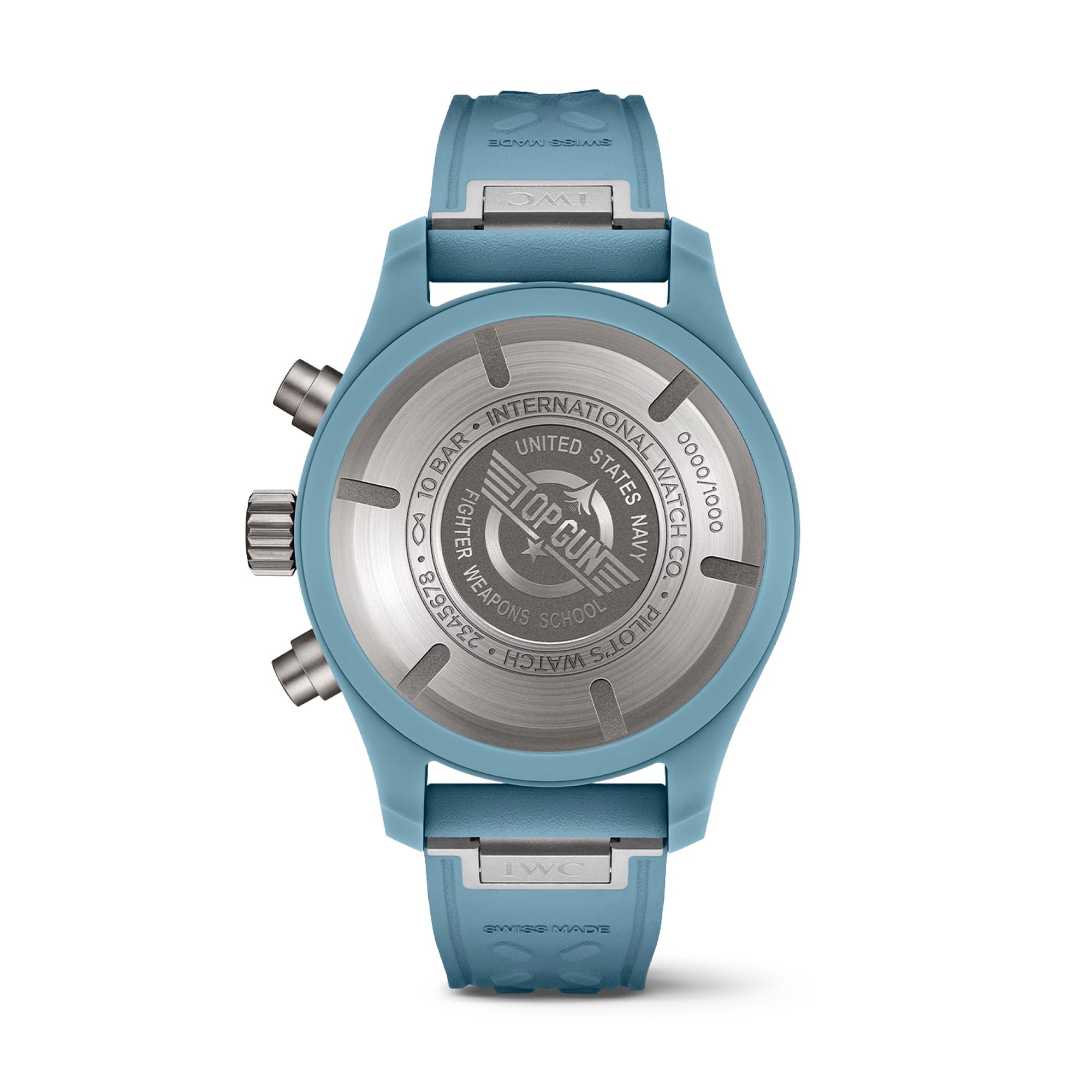 The watch is powered by the IWC-manufactured 69380 calibre movement, a robust and precise chronograph movement in classic column-wheel design. Its bidirectional pawl winding system builds up a power reserve of 46 hours in the mainspring. The titanium case back is engraved with the iconic “TOP GUN” logo. An additional functional feature is the soft-iron inner case, which protects the movement from magnetic fields.