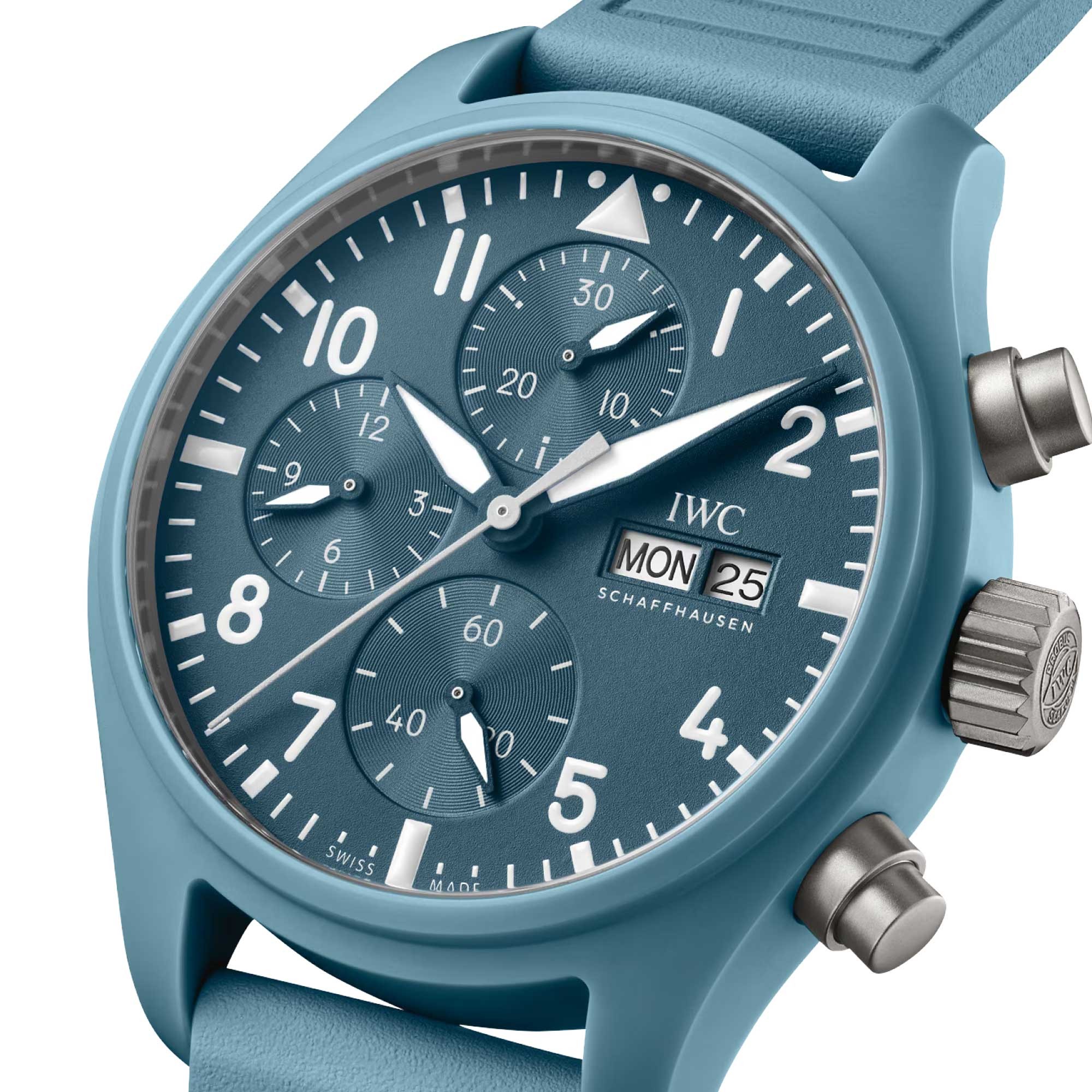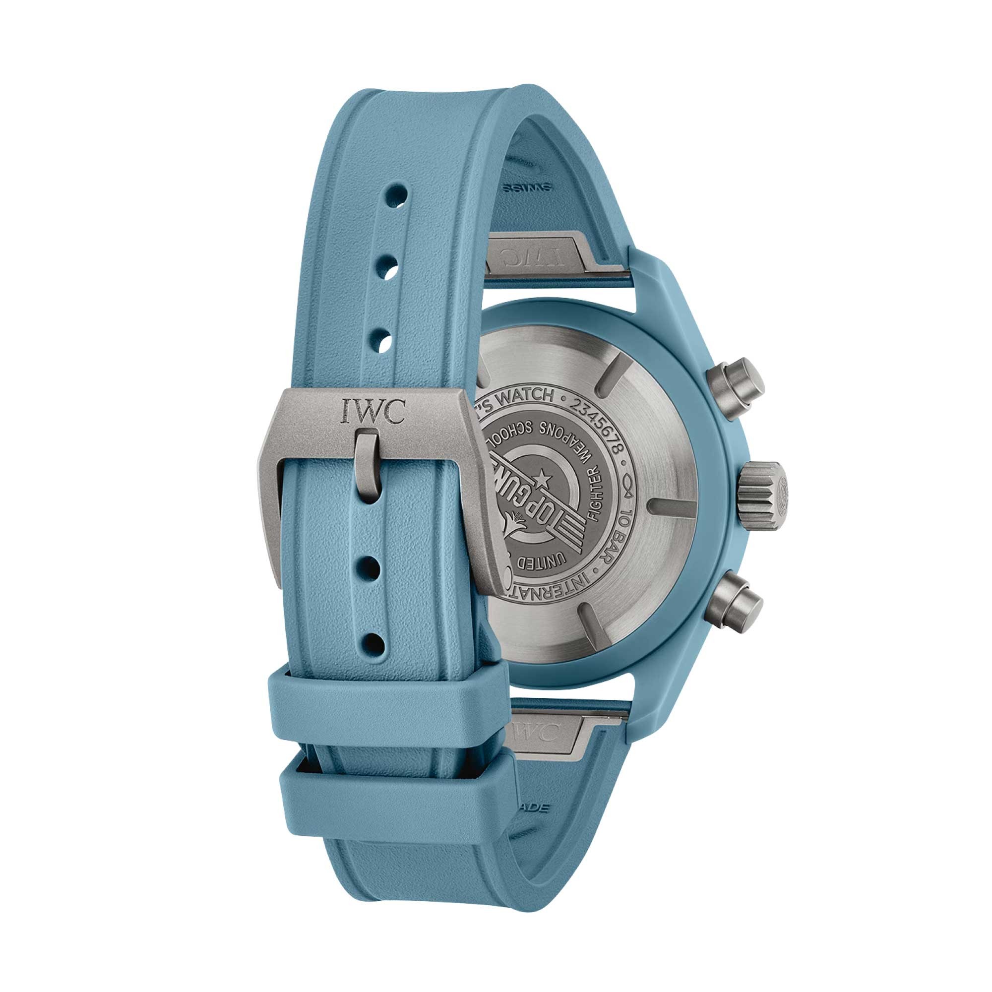 Limited to 1,000 pieces, the Pilot’s Watch Chronograph 41 TOP GUN Miramar is the first watch from IWC Schaffhausen to feature a ceramic case in a light blue color called IWC TOP GUN Miramar. The color’s name is a reference to the Marine Corps Air Station Miramar in San Diego, the home of the Navy’s TOPGUN program before it was relocated to Naval Air Station Fallon in Nevada. A similar light blue shade can also be found on the t-shirts worn by TOPGUN instructors. The ceramic case is complemented by a dial and a rubber strap in the same colour.