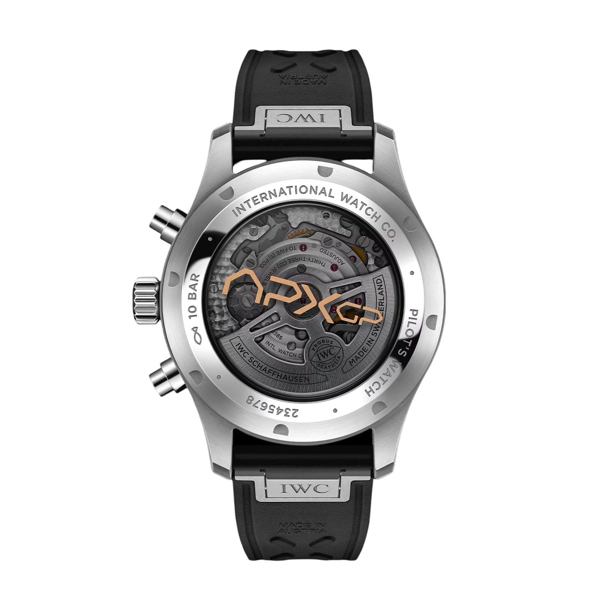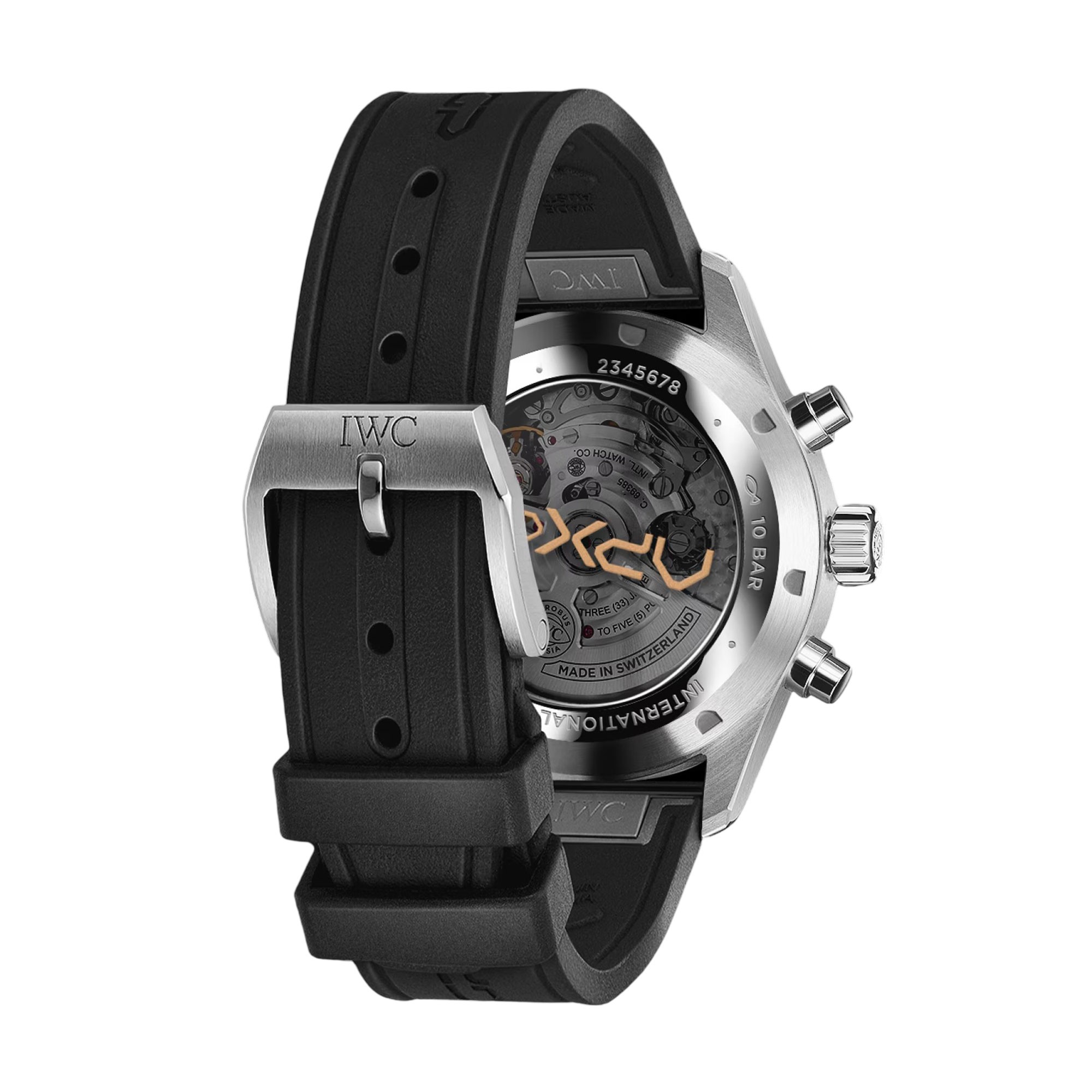 The Pilot’s Watch Chronograph APXGP is powered by the IWC-manufactured 69385 calibre. The mechanical chronograph movement in a classic column-wheel design is engineered with an uncompromising focus on performance, reliability, and precision. Accurately measuring stop times up to 12 hours, it features IWC’s characteristic vertical subdial layout. The hours are displayed at 9 o’clock, while the stopped minutes are shown directly at the 12 o’clock position, making them particularly easy and intuitive to read. The movement’s bidirectional pawl winding system reliably builds up a power reserve of 46 hours in the mainspring.