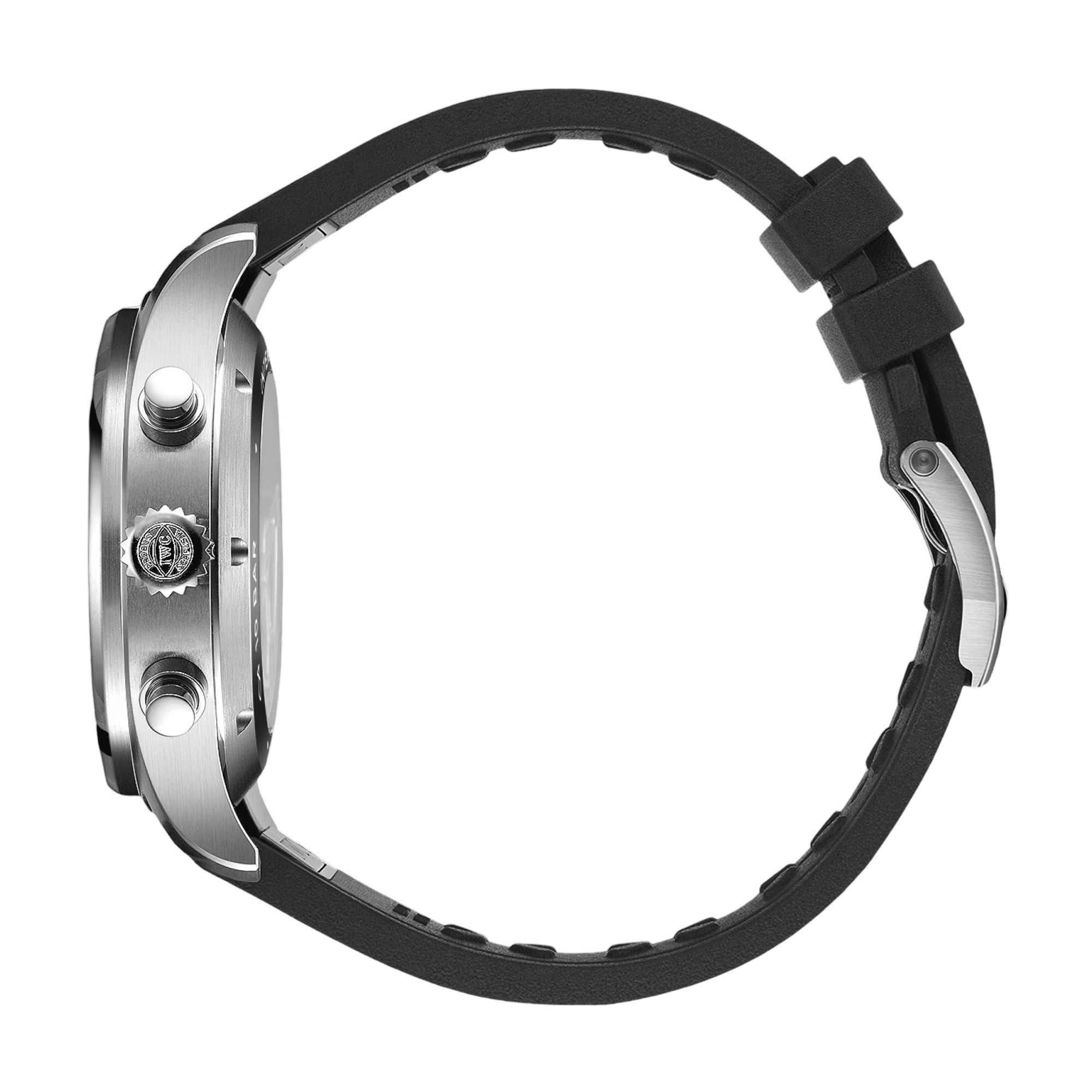 Its design with black, gold and white elements takes inspiration from the team’s colours and race car. A stainless steel case with a diameter of 43 millimeters is combined with a black dial, which is printed with white numerals and golden minute markers. The minute and hour hands and the hands in the subdials are gold-plated and filled with white Super-LumiNova®. The tinted sapphire glass case back features the APXGP logo printed in gold, while a special laser engraving on the durable and water-proof black rubber strap also commemorates the fictional team from the movie. Thanks to the EasX-CHANGE® strap change system, the strap can be exchanged at a touch of a button and without any tools.