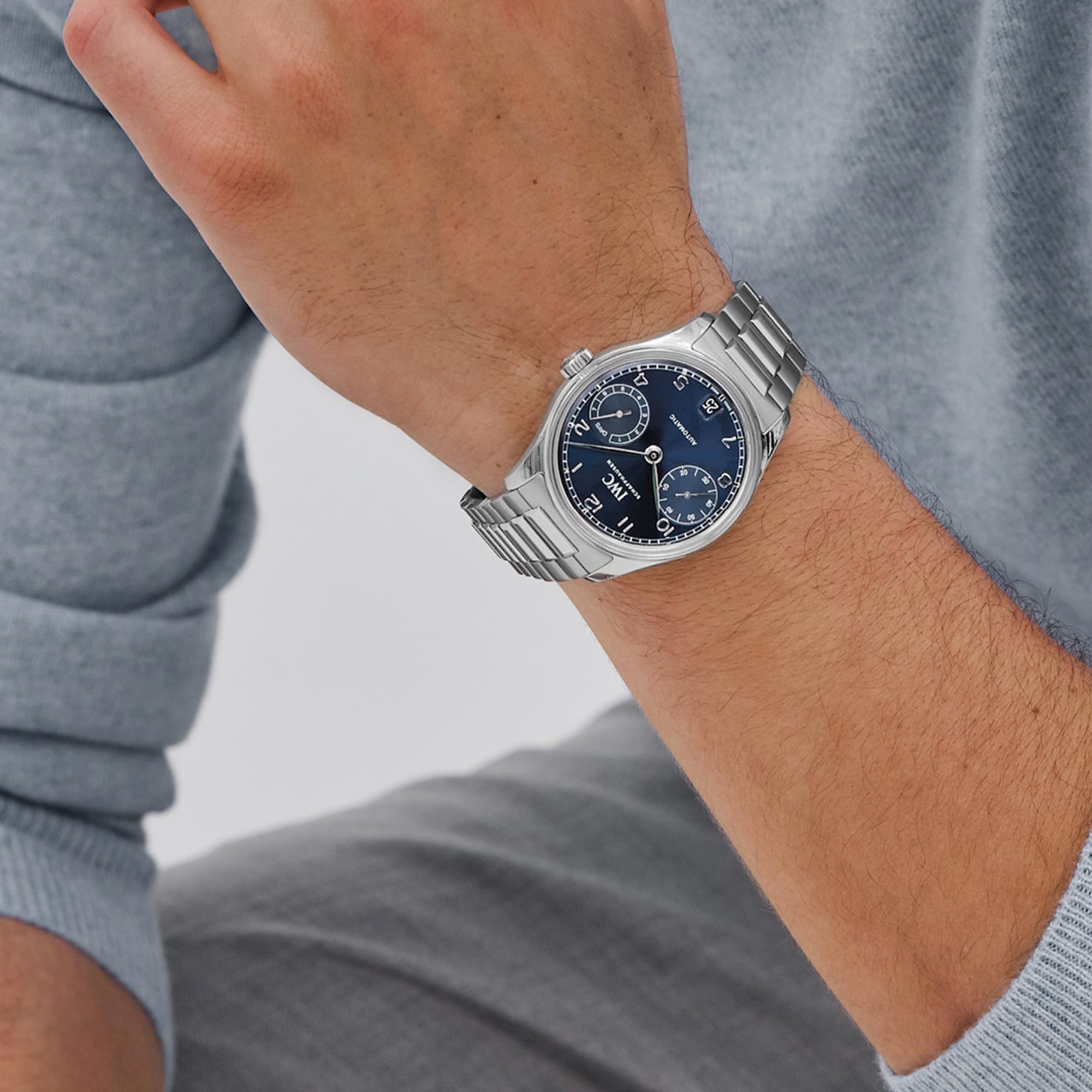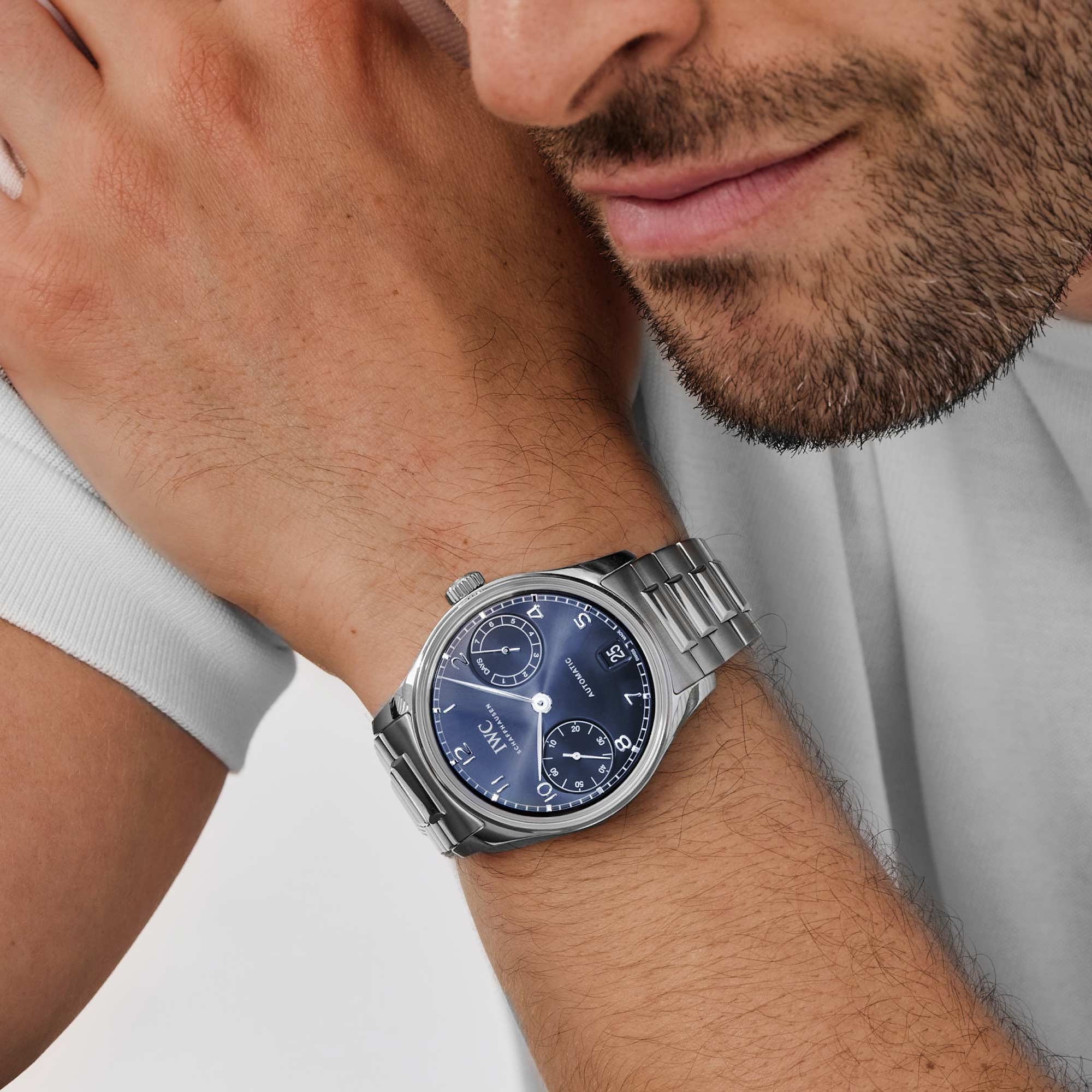 The origins of the Portugieser date back to the late 1930s, when IWC Schaffhausen used a high-precision pocket watch movement to create a distinctively large wristwatch with chronometer precision. First introduced in 2000, the Portugieser Automatic 42 features an open, balanced dial, with a power reserve indicator at 3 o’clock and the small seconds positioned on the opposite side at 9 o’clock.