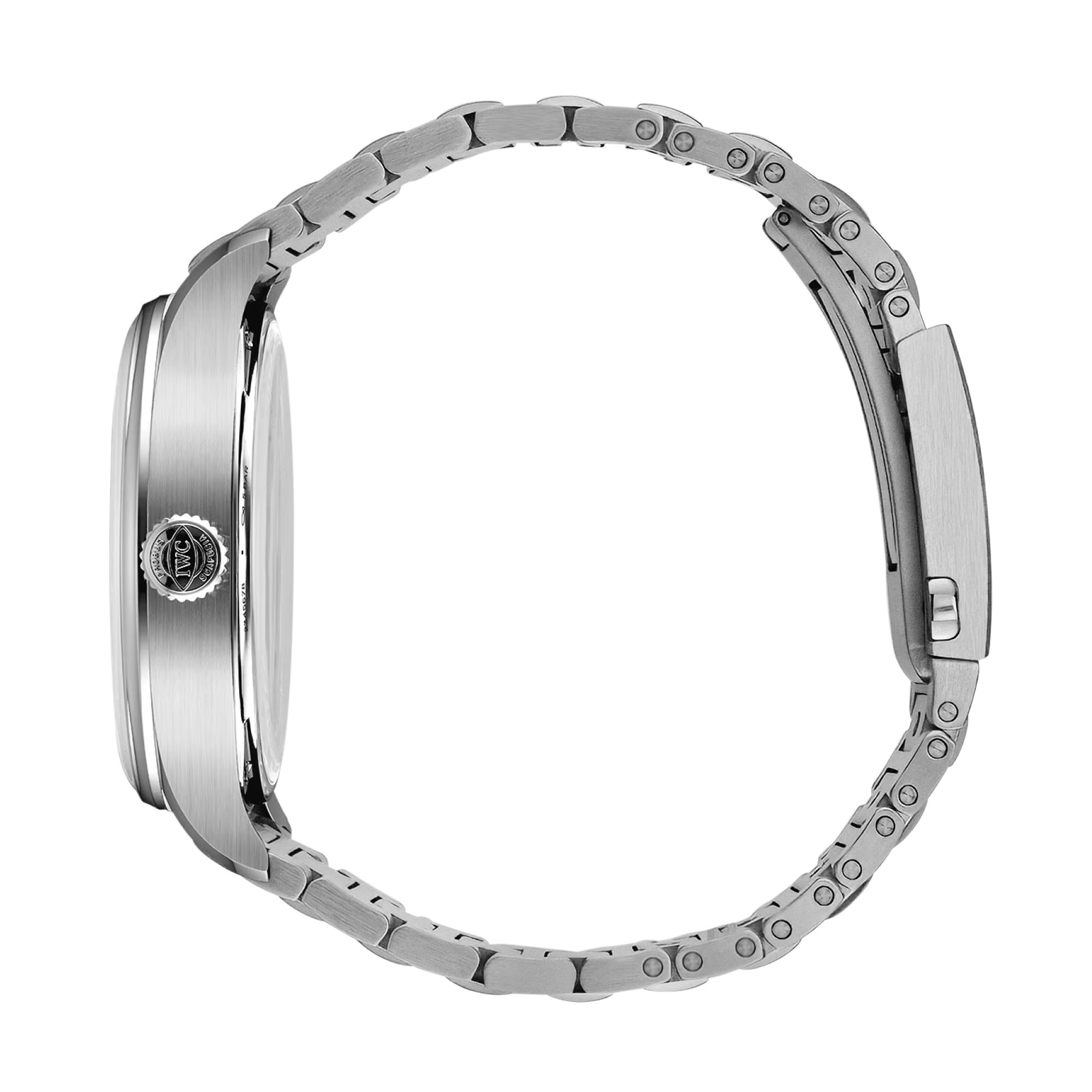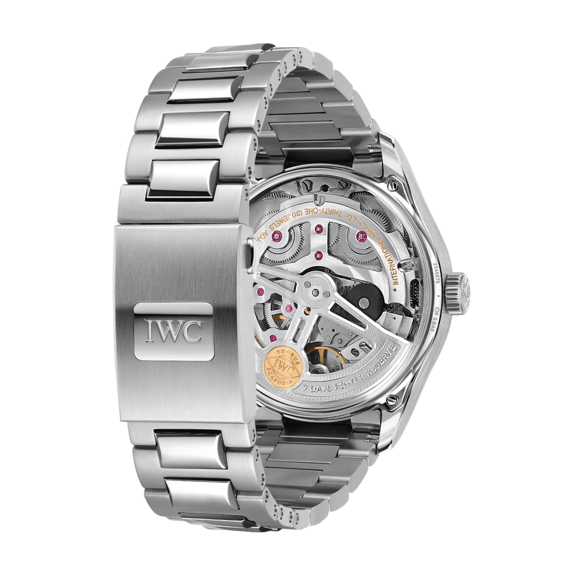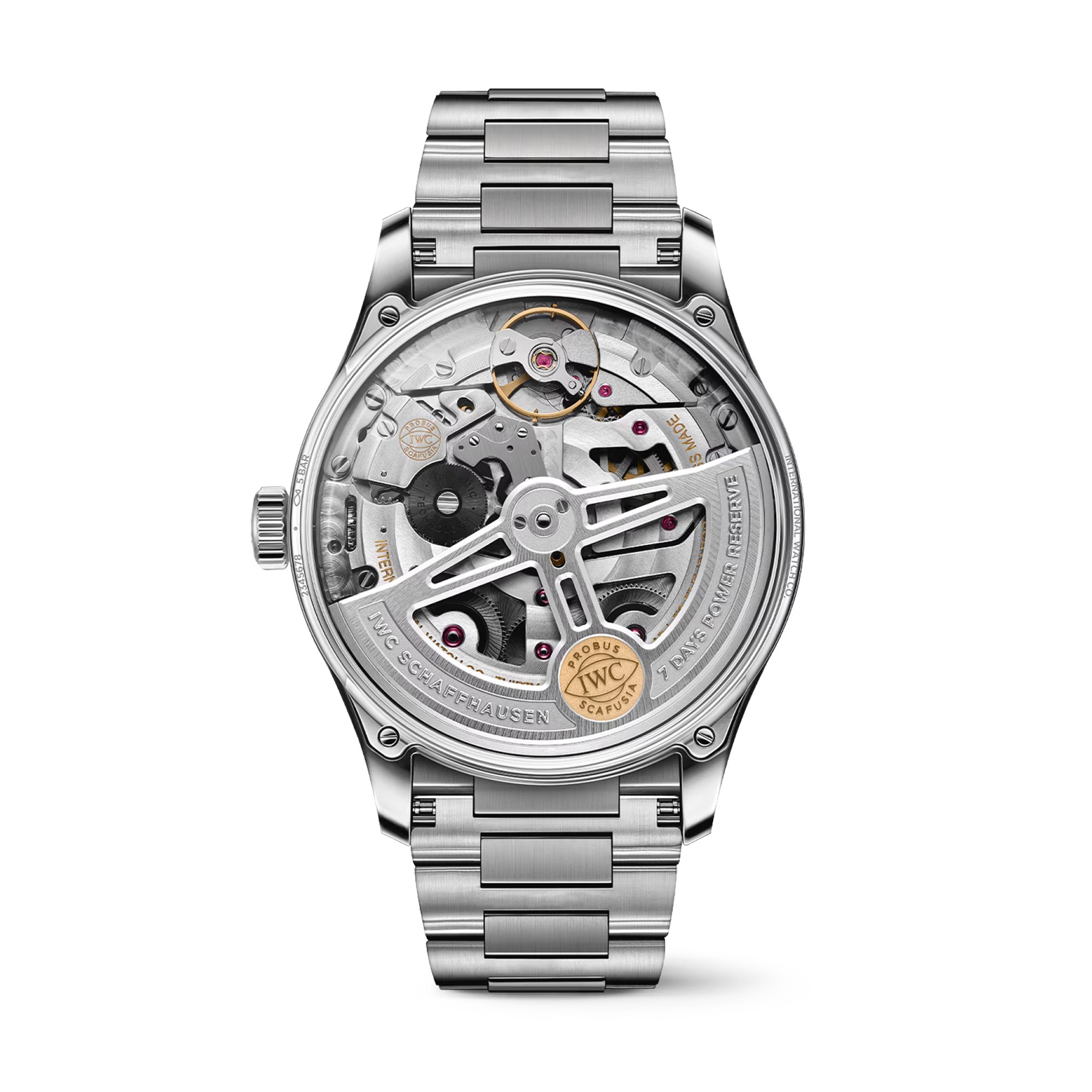 Finally, the appliques are individually mounted on the dial by hand. The Portugieser Automatic 42 is powered by the IWC-manufactured 52011 caliber, which is elaborately finished with circular Geneva stripes. The Pellaton winding system is reinforced with virtually wear-free zirconium oxide ceramic components and builds up a power reserve of seven days (168 hours) in two barrels. The watch is fitted with a stainless steel bracelet.
