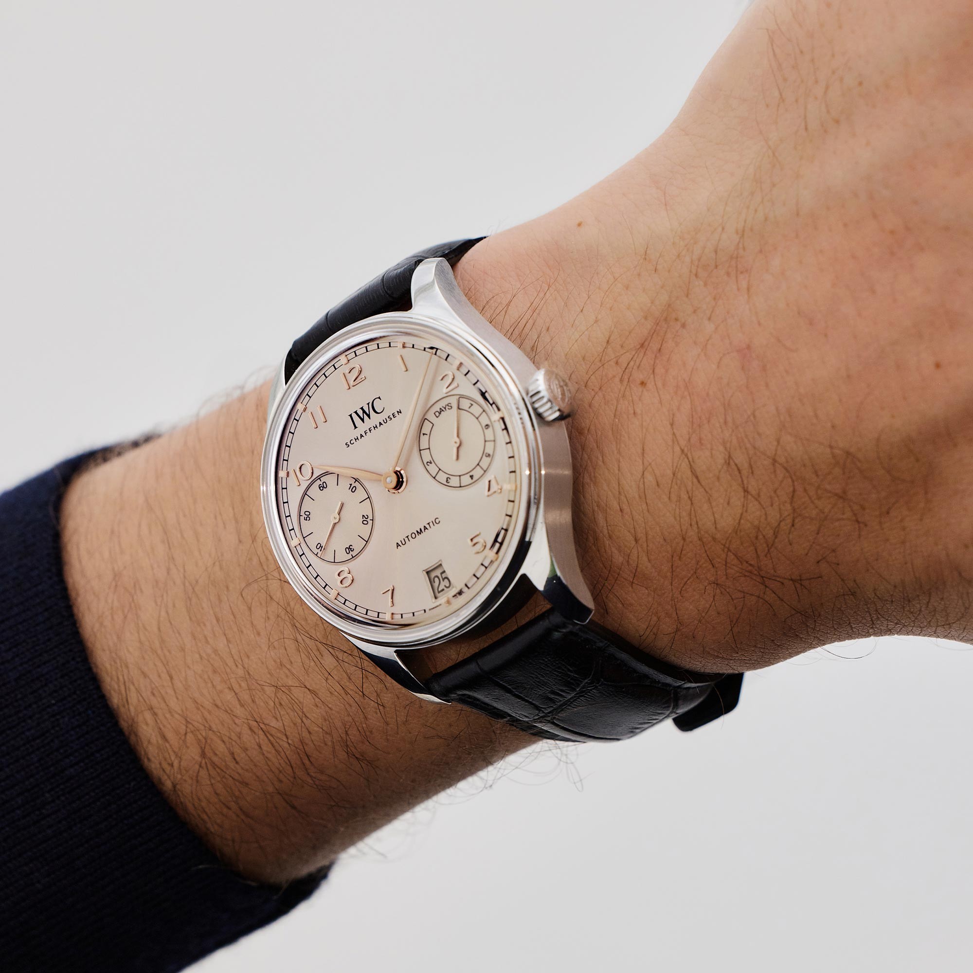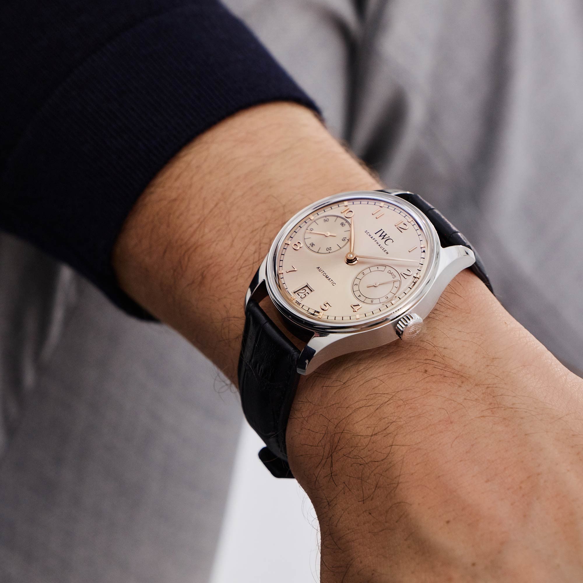 The origins of the Portugieser date back to the late 1930s, when IWC Schaffhausen used a high-precision pocket watch movement to create a distinctively large wristwatch with chronometer precision. First introduced in 2000, the Portugieser Automatic 42 features an open, balanced dial, with a power reserve indicator at 3 o’clock and the small seconds positioned on the opposite side at 9 o’clock.
