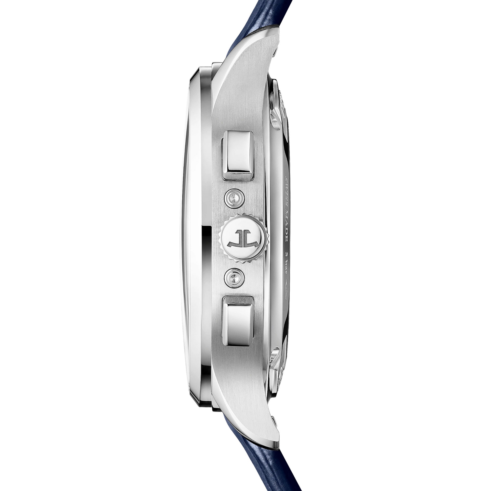 The Master Control Chronograph Calendar is distinguished by its modern elegance. Its sunray dial displays two shades of blue that lend depth to the style. The deep blue of the dial's centre, the pulsometer scale and the moon phase are complemented by the lighter blue small second and 30-minute counters.