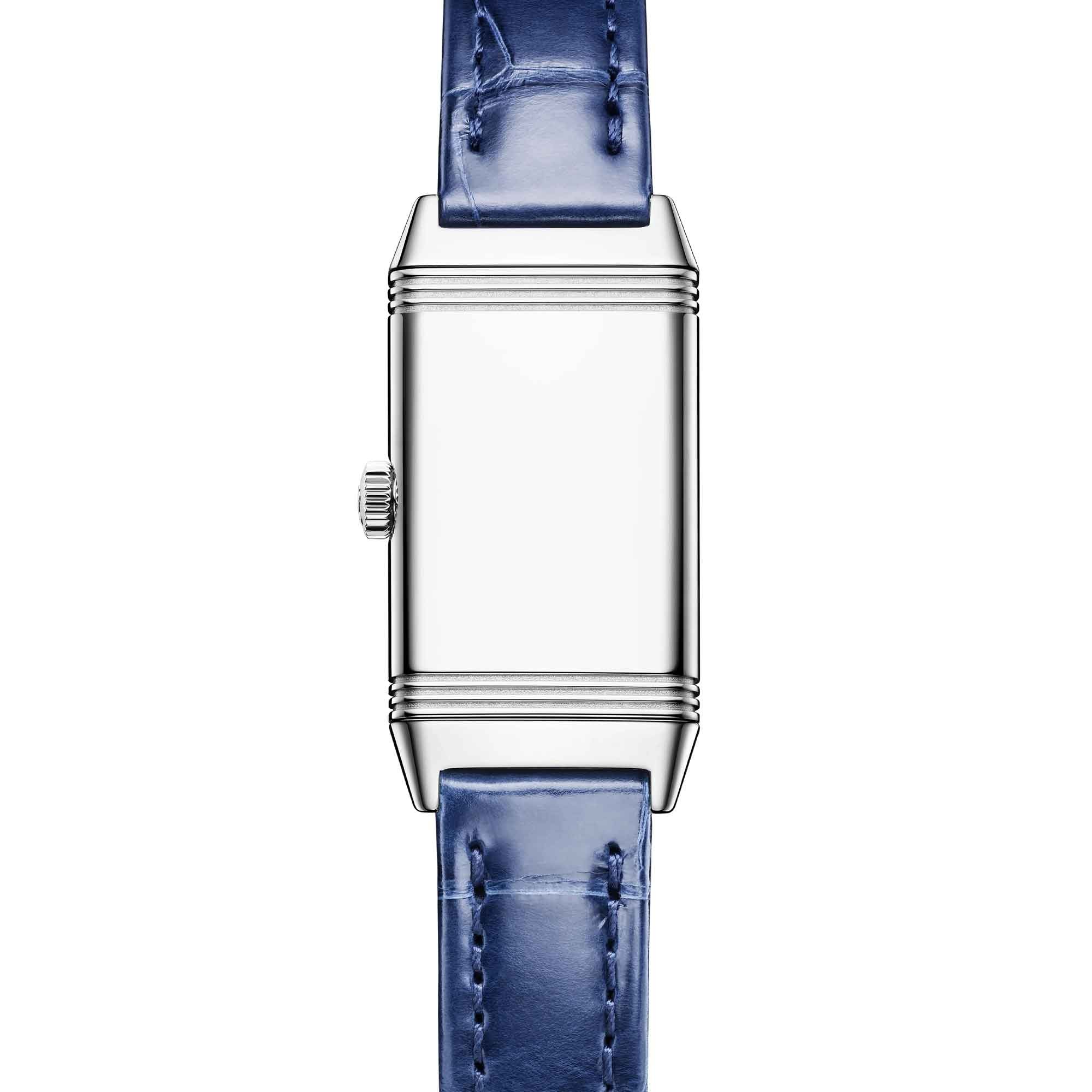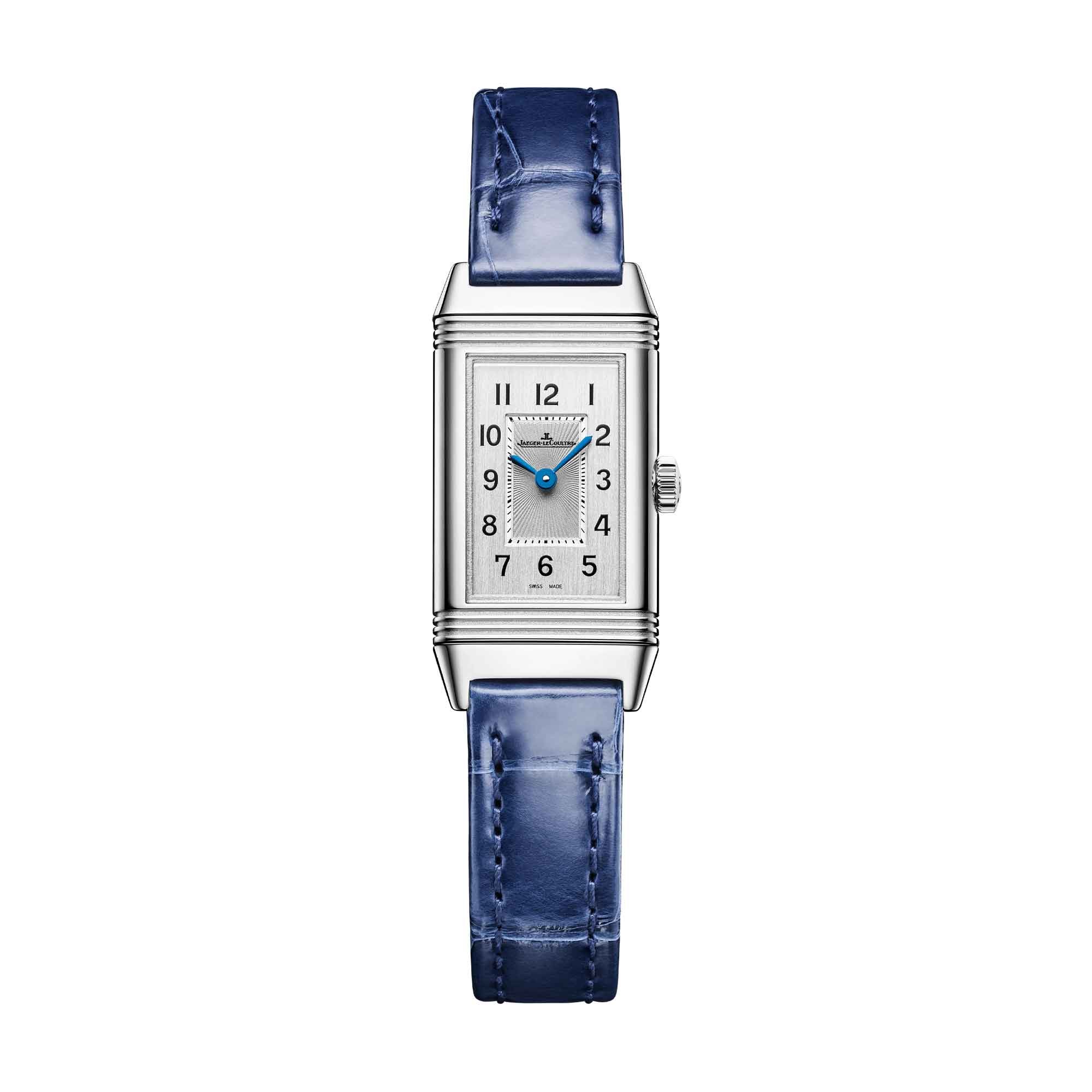 The silver-coloured dial hosts 12 arabic numerals and blued Dauphine hands echoing the blue of the subtly shiny alligator leather strap. As the name suggests, the reverse of the watch can be personalised by engraving a motif, a date or initials.
