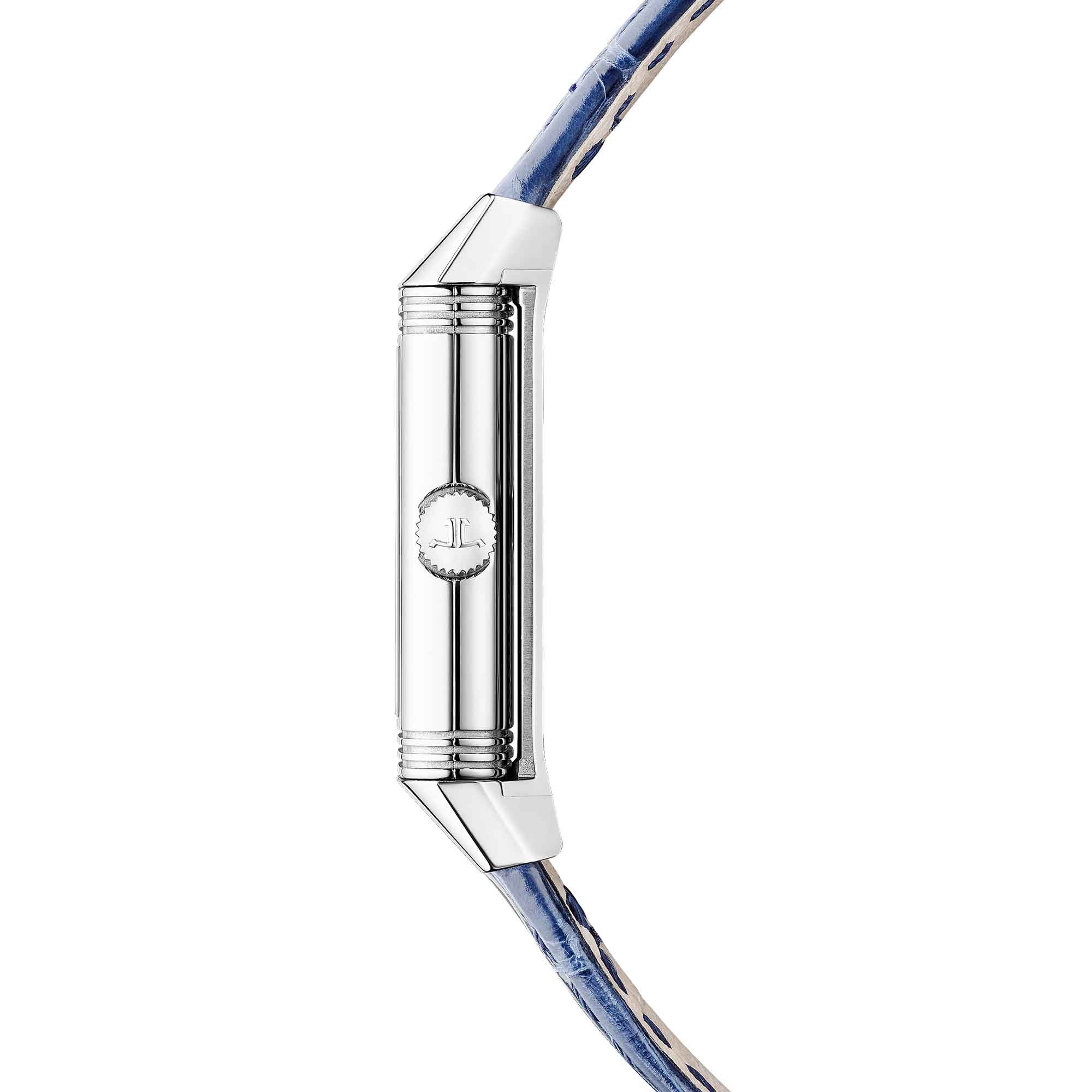The Reverso Classic Monoface Origin, with its slim rectangular silhouette (16.3 mm wide), recalls the proportions of the first women’s Reverso cases from the 1930s. Equipped with a quartz movement, the watch displays the Hour & Minute functions on a very pure front, enhanced by the double finish of the dial, guilloché on the inside and vertically brushed on the outside.