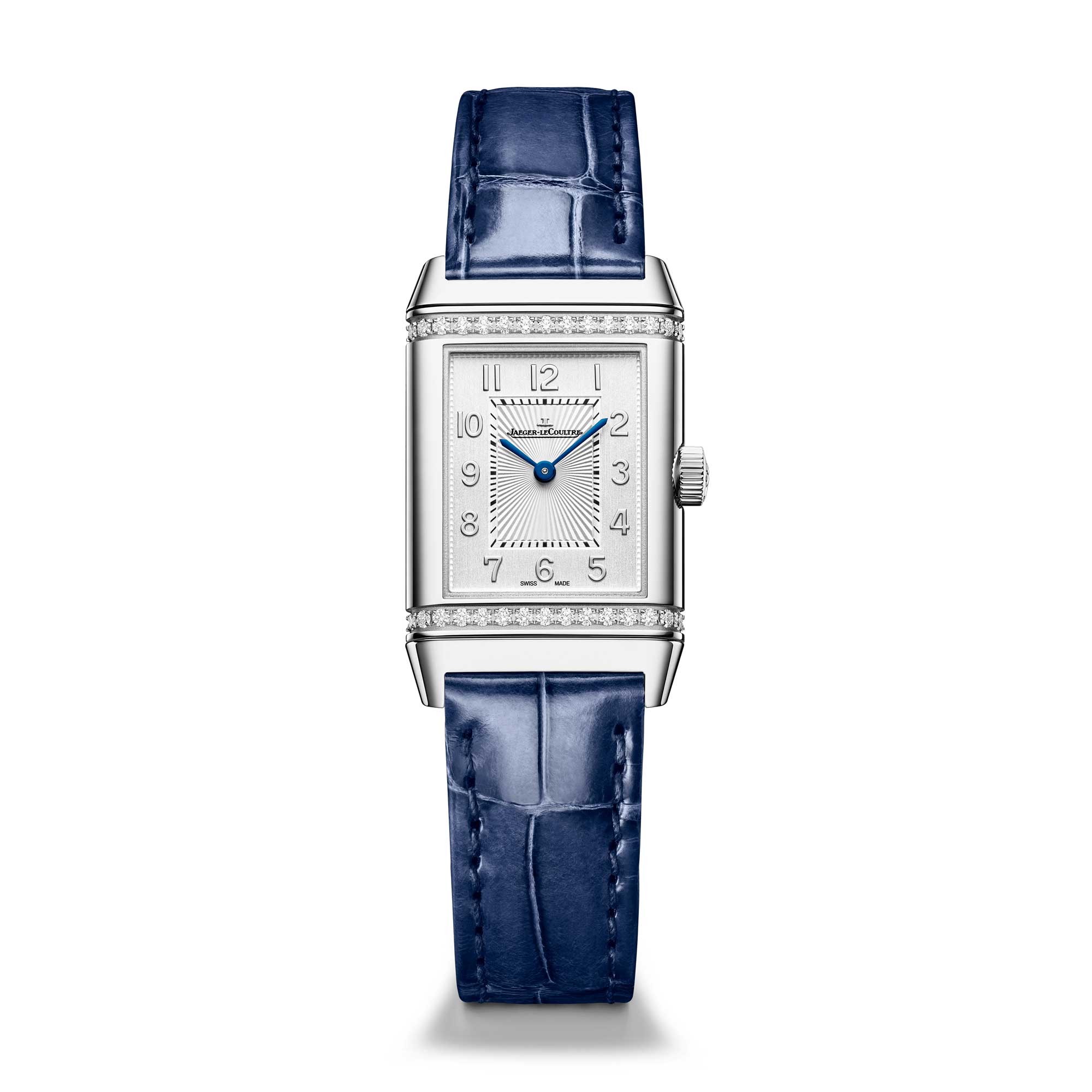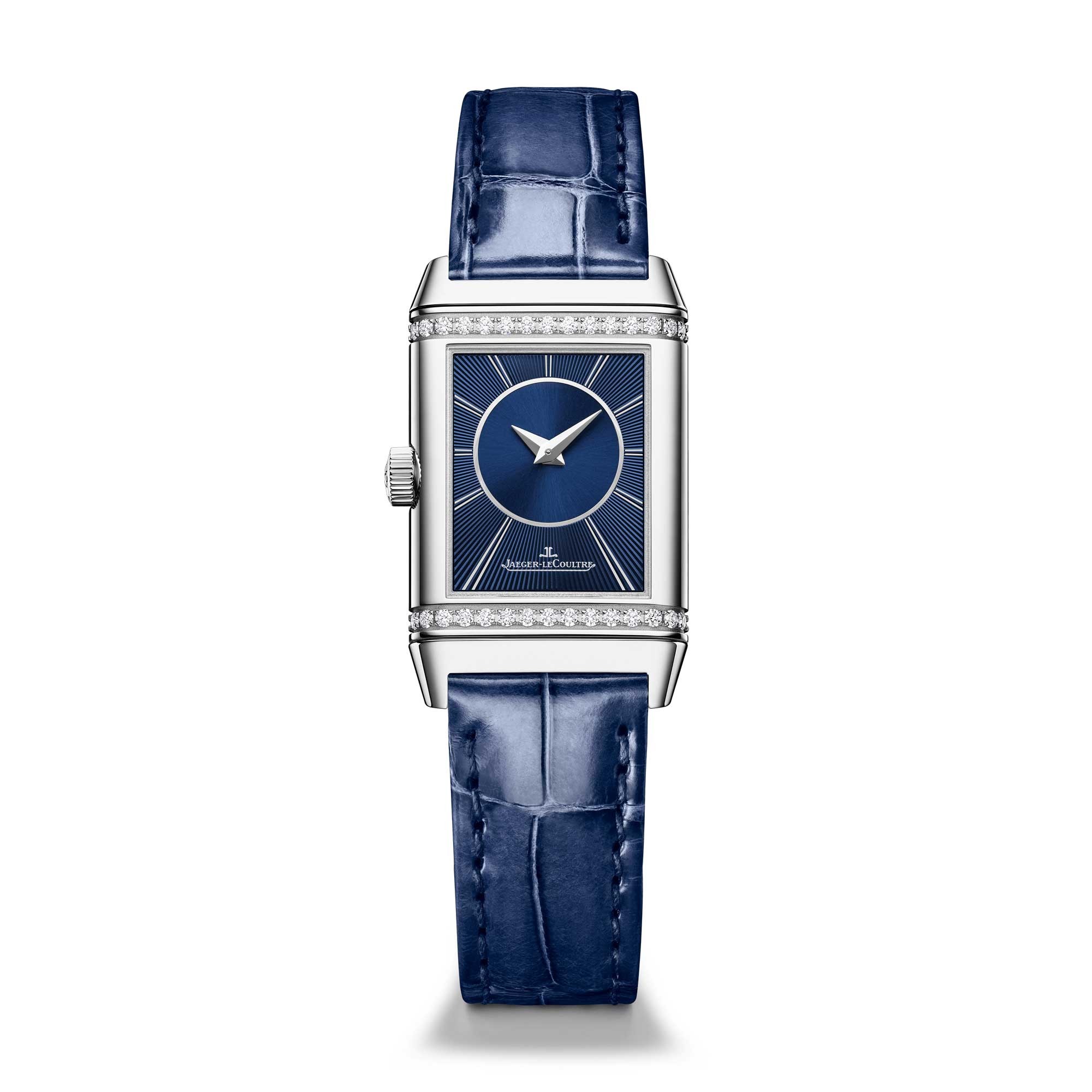 The Reverso Classic Small Duetto embodies the collection's enduring style and dual elegance with its 34.2 x 21 mm stainless steel case featuring diamond-set signature gadroons.