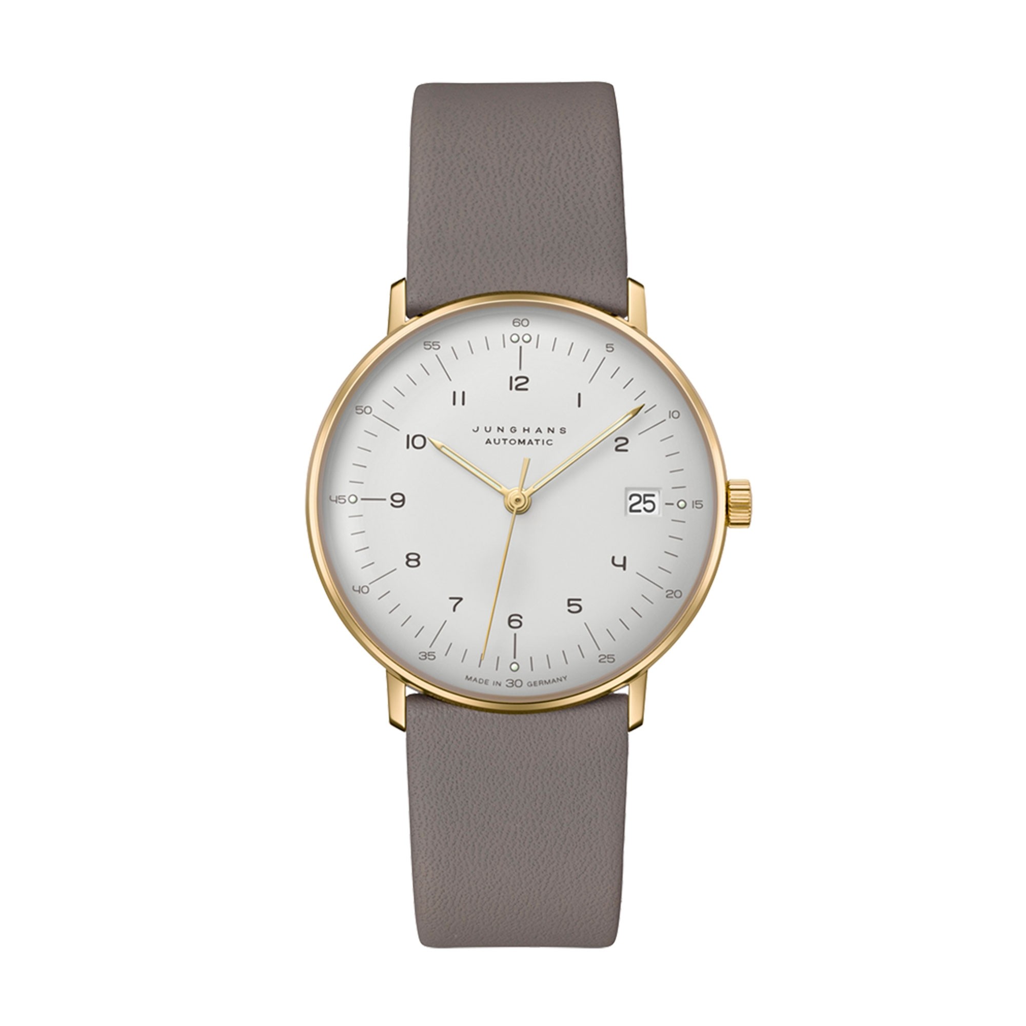 Junghans Max Bill Kleine Automatic Sapphire, brown leather strap, white dial with silver case, numerals displayed on dial.