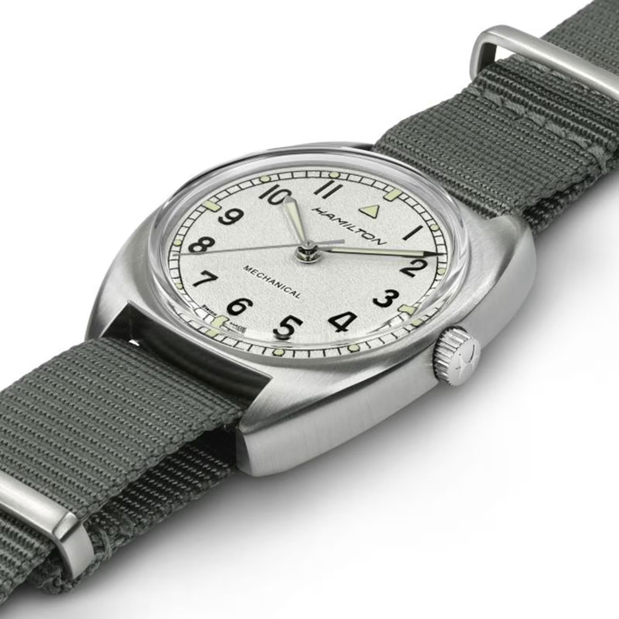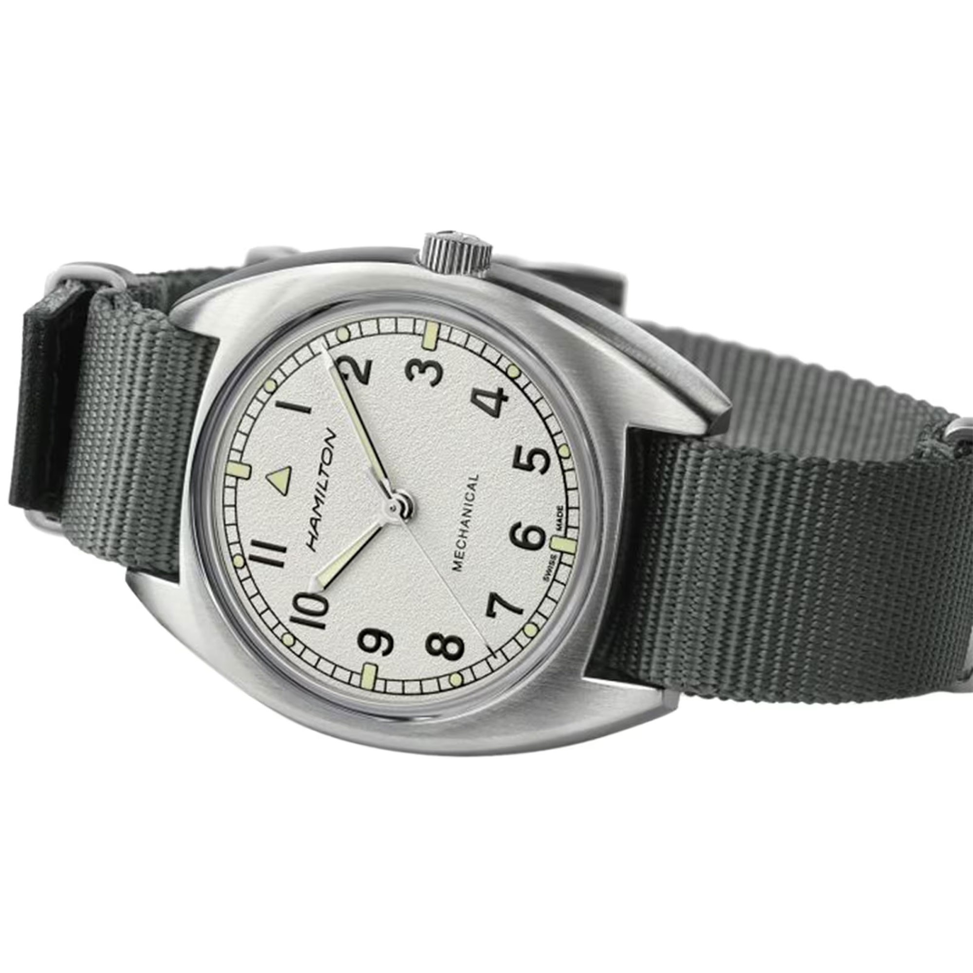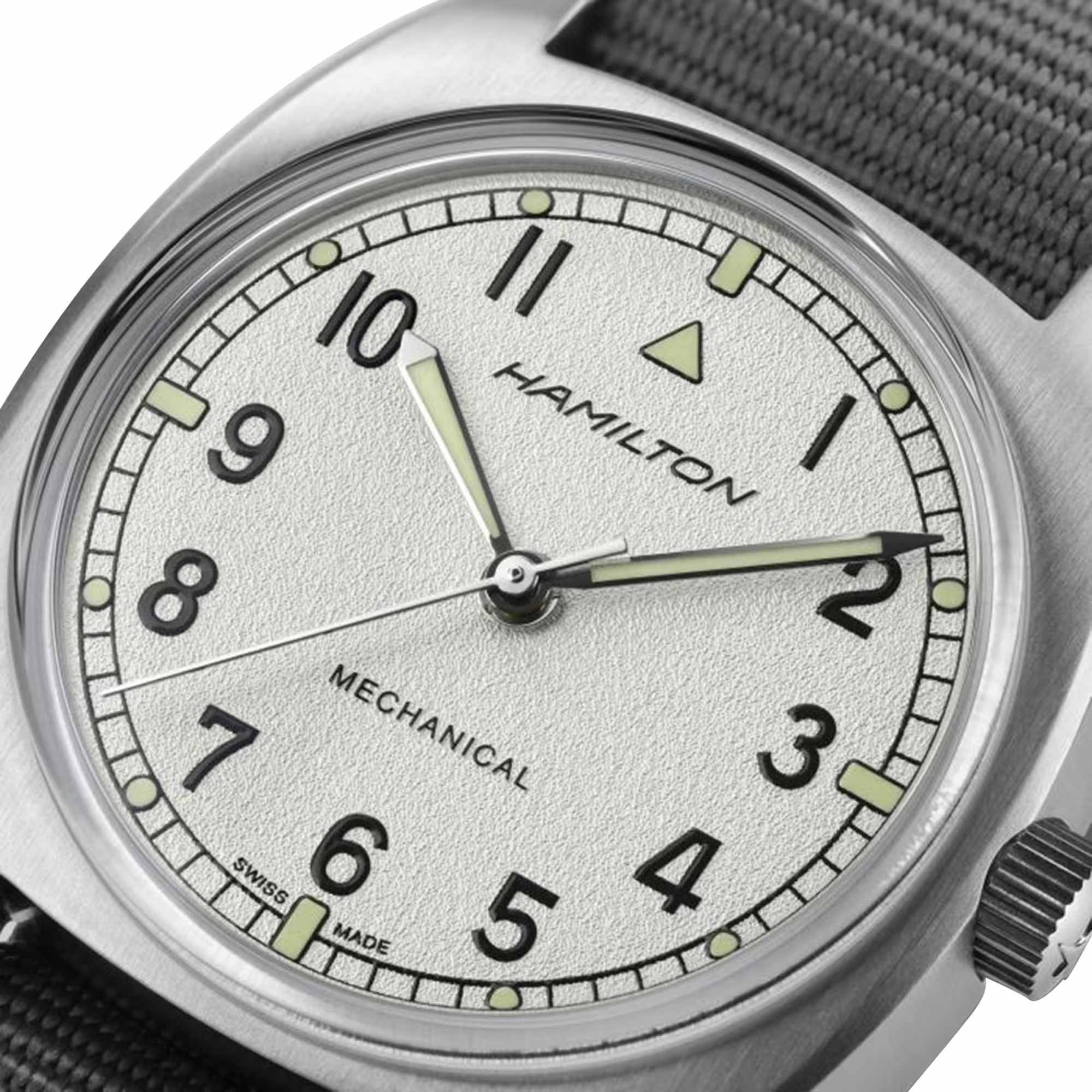 Powered by the amazing H-50 handwinding movement with an impressive 80 hours of power reserve, the Khaki Pilot Pioneer has been inspiried by a vintage military watch produced for the British Royal Air Force in 1973. Featuring a bold and unique dial pattern and robust NATO strap, this is a military watch with real personality.