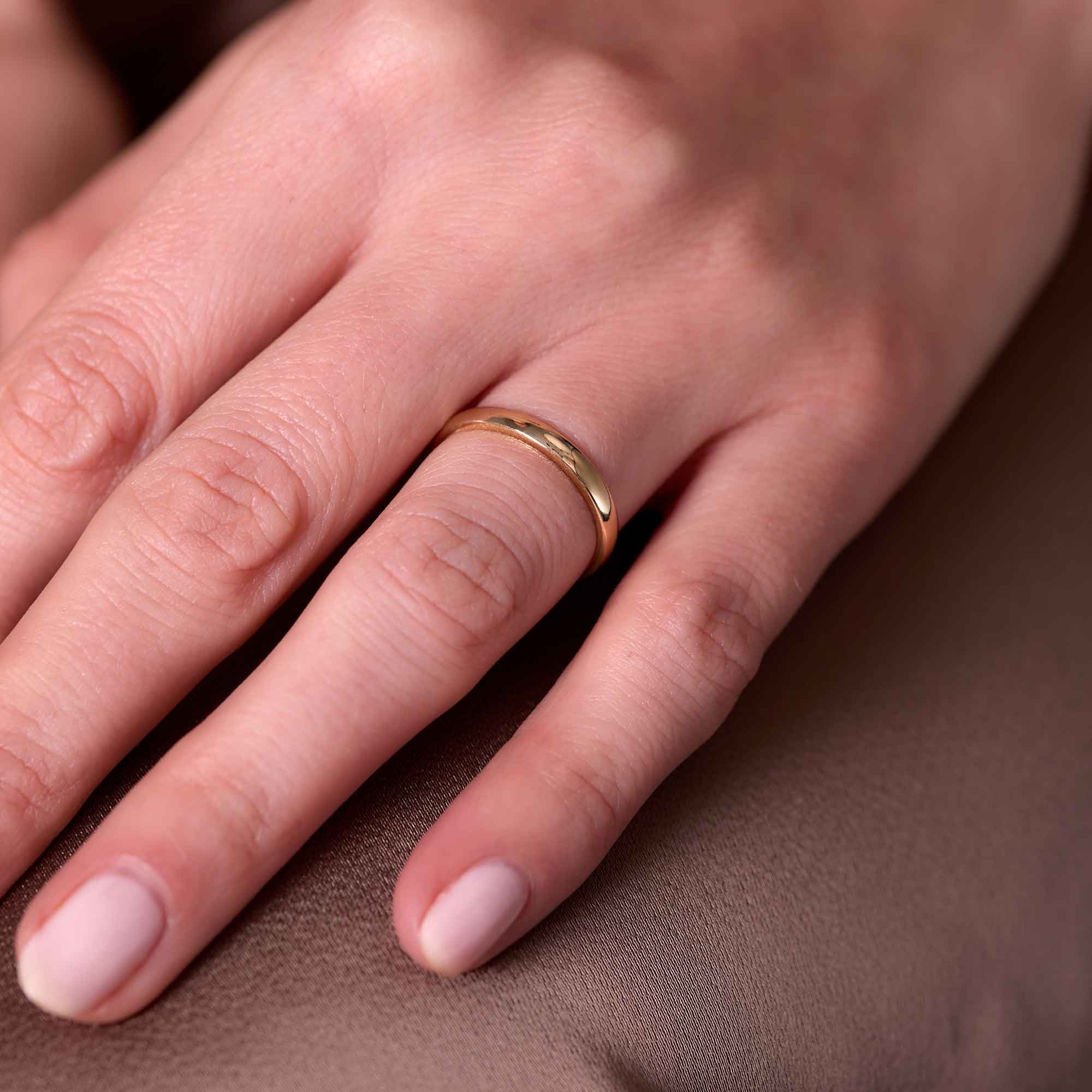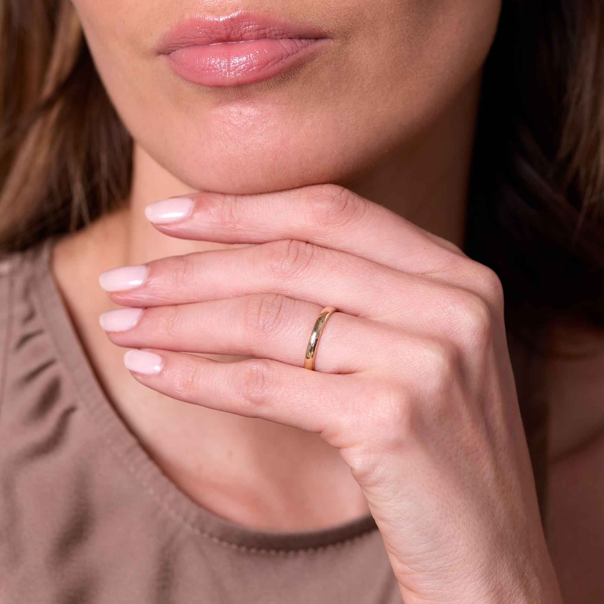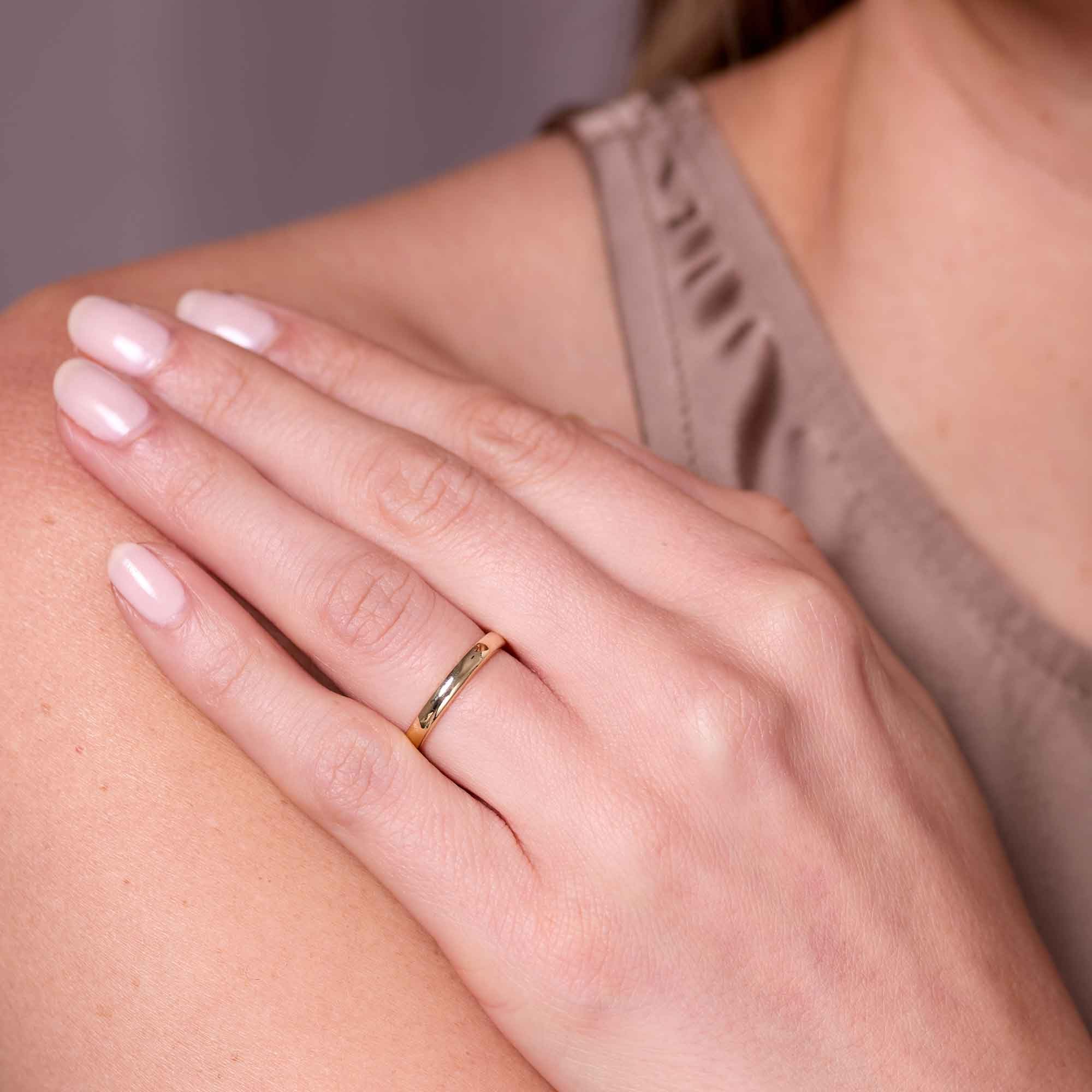 The polished finish gives a clean, bright look. 9ct gold provides lasting strength for daily life while keeping its warm tone. The smooth, seamless form sits flat against the finger and slides on with ease. Its slim profile stays discreet under gloves and at work, and it stacks well alongside other bands.