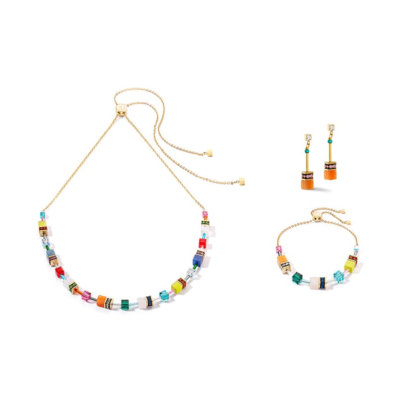 Sparkling European Crystals, rhinestone rondelles, synthetic, solid coloured tiger’s eye, natural rock crystal, red aventurine, blue aventurine, rose quartz and gold plated stainless steel combine in this colourful GeoCUBE® Necklace. Sliding fastener allows for adjustable length on the necklace and matching bracelet. A beautiful, vibrant design with natural stone features. Necklace Length: adjustable from 30cm up to 79cm