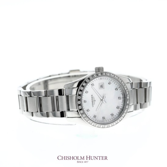 The Conquest Classic line is a celebration of elegance, tradition and performance. These stunning models, all fitted with self winding calibres, are a tribute to the chronographs produced from 1878 on and are a nod to Longines long partnership with many of the most prestigious sports events in the world. This sophisticated ladies model features a round 29.50mm stainless steel case. The elegance continues as the bezel is set with 34 Top Wesselton IF-VVS diamonds totalling 0.312 carats. A beautiful shimmering mother of pearl dial showcases silver polished hands, a date marker visible at 3o'clock and the hour markers consist of 11 Top Wesselton VS-SI diamonds totalling 0.055 carats. The dial is protected with scratch resistant sapphire crystal glass. This stunning case flows into an expertly made stainless steel bracelet, secured with a triple safety folding clasp and push-piece opening mechanism. Reliably powered by an L152 Quartz movement, this stunning timepiece is also water resistant to 50 meters. All Longines watches are presented with a 2-year international warranty and Longines packaging.