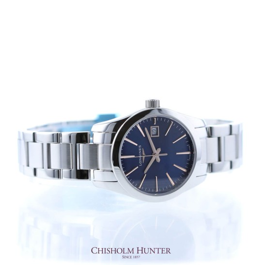 The Conquest Classic line is a celebration of elegance, tradition and performance. These stunning models, all fitted with self winding calibres, are a tribute to the chronographs produced from 1878 on and are a nod to Longines long partnership with many of the most prestigious sports events in the world. This beautiful ladies model features a round stainless steel case measuring 29.50mm, surrounding a blue dial, brought to life with pink hands and applied pink indices. A date window is also visible at the 3o'clock position. The dial is protected by scratch resistant sapphire crystal, complete with several layers of anti-reflective coating on the underside for easy readability. The design flows into a stainless steel bracelet secured with a triple safety folding clasp and push-piece opening mechanism. This timeless and yet contemporary timepiece is reliably driven by an L152 Quartz movement and is also water resistant to 50 meters. All Longines watches are presented with a 2-year international warranty and Longines packaging.