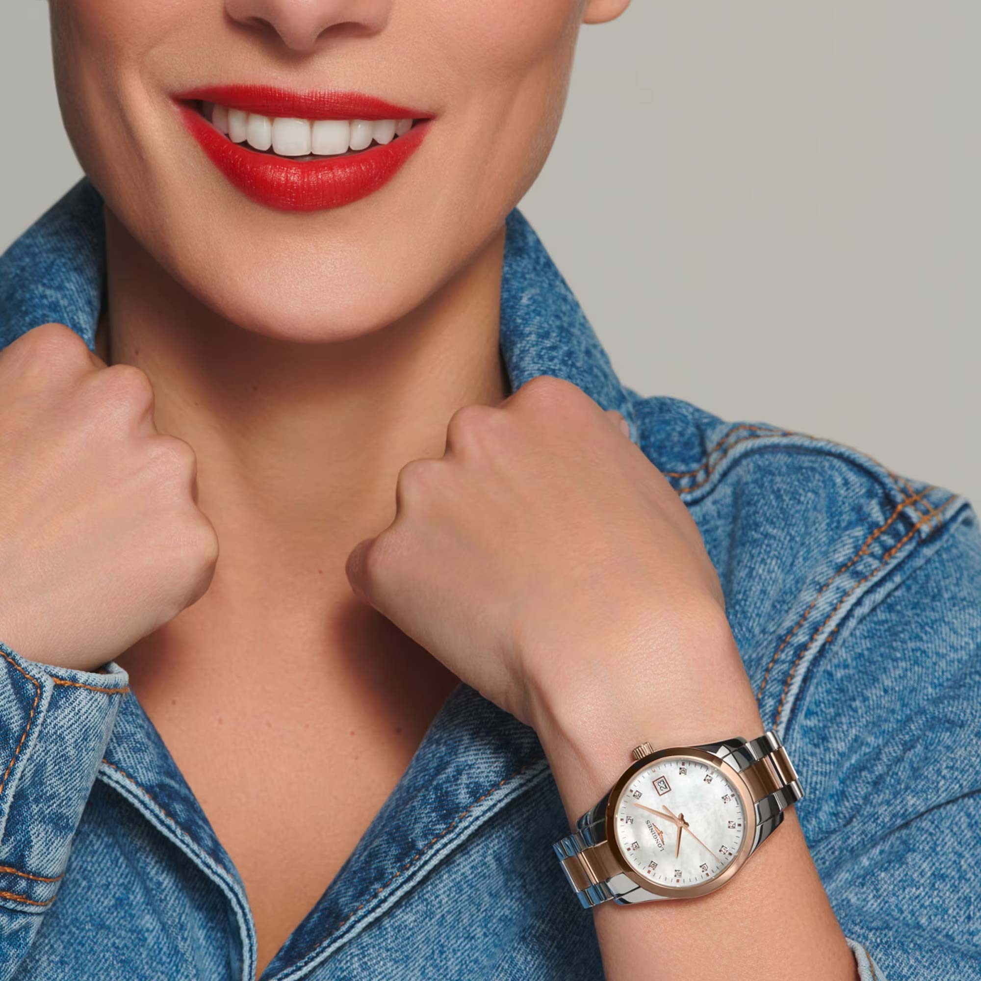 The latest creations in the Conquest Classic line for Longines are both feminine and boldly contemporary. Designed to set the pace for a new modern women's day watch to successfully weave together different aspects of their lives. The mother-of-pearl pops with the rose gold plated hands and diamond dot hour markers with a subtle date function at the 3 o'clock position. Housed in a 34mm stainless steel and rose gold PVD coating, the dial is set beneath scratch resistant sapphire crystal with several layers of anti-reflective coating. The Conquest Classic model is presented on a stainless steel and PVD coated bracelet with a triple safety folding clasp and push-piece opening mechanism. Powered by a quartz calibre L156 movement with a special E.O.L movement. All Longines watches come with a 2 year international warranty and branded presentation packaging.