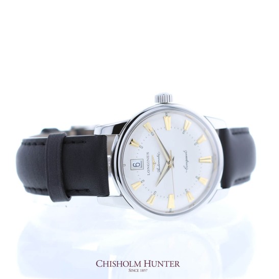 Since the beginning the designers at Longines have been inspired by the pioneering spirit, and the models in the Heritage Collection pay tribute to that. For many years Longines products have accompanied pioneers in their adventures in the air, on land and under the sea. Longines has taken the most remarkable of their former products and brought them to life again through cutting edge watchmaking technology. This mens Conquest Heritage model reflects refinement and elegance through it's 35mm round stainless steel case and large open Sunray silver dial. The dial features gilt hands and applied indices which feature Swiss Super-Luminova for easy readability, as well as a date window positioned at 12 o'clock. The Hesalite crystal glass that covers the dial is a nod to the original collection. This elegant model also features a screw down case back. A classic black leather strap with pin and buckle fastener completes the look. This timepiece is driven by an L633 self winding mechanical movement which offers 38 hours power reserve, and is also water resistant to 30 meters. All Longines watches are presented with a 2-year international warranty and Longines packaging.