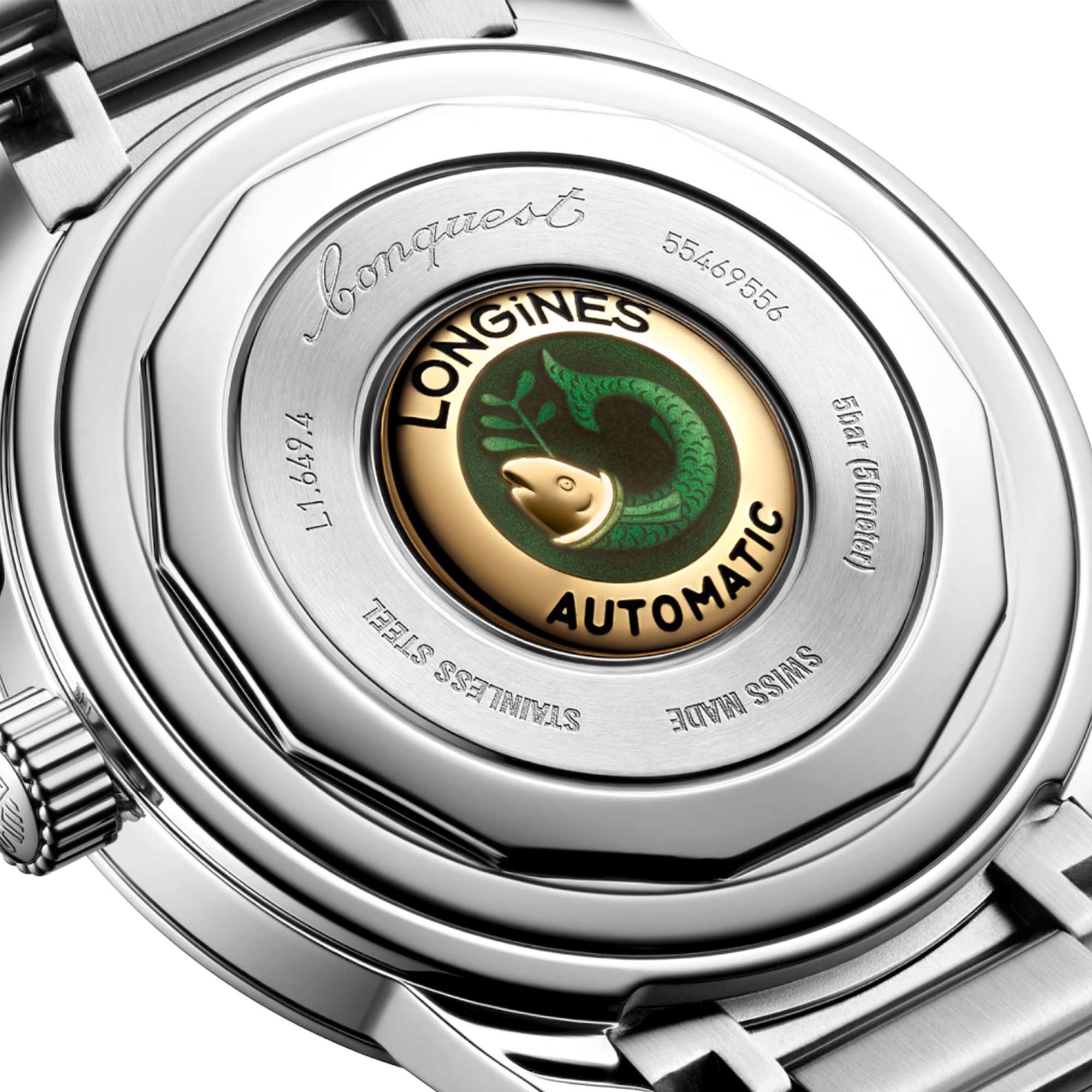 Self-winding mechanical movement beating at 25'200 vibrations per hour, with a monocrystalline silicon balance-spring power reserve up to 72 hours. 18ct gold medallion with fish, Water-resistant to 5 bar, Scratch-resistant sapphire crystal, with several layers of anti-reflective coating on both sides. Black lacquered polished dial, Swiss Super-LumiNova®. Stainless steel bracelet, With double security folding clasp with micro adjustment system.