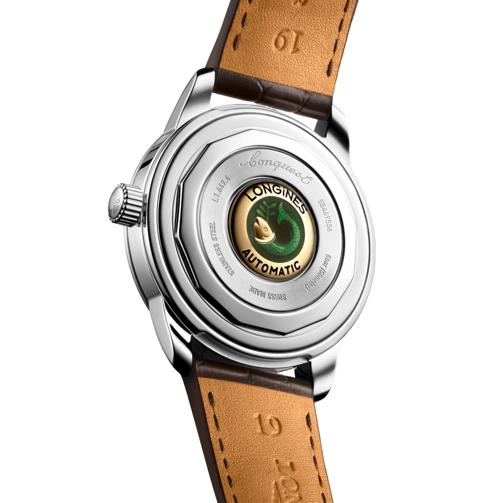 Self-winding mechanical movement beating at 25'200 vibrations per hour, with a monocrystalline silicon balance-spring power reserve up to 72 hours. 18ct gold medallion with fish, Water-resistant to 5 bar, Scratch-resistant sapphire crystal, with several layers of anti-reflective coating on both sides. Brown dial, Swiss Super-LumiNova®. Alligator strap bracelet, With buckle.