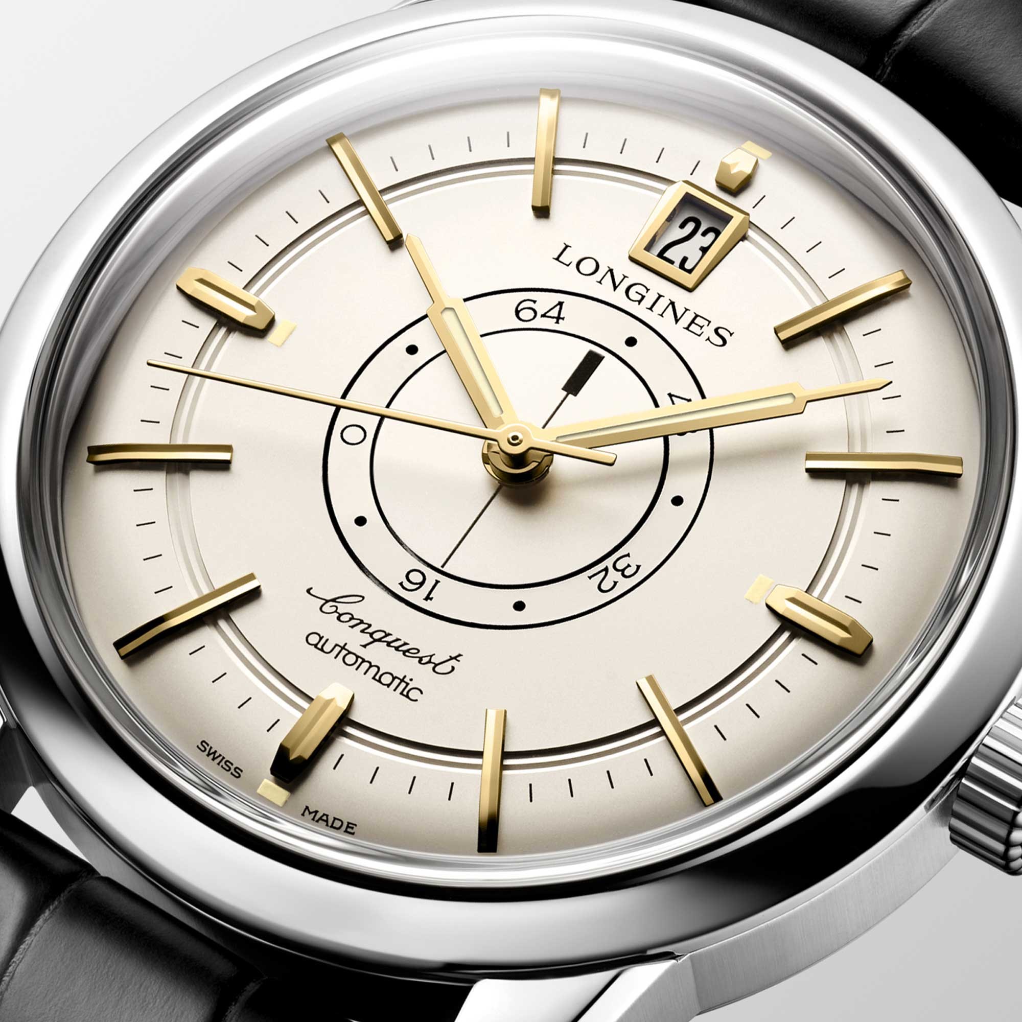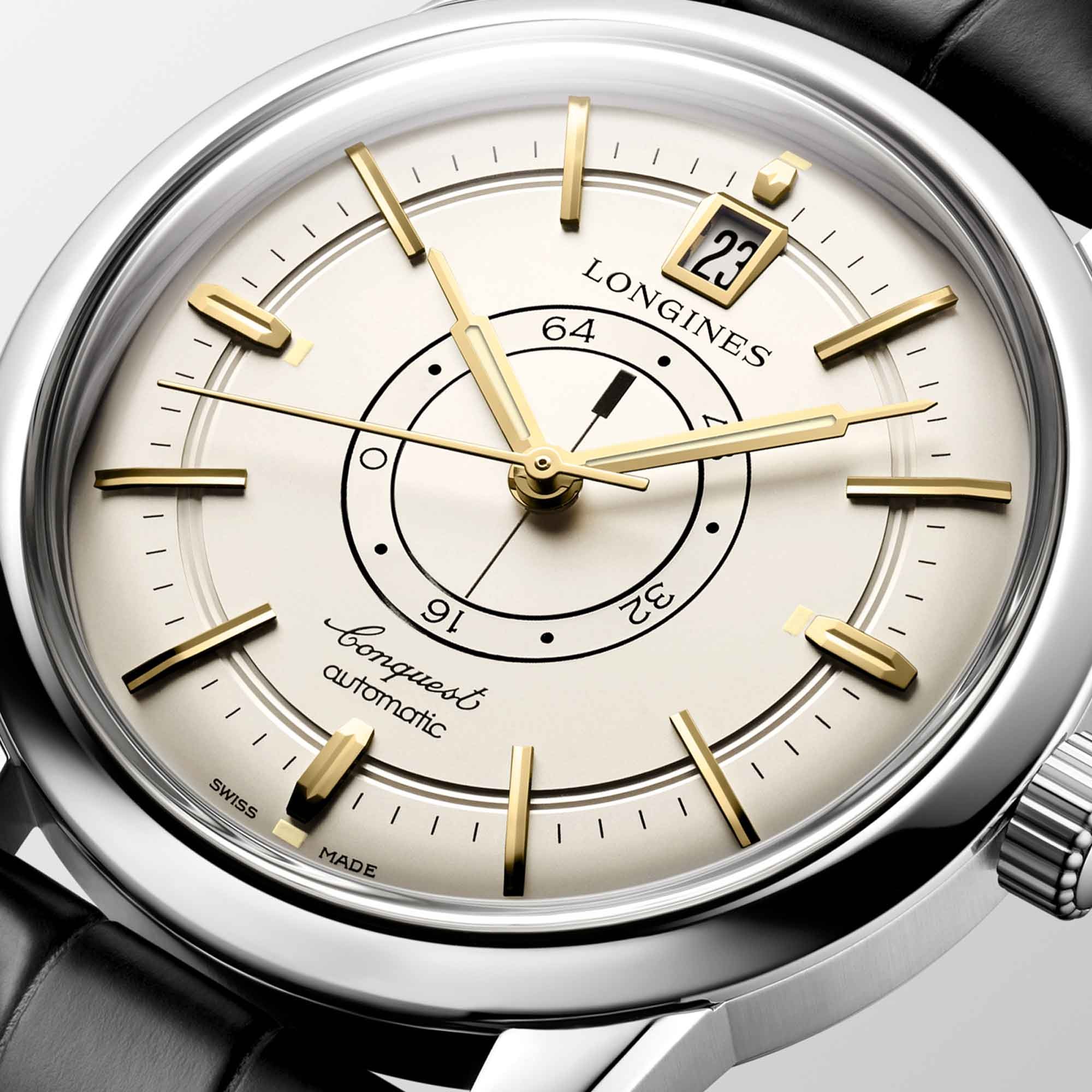 Longines is presenting the new CONQUEST HERITAGE CENTRAL POWER RESERVE in a 38 mm diameter case. Self-winding mechanical movement, exclusive Longines calibre L896.5 with power reserve on rotating discs in the centre of the dial. An iconic model revisited in a champagne dial paired with an integrated black alligator leather strap to mark the Conquest collection’s 70th anniversary.