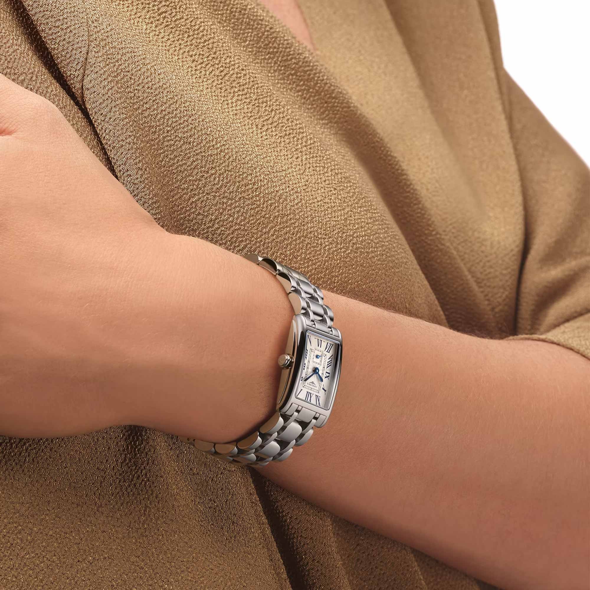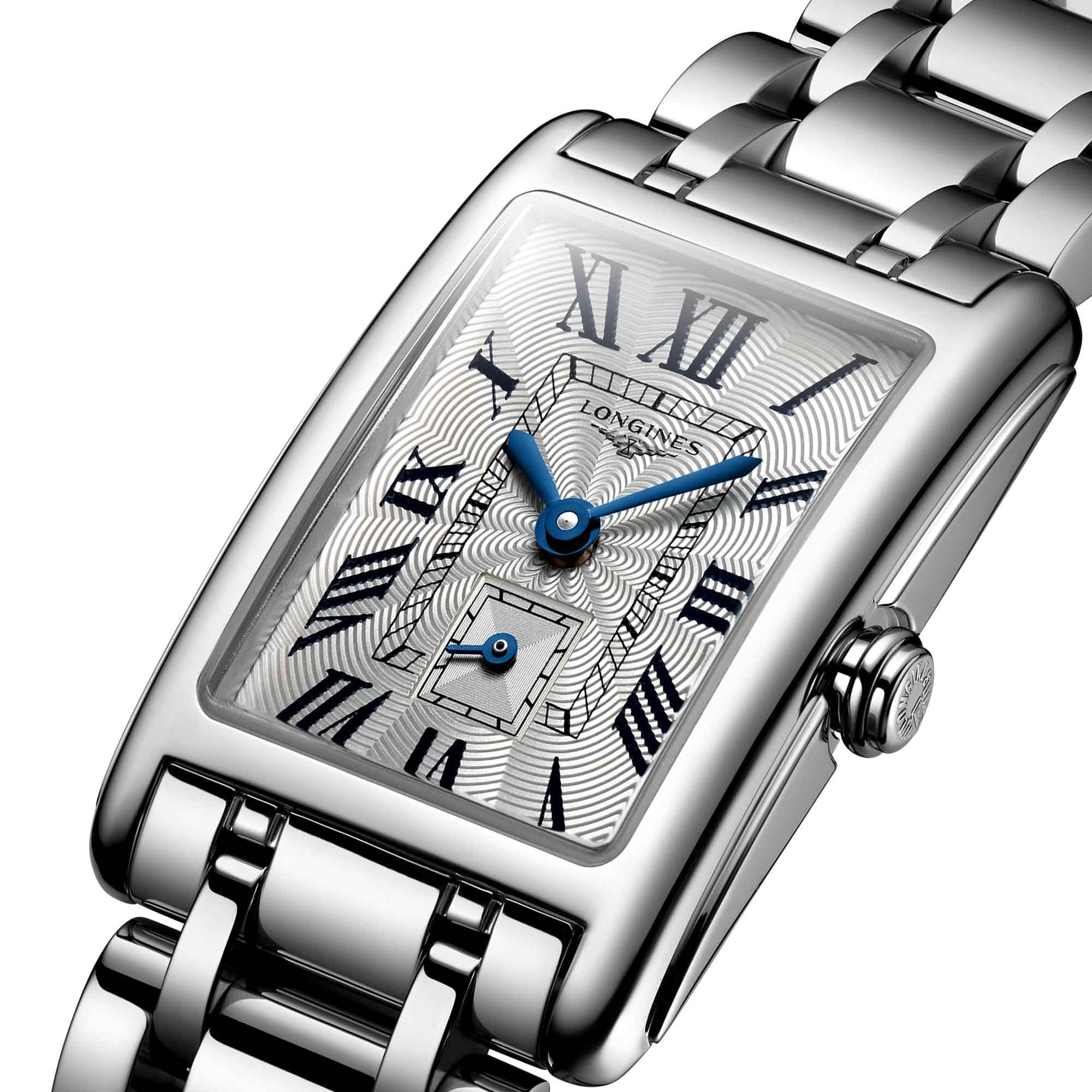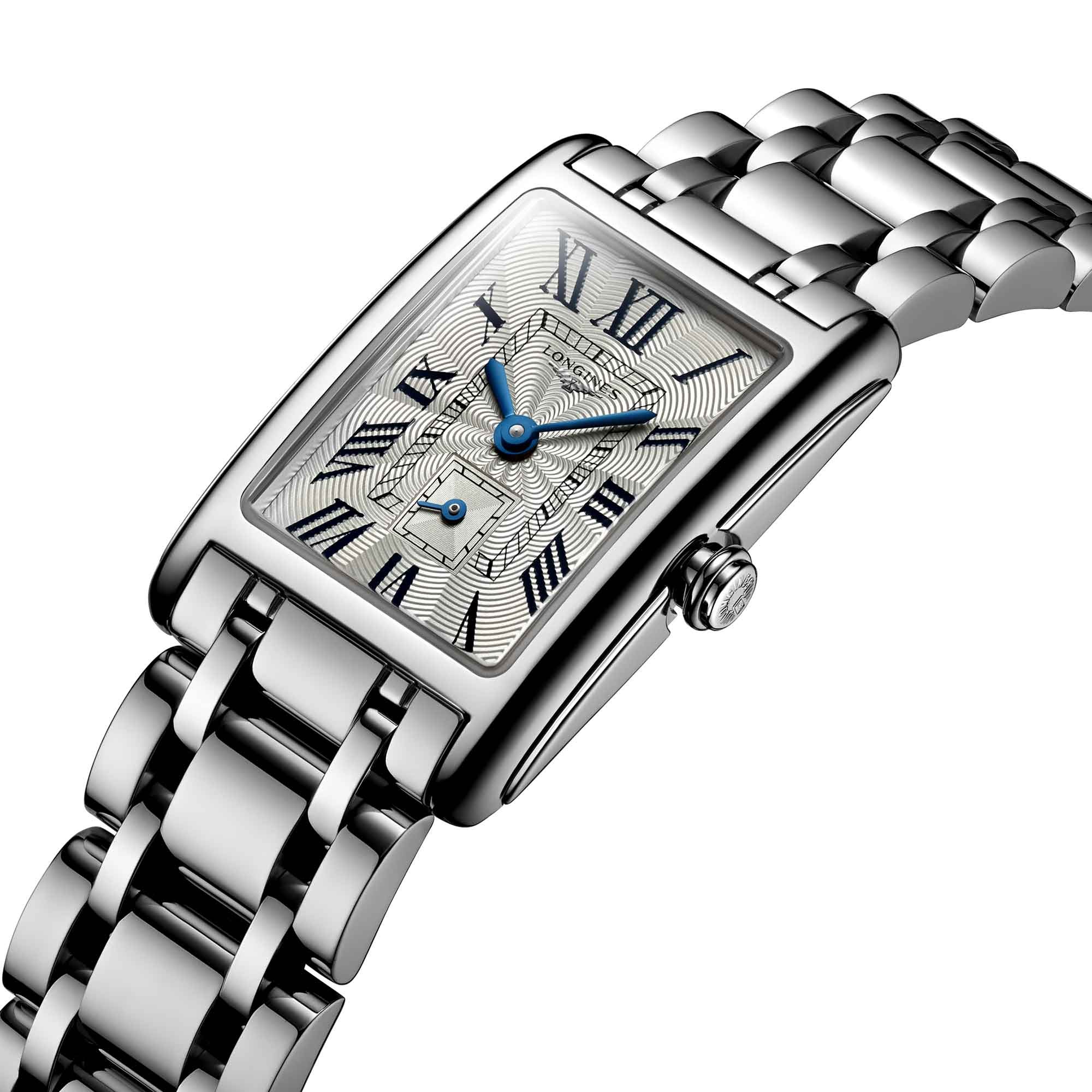 The Longines DolceVita collection is inspired by the Italian way of life, this ladies models reflects that, featuring a unique rectangular case with softened lines for an elegant feel. The rectangular shaped case offers a contemporary feel while maintaining the elegance of the original collection. The case measures 20.80 X 32.00 mm and surrounds a beautiful silver dial with "flinqué" detailing. The painted Roman numerals reflect the elegant shape of the case perfectly. Blue steel hands complete the look along with a small seconds dial positioned at 6 o'clock. Scratch resistant sapphire crystal covers the dial. These sleek lined transition smoothly into the stainless steel bracelet, secured with triple safety folding clasp and push-piece opening mechanism. The watch is driven by a L178 Quartz movement and allows for water resistant to 30 meters. All Longines watches are presented with a 2-year international warranty and Longines packaging.