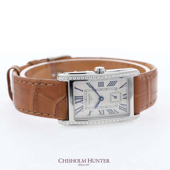 Complete your look with a watch from the stylish DolceVita collection by Longines at Chisholm Hunter. The Longines DolceVita 23mm Ladies Watch L5.512.0.71.4 model features a 23mm x 37mm case, crafted from stainless-steel. The silver dial features roman numeral indexes and is complemented by classic blue hands. Powered by a quartz movement and water resistant up to 30 metres. Presented on a tan alligator leather strap with interchangeable system.
