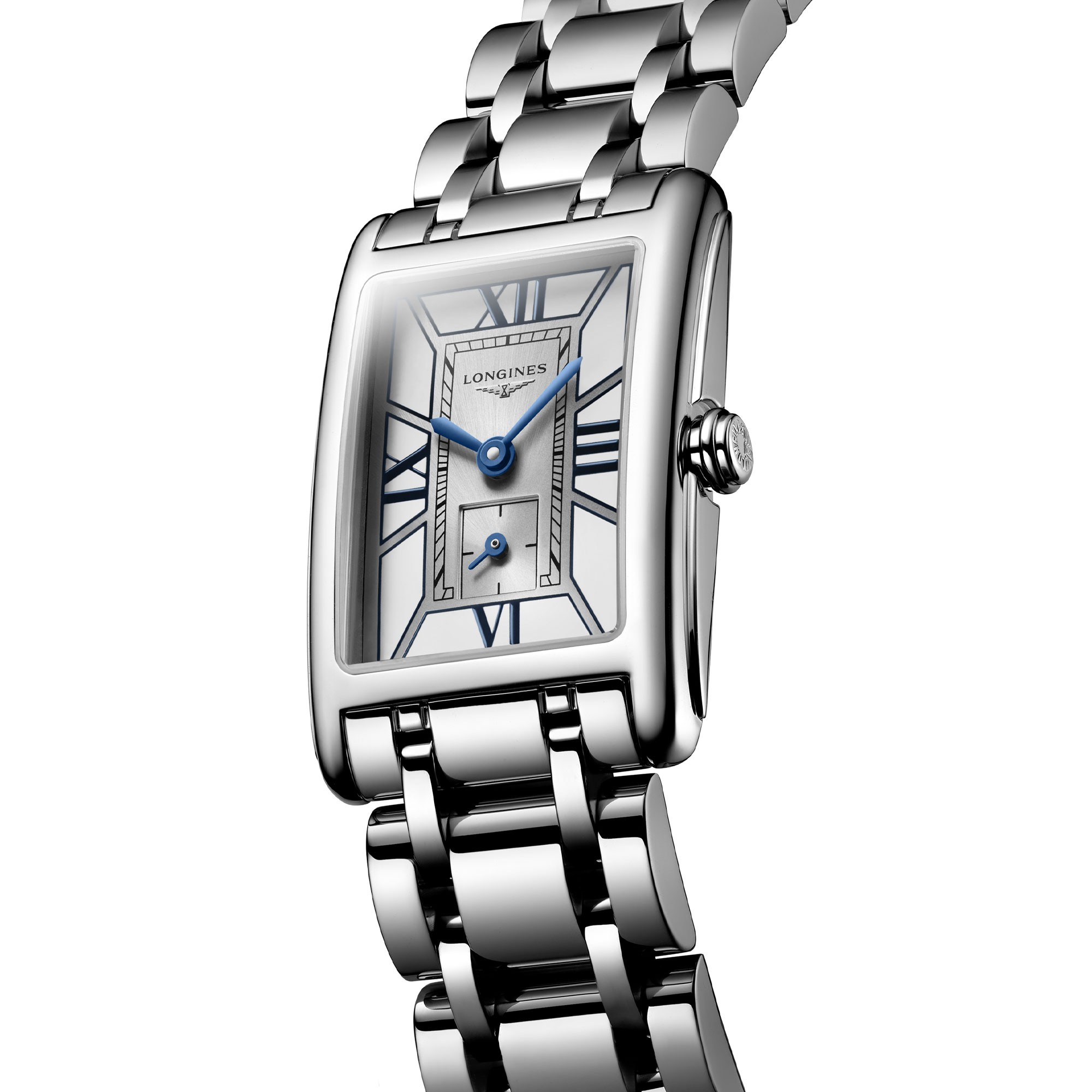 Since its inception, the Longines DolceVita collection has illustrated contemporary elegance of the Longines watchmaking brand worldwide. Inspired by the "Dolce Vita", it is an homage to the sweetness of life. Featuring a rectangular 20.80mm x 32.00mm steel case with white dial, this classic ladies timepiece is complete with blue painted Roman numeral indexes and blue steel hands. Presented on a steel, slimline bracelet strap and powered by a quartz movement, this ladies watch reflects the Italian way of life through timeless elegance.