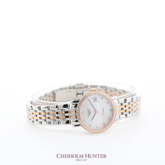 Since the beginning Longines watches have always exemplified elegance. The elegance collection perfectly communicates the slogan "Elegance is an attitude" through a range of self winding models which reflect classical design and sleek lines. This ladies model offers elegant luxury with its 25.50mm case with stunning 18k pink gold and set with 52 Top Wesselton IF-VVS diamonds, for a total of 0.353 carats. Within this sits a white mother of pearl dial. Simple black hands, a date window positioned at 3o'clock and 12 Top Wesselton VS-SI diamond indices which total of 0.026 carats, complete the look. The luxury pink gold details continue down onto the bracelet, fastened with a triple safety folding clasp and push-piece opening mechanism. Scratch resistant sapphire crystal offers ultimate protection to both the dial, and to the transparent case back, which allows a view of the expertly crafted L592 self-winding mechanical movement. This timepiece offers both 40 hours power reserve, and water resistance to 30 meters. All Longines watches are presented with a 2-year international warranty and Longines packaging.