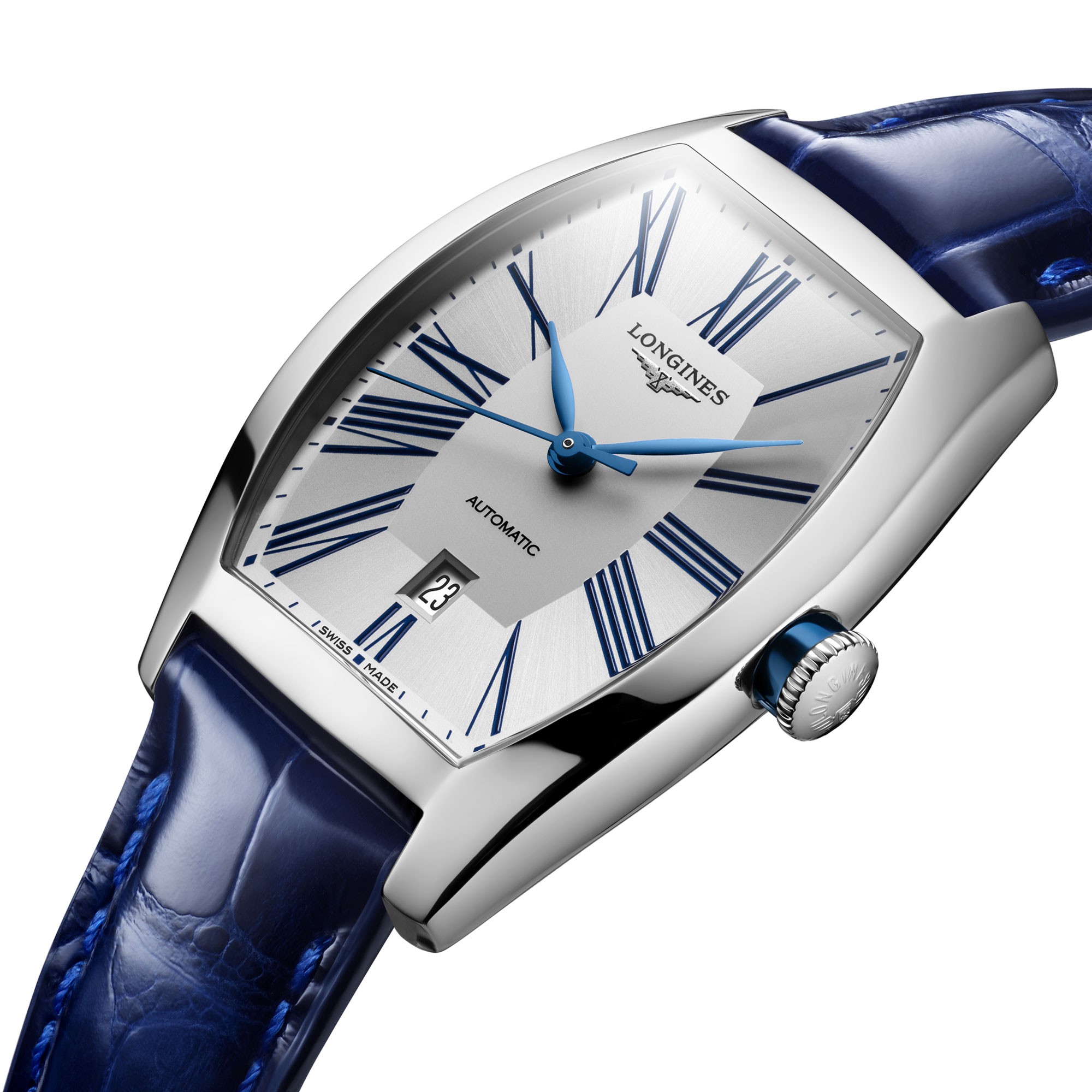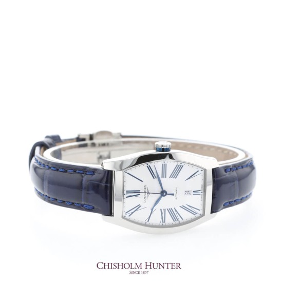 Inspired by the 1920s, the Longines Evidenza Ladies Watch L2.142.4.70.2 is the latest addition to our collection of luxury Longines watches at Chisholm Hunter. This model features a 26mm x 30mm tonneau case, masterfully crafted from stainless steel. The silver dial is accented with slim, deep blue roman numerals and a date window at the 6 o’clock position and is protected by scratch-resistant sapphire crystal glass, with several layers of anti-reflective coating. Powered by an automatic movement and water resistant up to 30 metres. Presented on a blue leather strap.