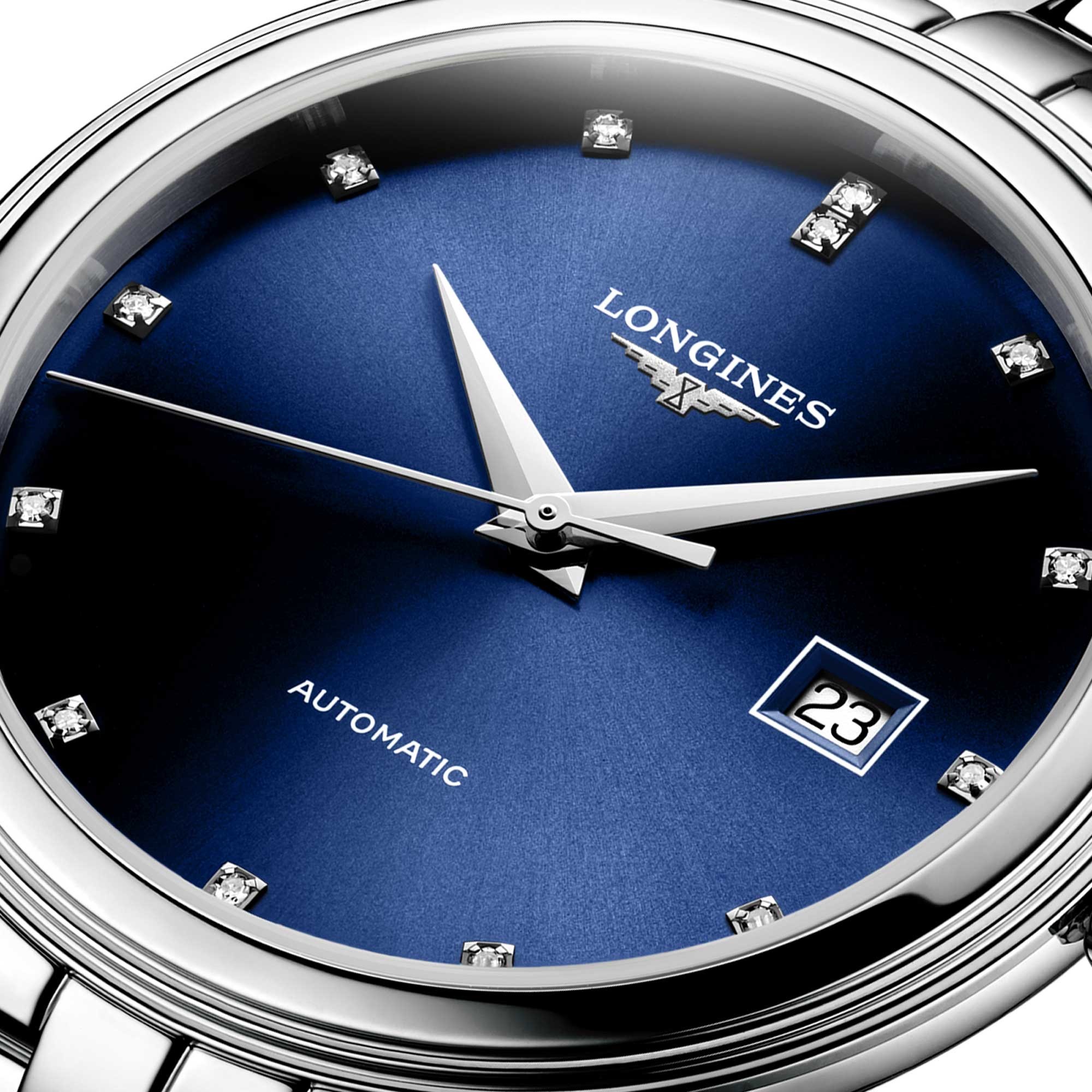 The Longines Flagship Classic 40mm Automatic Watch L4.984.4.97.6 embodies elegance and precision. Designed for him, it features a striking blue dial adorned with exquisite diamond hour markers, enhancing its luxurious aesthetic. The watch operates on a reliable automatic movement, ensuring accurate timekeeping.