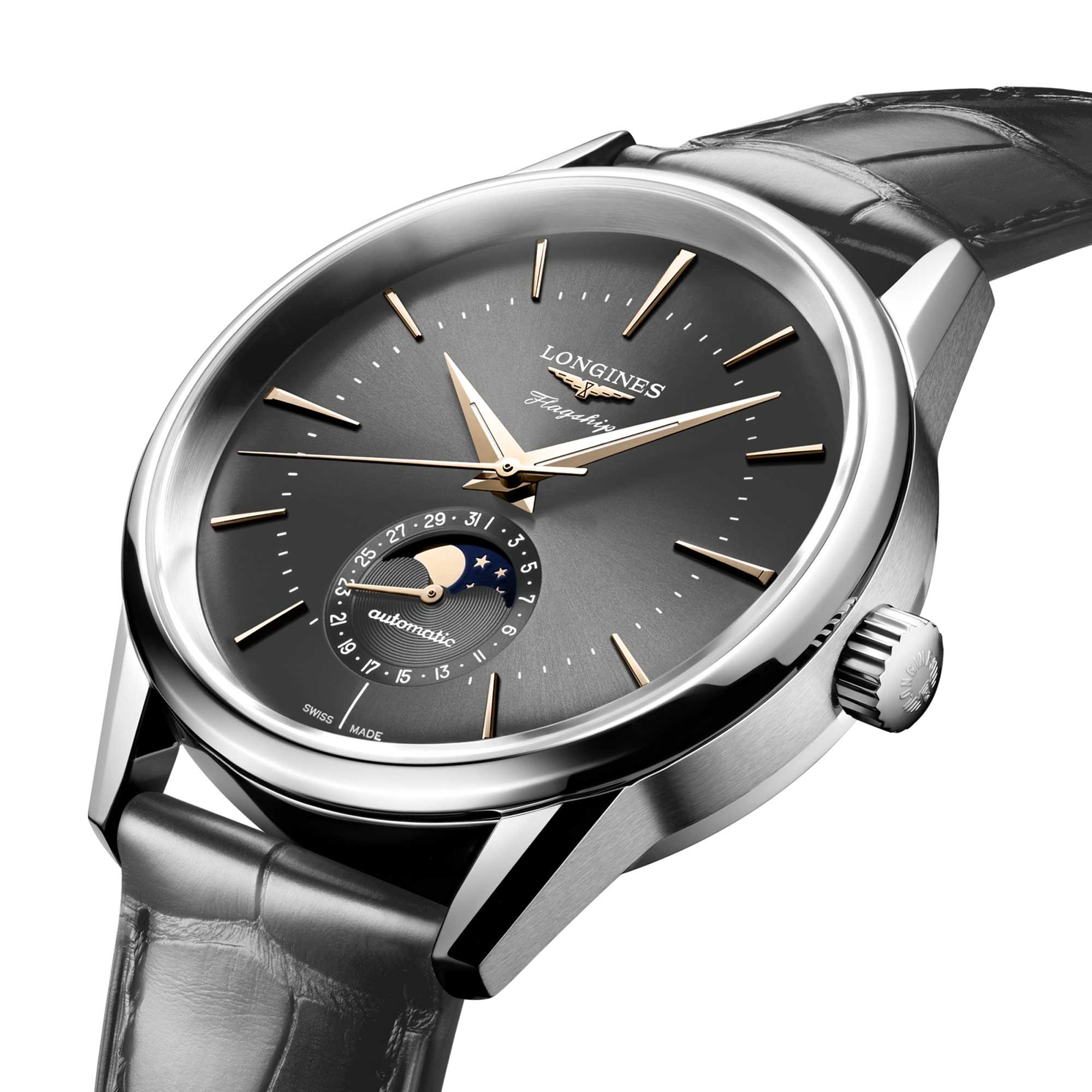 This model with a domed anthracite sunray dial is equipped with a moonphase complication, with a date hand at 6 o’clock. It is powered by an exclusive Longines calibre L899.5 equipped with a silicon balance-spring and is resistant to magnetism. The steel case has a diameter of 38.5 mm. It has a satin-brushed finish, with shortened and chamfered lugs.