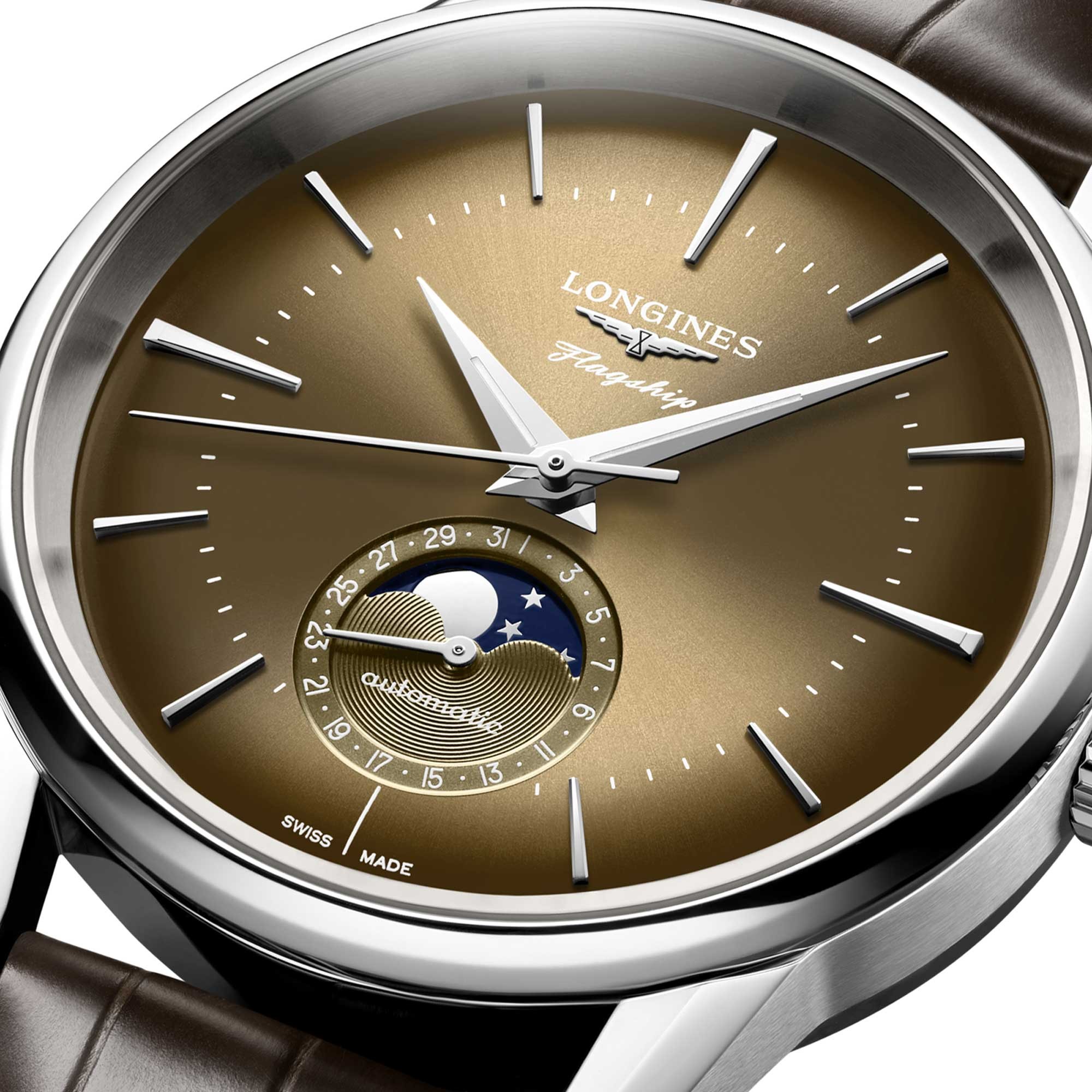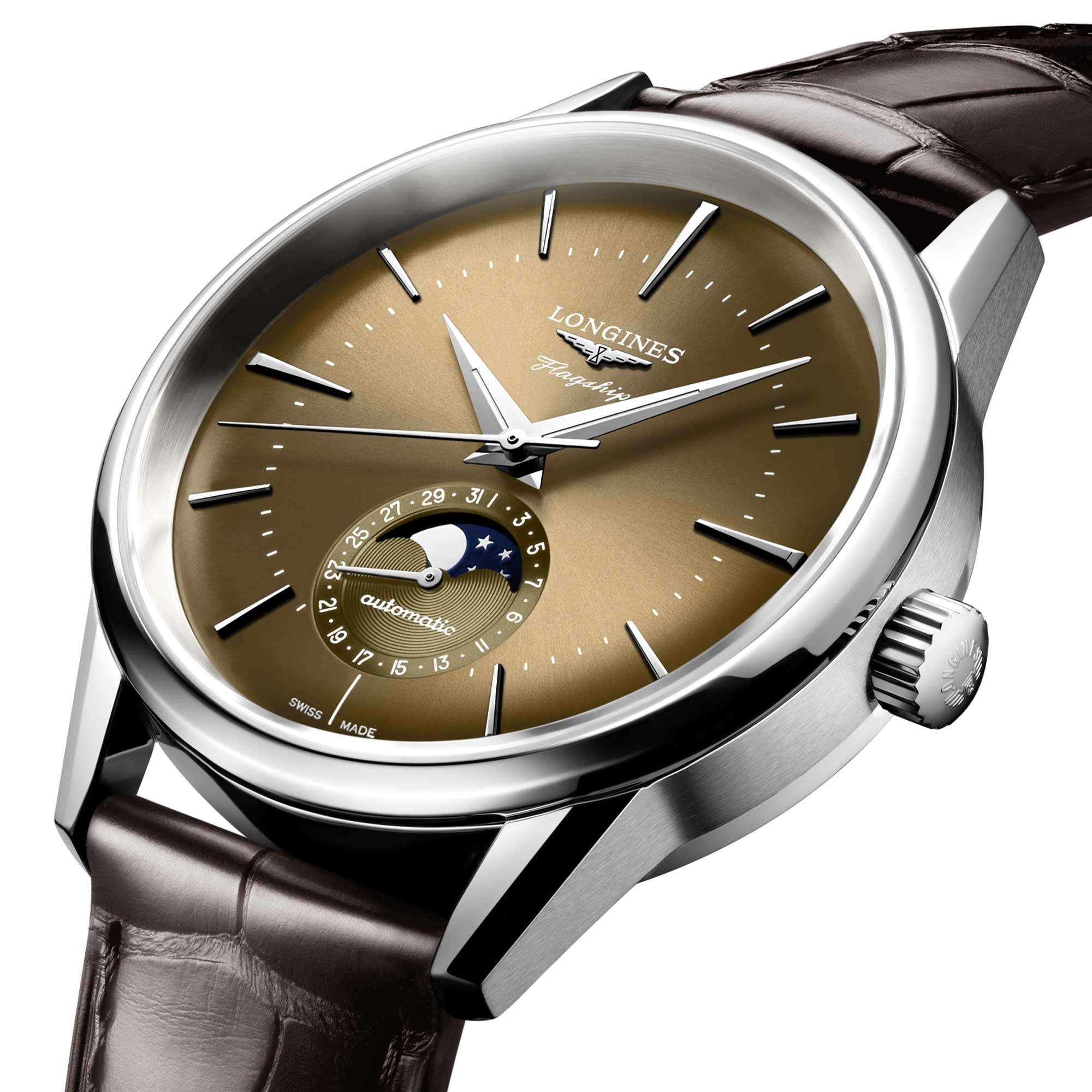 This model with a domed Havana beige sunray dial is equipped with a moonphase complication, with a date hand at 6 o’clock. It is powered by an exclusive Longines calibre L899.5 equipped with a silicon balance-spring and is resistant to magnetism. The steel case has a diameter of 38.5 mm. It has a satin-brushed finish, with shortened and chamfered lugs.