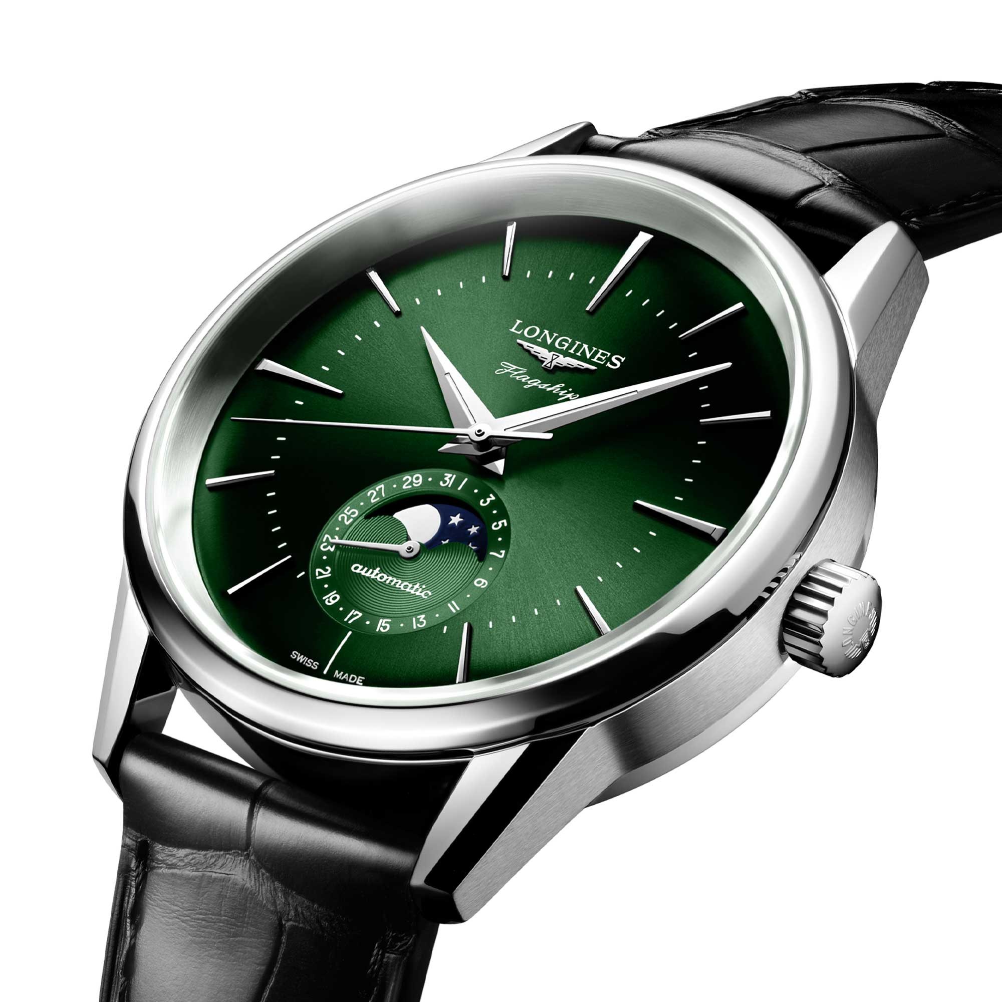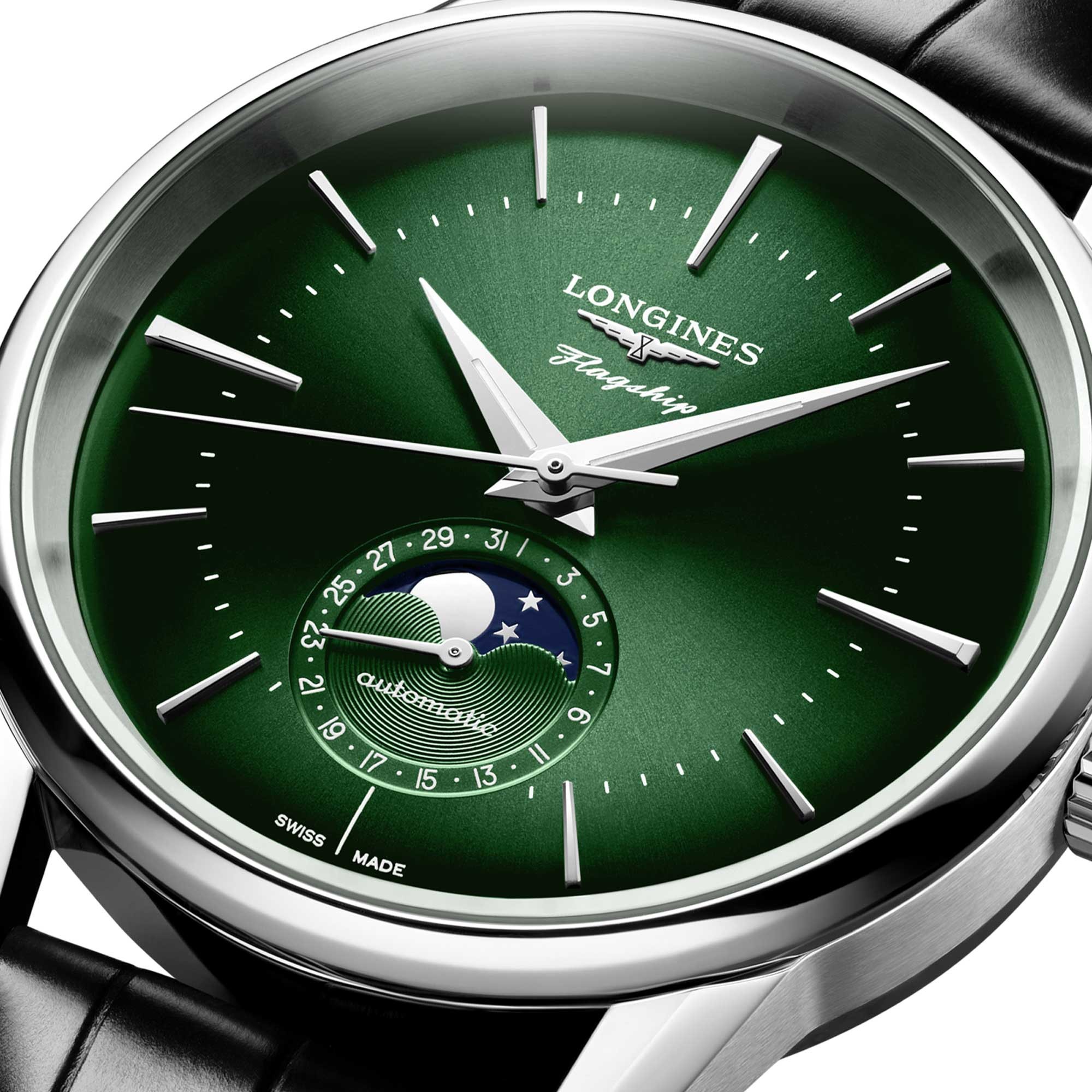 This model with a domed green sunray dial is equipped with a moonphase complication, with a date hand at 6 o’clock. It is powered by an exclusive Longines calibre L899.5 equipped with a silicon balance-spring and is resistant to magnetism. The steel case has a diameter of 38.5 mm. It has a satin-brushed finish, with shortened and chamfered lugs.