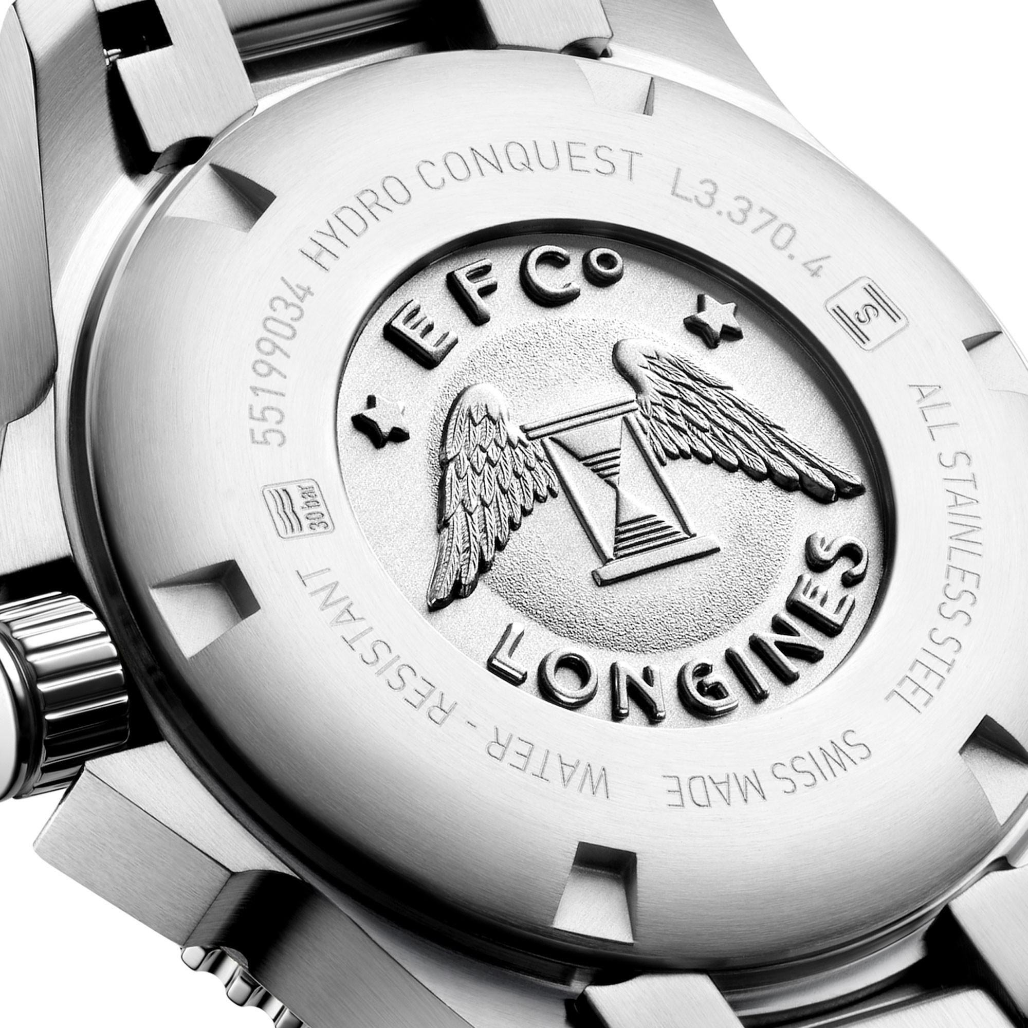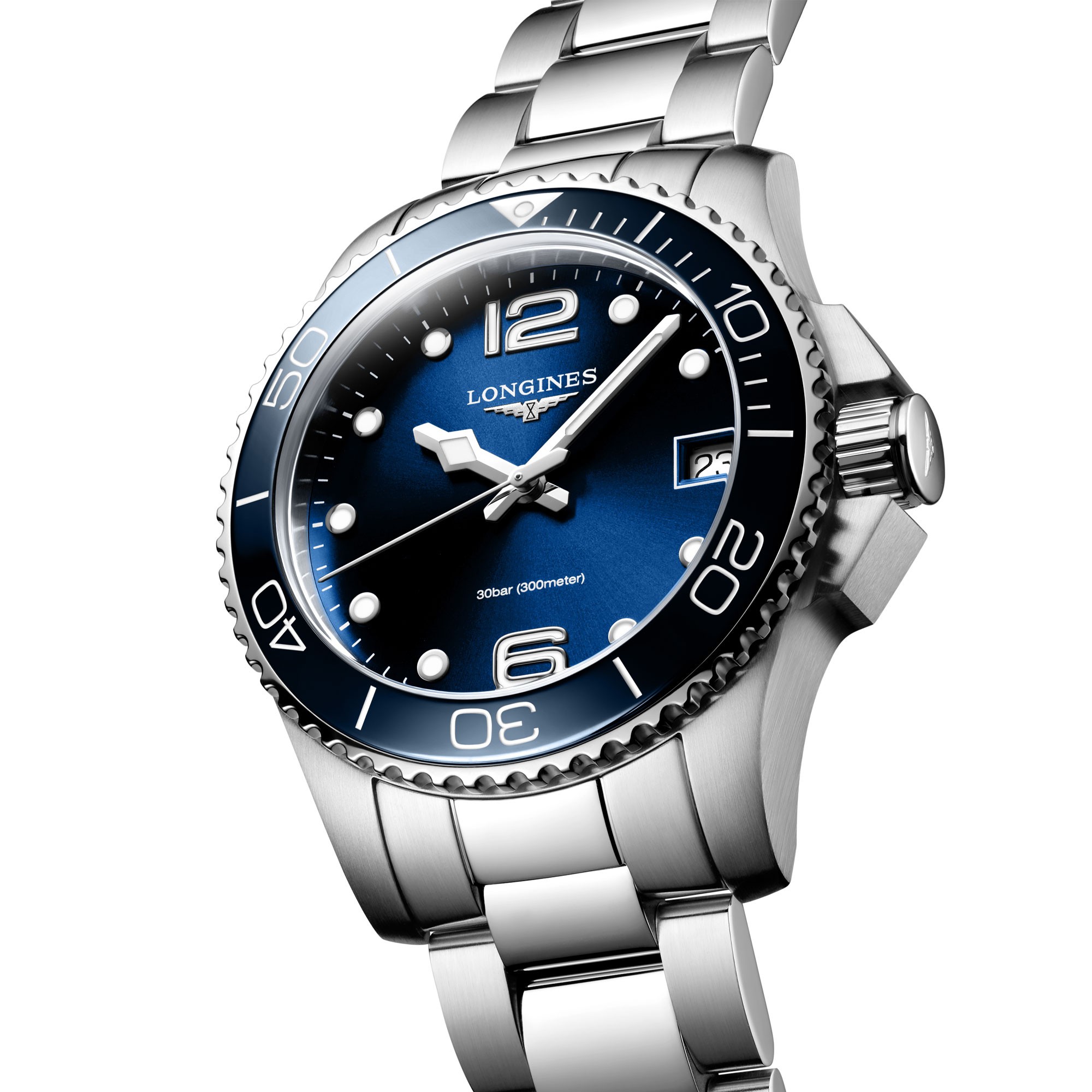 Discover the Longines HydroConquest 32mm Ladies Watch L33704966 today at Chisholm Hunter. A classic and sleek timepiece with a strong focus on balancing performance and style. Presented on a stainless steel bracelet and finished with a double fold over concealed clasp. The 32mm stainless steel and ceramic case features an electric blue dial with stainless steel hands and hour markers and a date window displayed at 3'oclock. Powered by a quartz movement and covered by scratch-resistant sapphire crystal to protect the dial.
