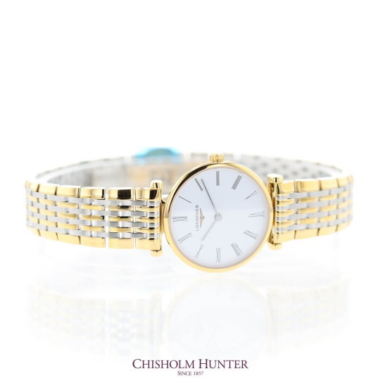 LA Grande Classique De Longines maintains all the characteristics of the original collections and displays the widely recognisable winged hourglass logo. This elegance is reflected in this ladies model with it's 24mm slim case profile with yellow PVD coating. The classic round shape showcases a beautiful dial with painted Roman numerals and simple black hands. All of this protected by scratch resistant sapphire crystal. The Timeless T-bar shape follows down to a stainless steel and Yellow PVD coated strap with a triple folding safety clasp and push-piece opening mechanism. This classic timepiece is reliably driven by an L209 Quartz movement, and is perfect for all occasions. All Longines watches are presented with a 2-year international warranty and Longines packaging.