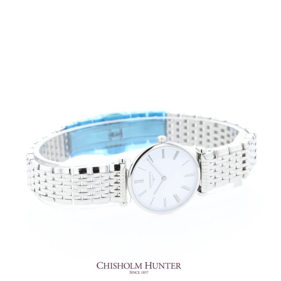 Le Grande Classique de Longines embodies classic elegance while maintaining all of the recognisable characteristics of the original collections that inspired it, including displaying the widely recognisable winged hourglass logo. This elegant ladies timepiece reflects those characteristics with its classically slim and round 24mm polished stainless steel case. This elegant shape showcases a classic white dial, with traditional painted Roman numerals and simple black hands, all protected by a scratch resistant sapphire crystal. This elegant feel continues down to the bracelet, with triple safety folding clasp and push-piece opening mechanism. This elegant piece is water resistant to 30 meters, and powered by an L209 Quartz movement. All Longines watches are presented with a 2-year international warranty and Longines packaging.