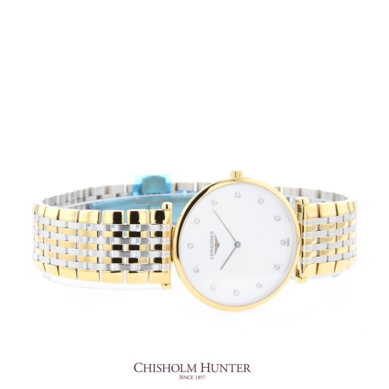 Le Grande Classique de Longines embodies classic elegance while maintaining all of the recognisable characteristics of the original collections that inspired it, including displaying the widely recognisable winged hourglass logo. This model has maintained the traditional aspects of the collection while offering a contemporary feel through its specially designed slim round stainless steel 33mm case with yellow PVD coating. A stunning white mother of pearl dial features simple black hands as well as 12 Top Wesselton VS-SI diamonds indices totalling 0.081 carats. The dial is protected with scratch resistant sapphire crystal. The T-bar design leads onto a finely crafted stainless steel bracelet with yellow PVD coated details, complete with triple safety folding clasp and push-piece opening mechanism. This model is reliably powered by an L420 Quartz movement, and is also water resistant to 30 meters. All Longines watches are presented with a 2-year international warranty and Longines packaging.