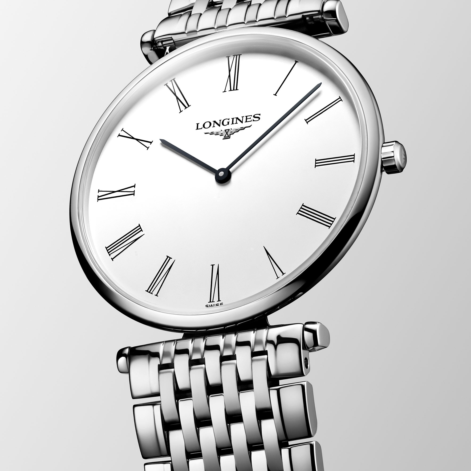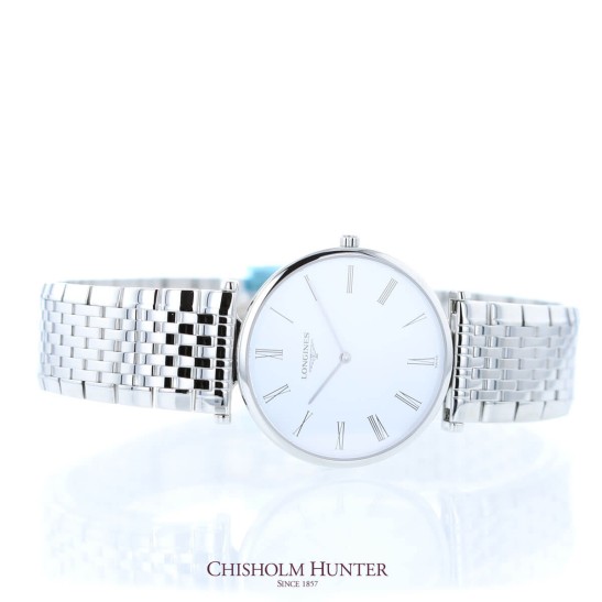 Le Grande Classique de Longines embodies classic elegance while maintaining all of the recognisable characteristics of the original collections that inspired it, including displaying the widely recognisable winged hourglass logo. This model has maintained the traditional aspects of the collection while offering a contemporary feel through its specially designed slim round stainless steel 33mm case, allowing for an open classically white dial with painted Roman numerals and simple black hands. This dial is protected with a scratch resistant sapphire crystal. The elegant simplicity of this model continues in the T-bar design down to the finely crafted stainless steel bracelet, finished with a triple safety folding clasp and push-piece opening mechanism. This model is reliably powered by an L420 Quartz movement, and is also water resistant to 30 meters. All Longines watches are presented with a 2-year international warranty and Longines packaging.
