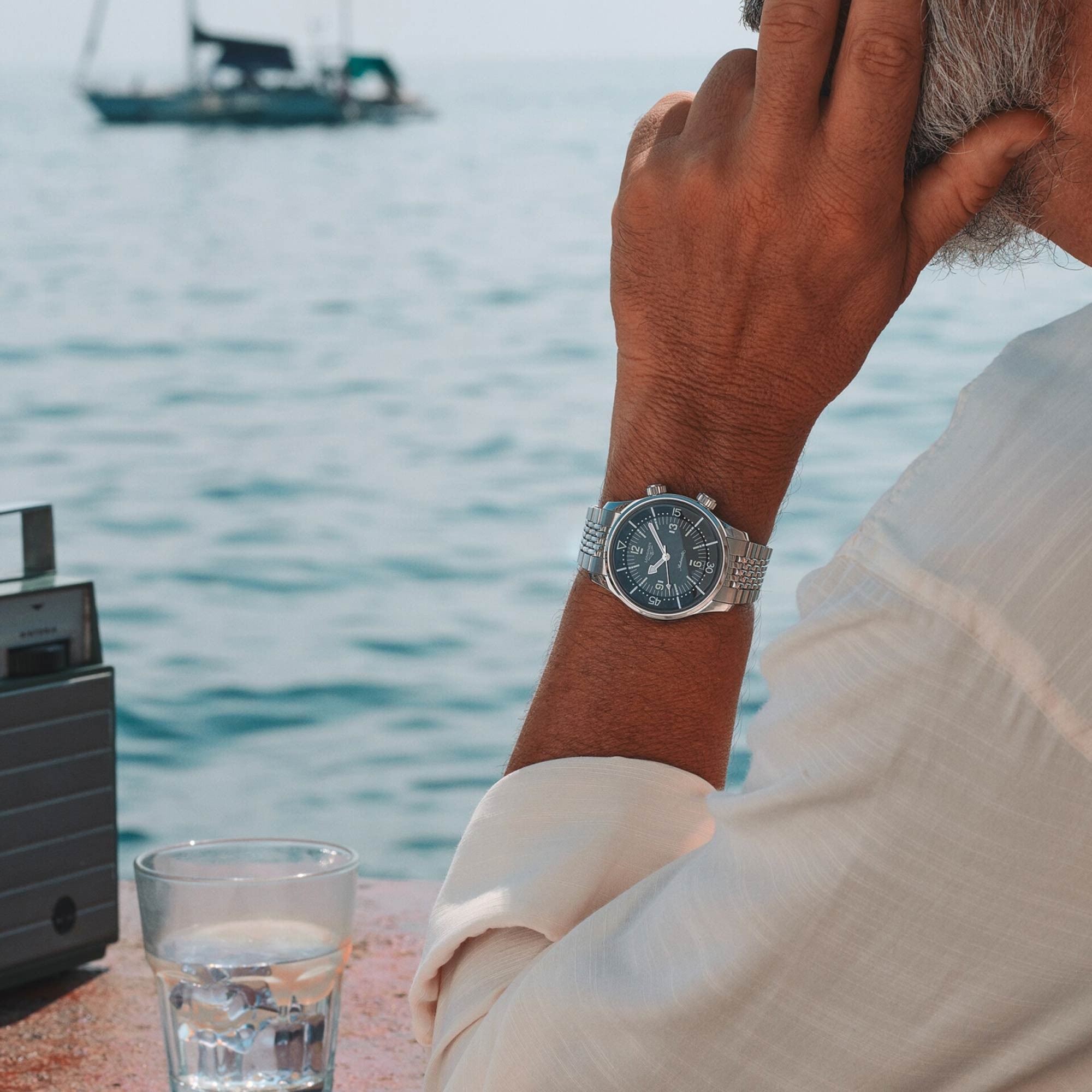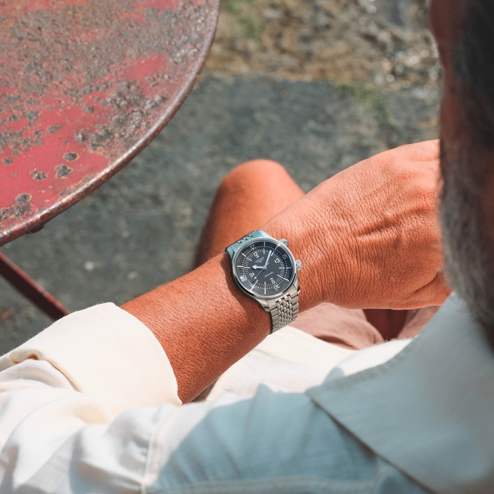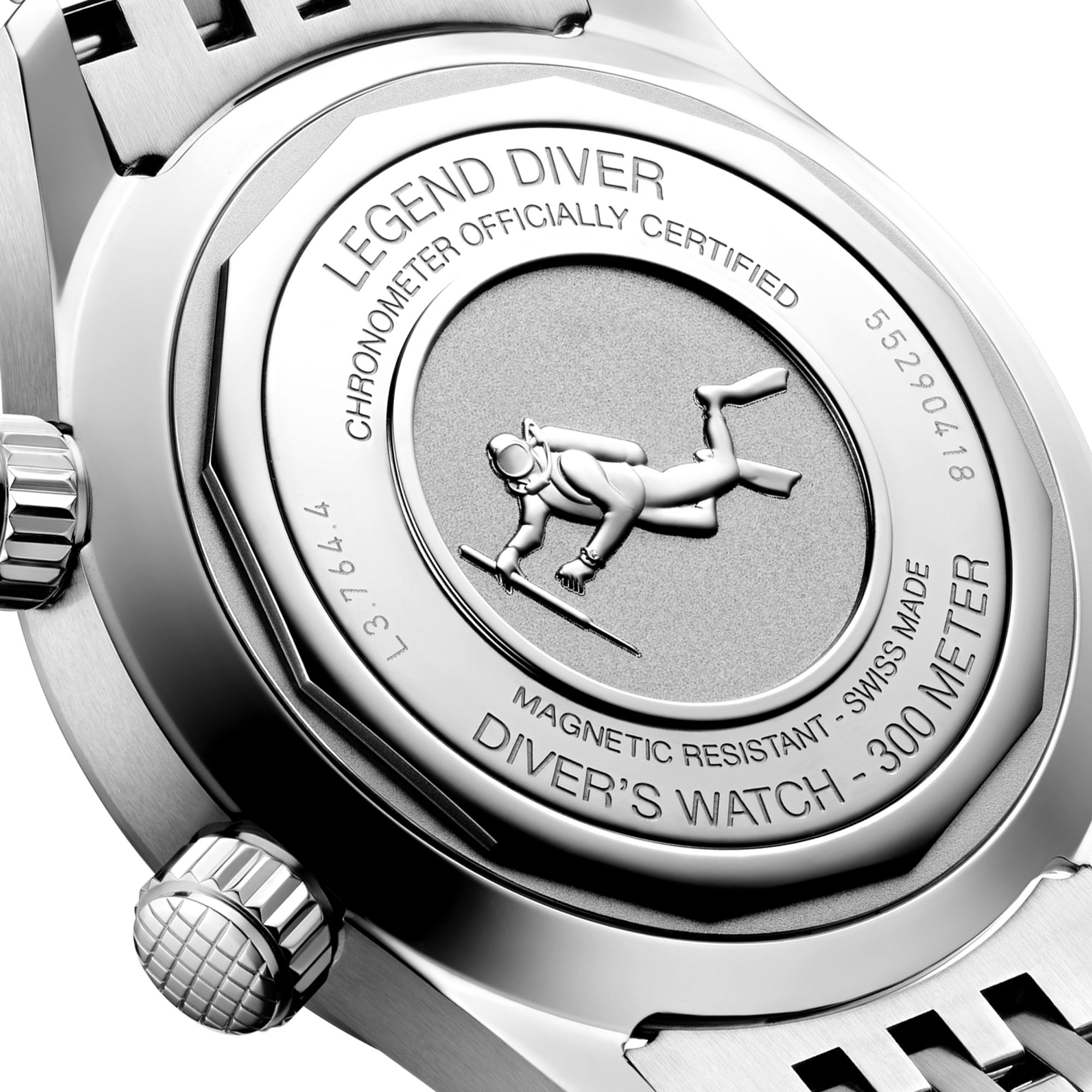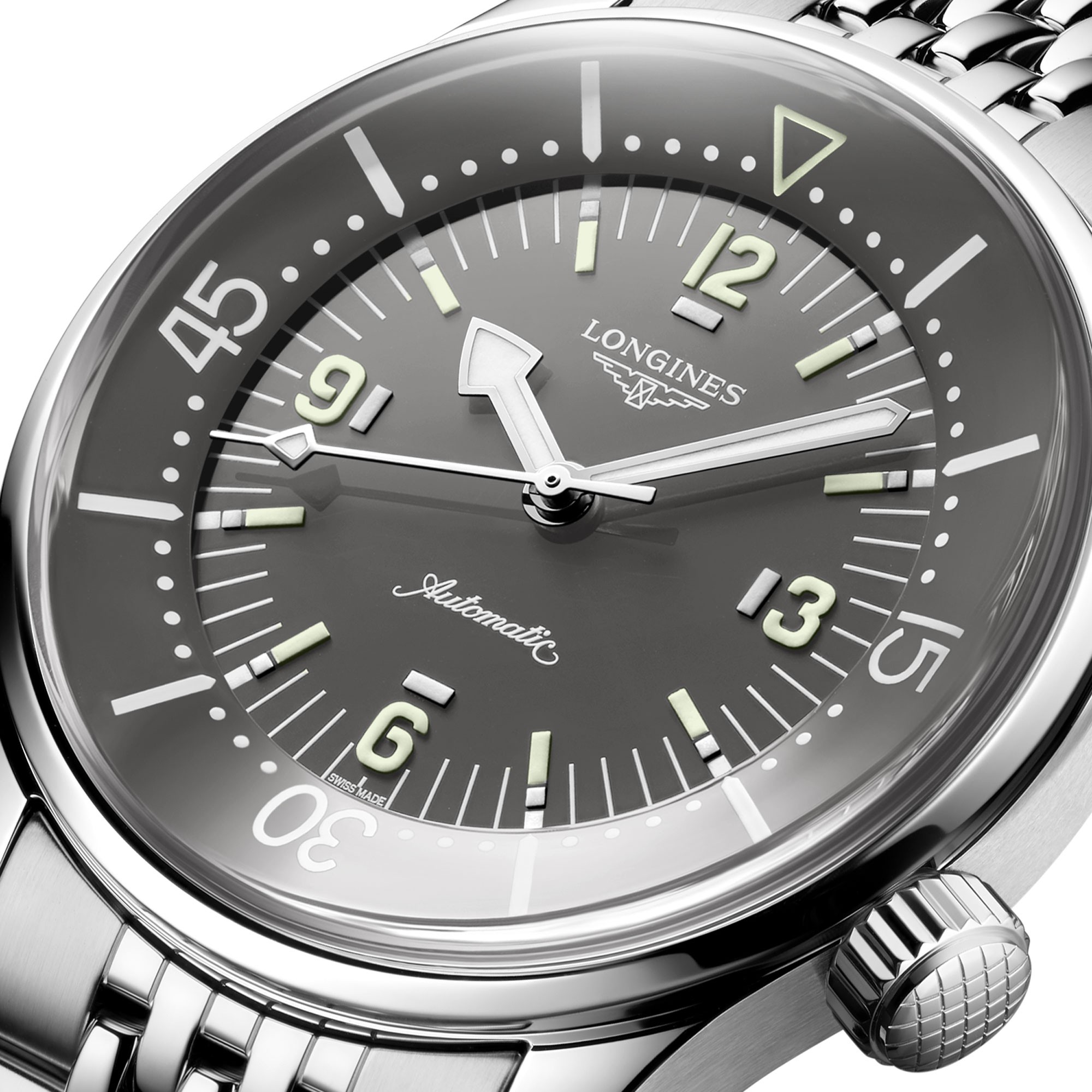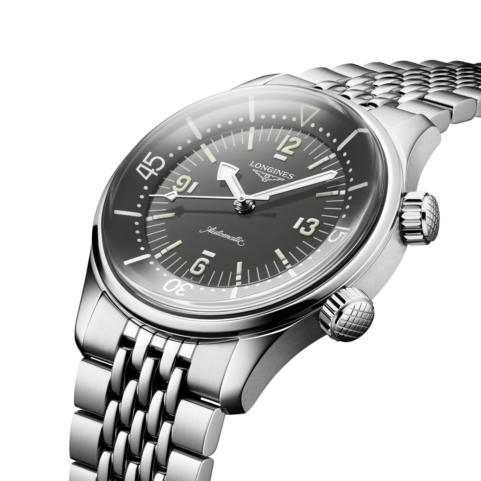 With its timeless design and cutting-edge  performance, the Longines Legend Diver has  been a veritable icon of the brand since 1959. This 39 mm-diameter model, certified as a divers' watch (ISO 6425) and water-resistant to 30 bar (300 m), is powered by an exclusive Longines calibre L888.6 equipped with a silicon balancespring and resistant to magnetic fields. This selfwinding mechanical movement offers a power reserve of up to 72 hours. The entire watch is chronometer-certified by the COSC. The elongated indexes and raised Arabic numerals are coated with Super‑LumiNova®, as are the polished rhodium-plated arrow hands. A figure of a diver, the symbol of the collection, is stamped on the perfectly angled screw-down case back. This model, with its anthracite-grey dial, is fitted with a stainless-steel bracelet fitted with a double-safety folding clasp with micro-adjustment