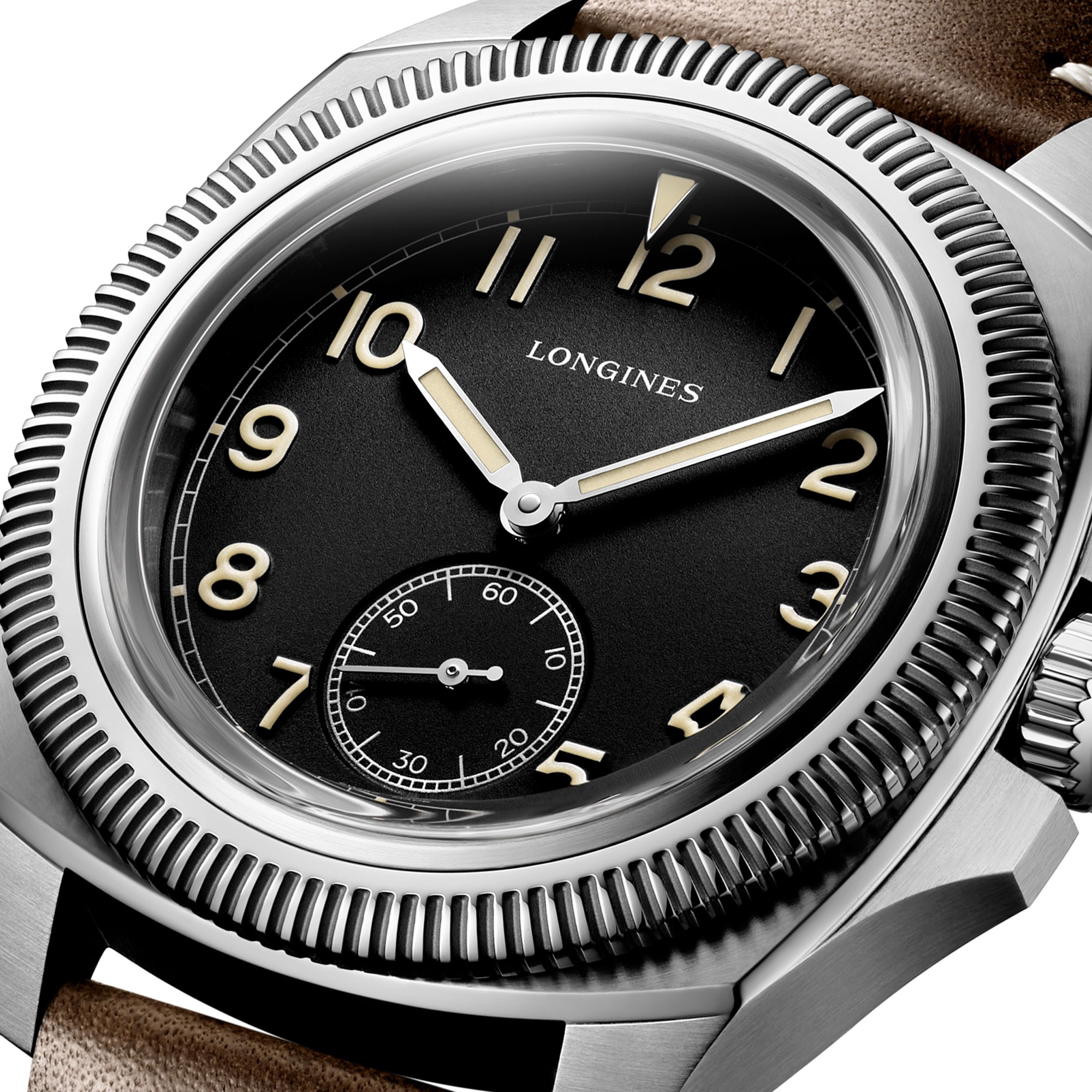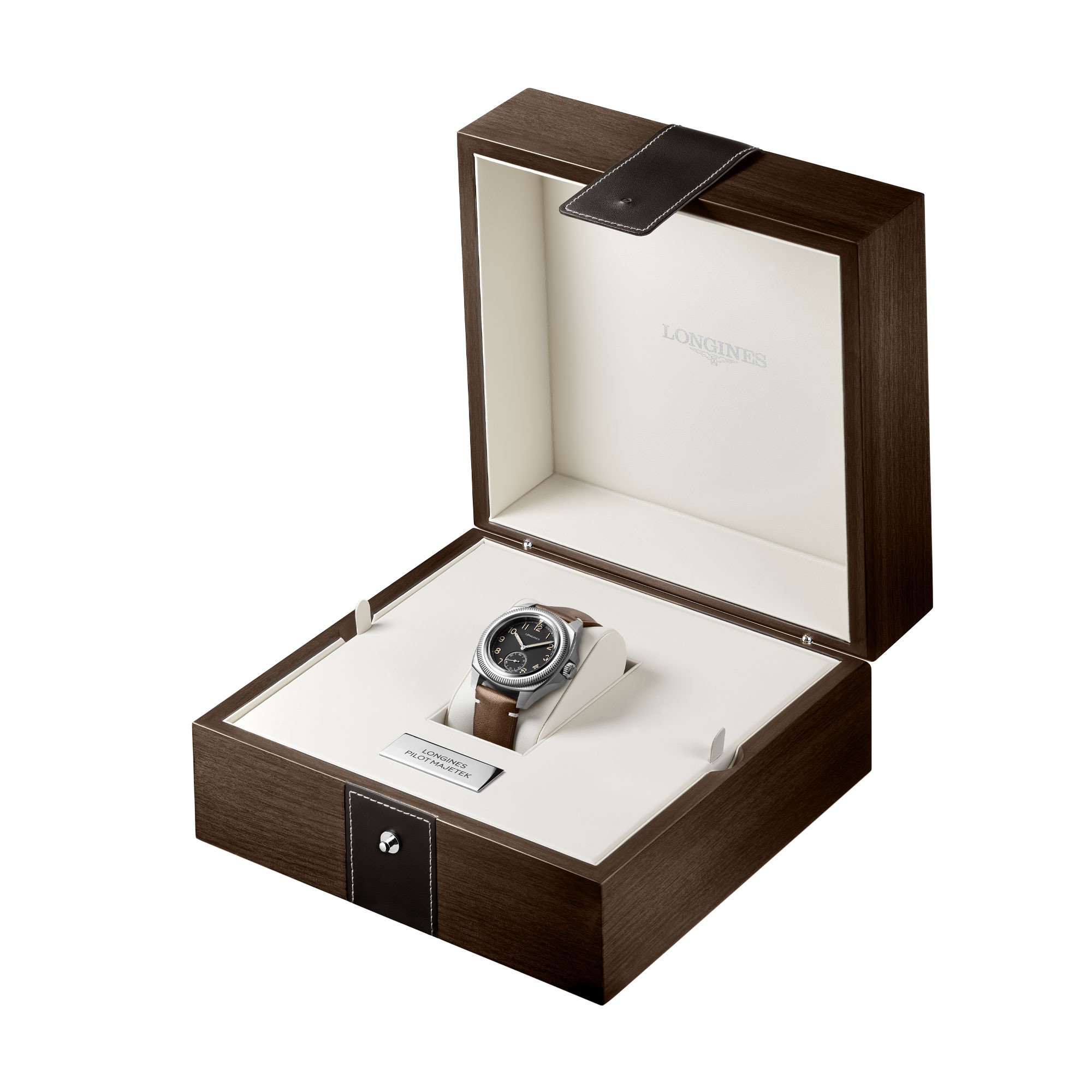 The Longines Pilot Majetek is all about uniqueness and distinctiveness. It is a watch with a strong history, a powerful design and impressive resistance, a watch that exudes strength. Its fluted rotating bezel with inner “Starting time indicator” was a key technical challenge that has been overcome. Powered by a mechanical Longines self-winding exclusive calibre, this version is fitted with a brown leather strap with beige stiches.