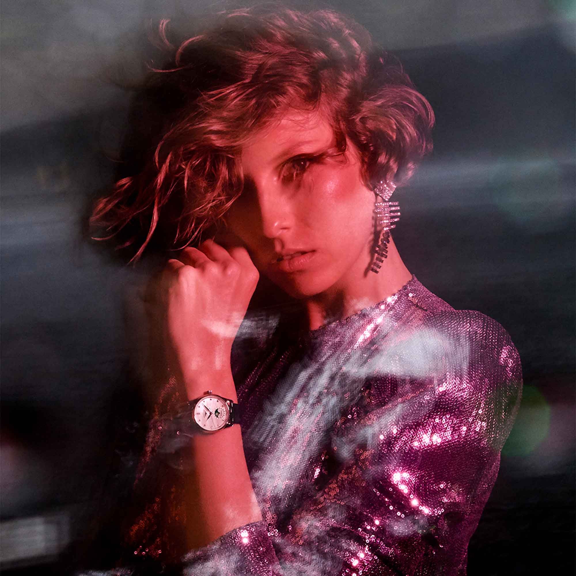 The heart of this masterpiece lies in its Automatic movement, a feature that ensures precision and reliability. The enchanting Mother of Pearl dial is beautifully complemented by diamond markers, exuding an air of sophistication and luxury. The moonphase complication adds a celestial touch, making each glance at your wrist a moment of pure indulgence.