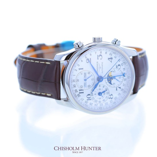 The Longines master collection perfectly illustrates Longines' commitment to creating exceptional timepieces. This corporate ethos has driven this collection to success from its launch in 2005. These models, all fitted with self winding movements are a favourite for those who appreciate elegance and excellence in watchmaking. This master collection mens model features a round stainless steel case measuring 40mm, allowing for a wide silver dial with "barleycorn" decoration, painted Arabic numbers and blued steel hands. Complications on the dial include a small seconds with 24 hours indicator at 9 o'clock, a moon phase display at 6o'clock, and the date is indicated by the half moon central hand. Further watchmaking expertise is reflected in the chronograph functions which include a central 60 seconds hand, a moon phase display with 12 hours counter at 6 o'clock and a 30 minutes counter with day and month display at 12 o'clock. The case sits on an elegant brown alligator strap with triple safety folding clasp and push-piece opening mechanism. scratch resistant sapphire crystal covers the dial as well as the transparent case back which allows for a view of the L687 self-winding mechanical movement which provides an amazing 54 hours power reserve. This extraordinary timepiece is also water resistant to 30 meters, and is presented with a 2-year international warranty and Longines packaging.
