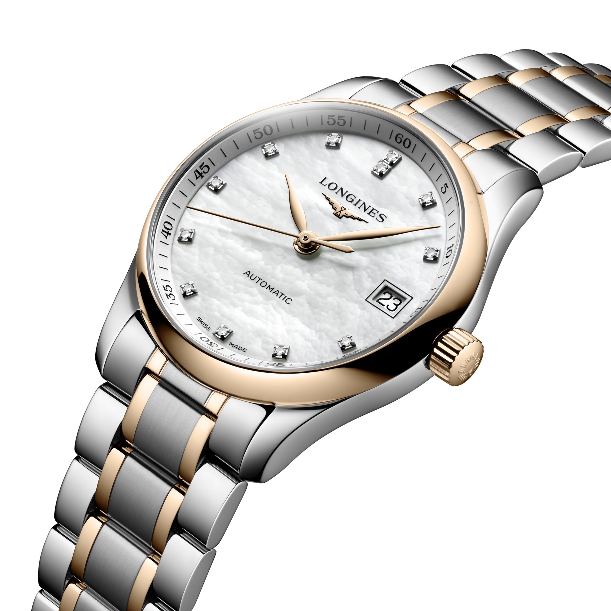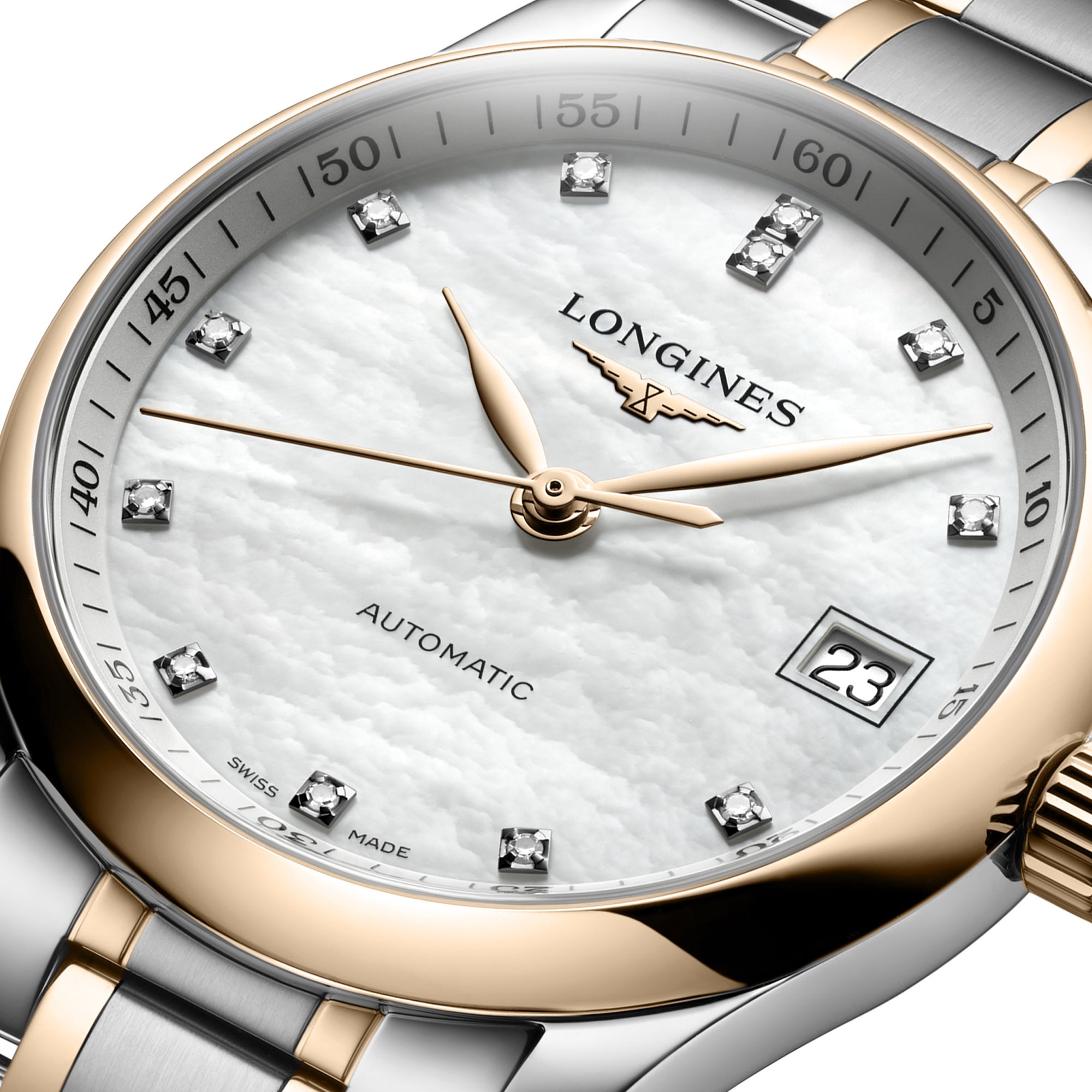 Illustrating the brands ethos, this Longines Master Collection 34mm Mother of Pearl Ladies Watch L23575897 showcases traditional watchmaking and exceptional design details. Designed with a mesmerising mother of pearl dial and a date window displayed at 3 o'clock, this timepiece creates a captivating essence that will complement your luxurious style. Scratch-resistant sapphire crystal glass with anti-reflective coating protects the elegant mother of pearl dial, adorned with diamond hour markers and pink tone hands. Dial set with 12 Top Wesselton VS-SI diamonds, for a total of 0.055 carats. Presented on a stainless steel and 18ct pink gold bracelet, finished with triple safety folding clasp with push-piece opening mechanism and water resistance up to 30 metres. Reliably powered by an automatic self-winding mechanical movement beating at 25'200 vibrations per hour, with a power reserve up to 72 hours and Calibre L888. Discover the Longines Master collection at Chisholm Hunter today and embrace this beautiful timepiece, perfect for those who appreciate timeless style and exceptional timepieces.