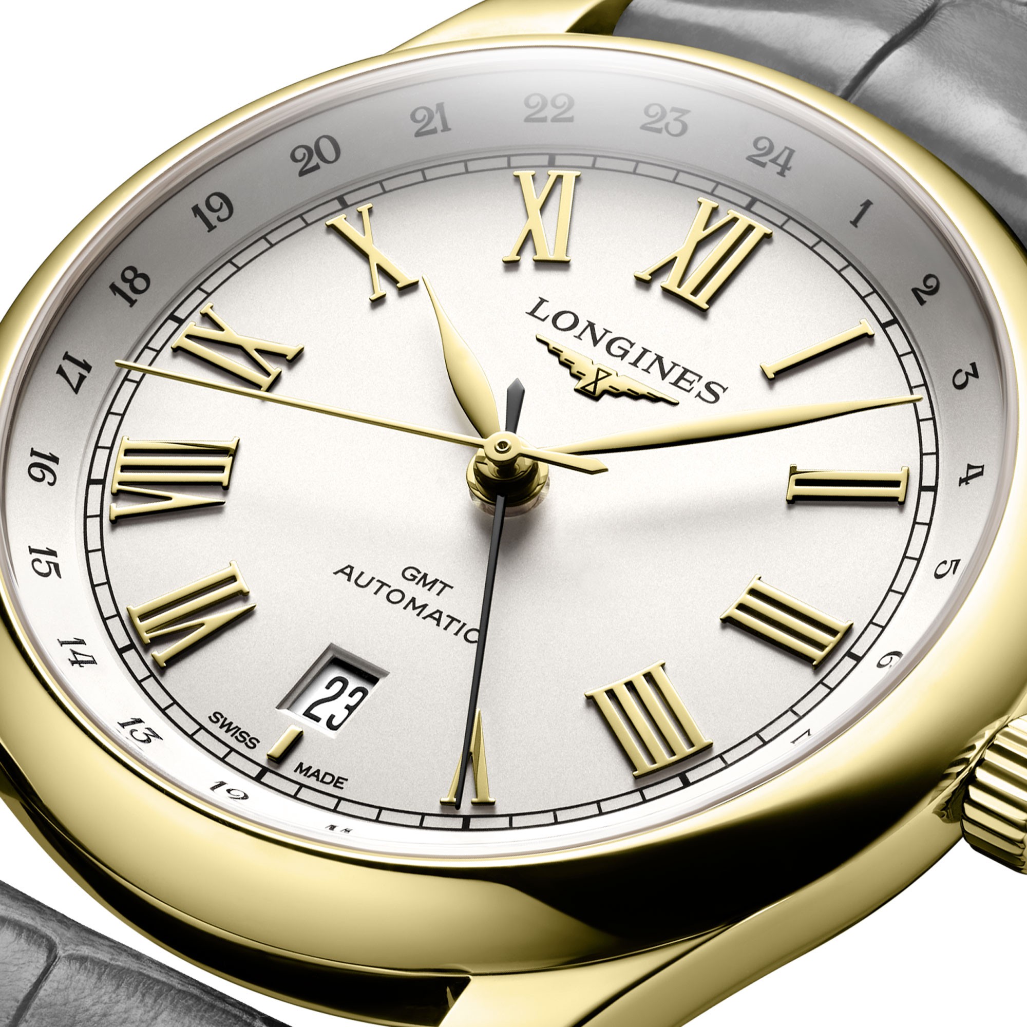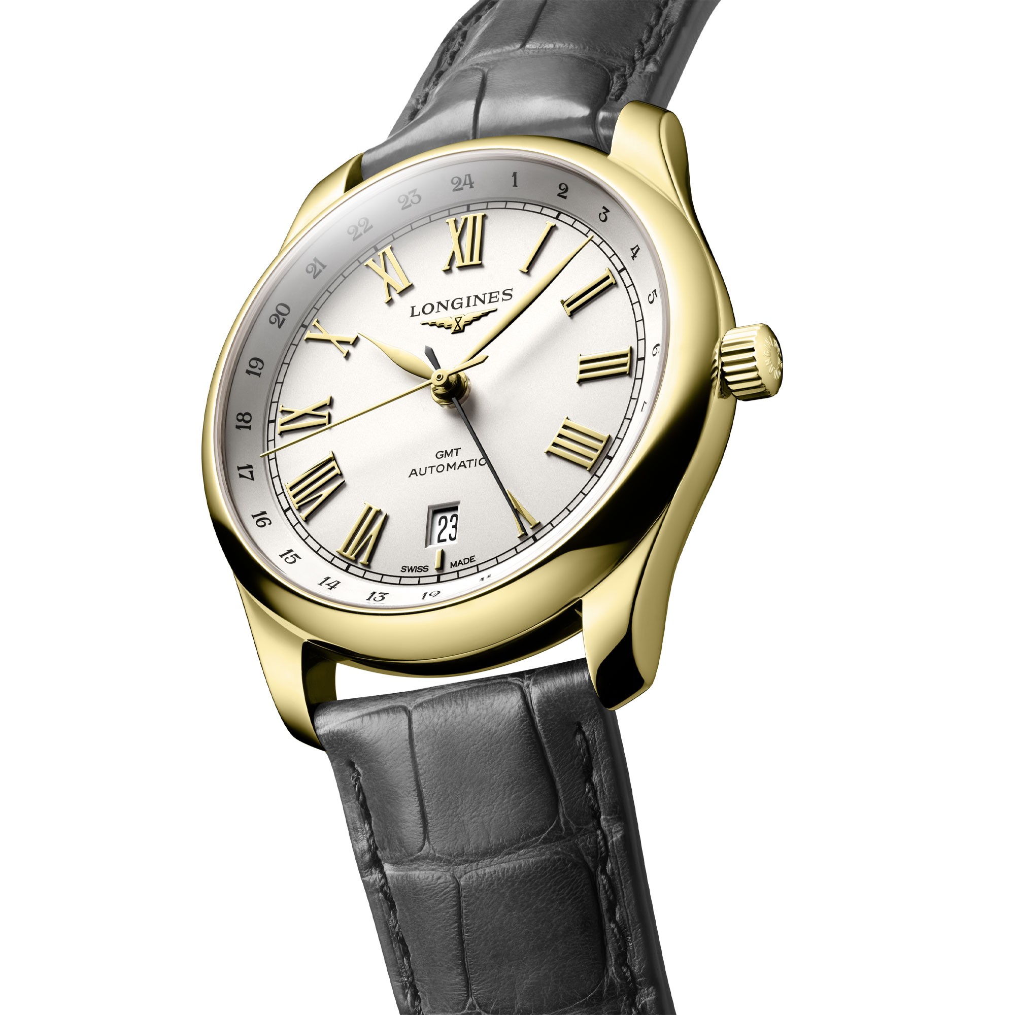 The frosted silver dial features a 24-hour scale in transferred Arabic numerals, a railroad minute track, eleven applied gold Roman numerals and the date aperture at 6 o'clock. Gold hands indicate the time, while the black GMT hand tones with the 24-hour scale numerals. This Longines Master Collection GMT model is worn on an anthracite grey leather strap fitted with a yellow-gold tongue buckle.